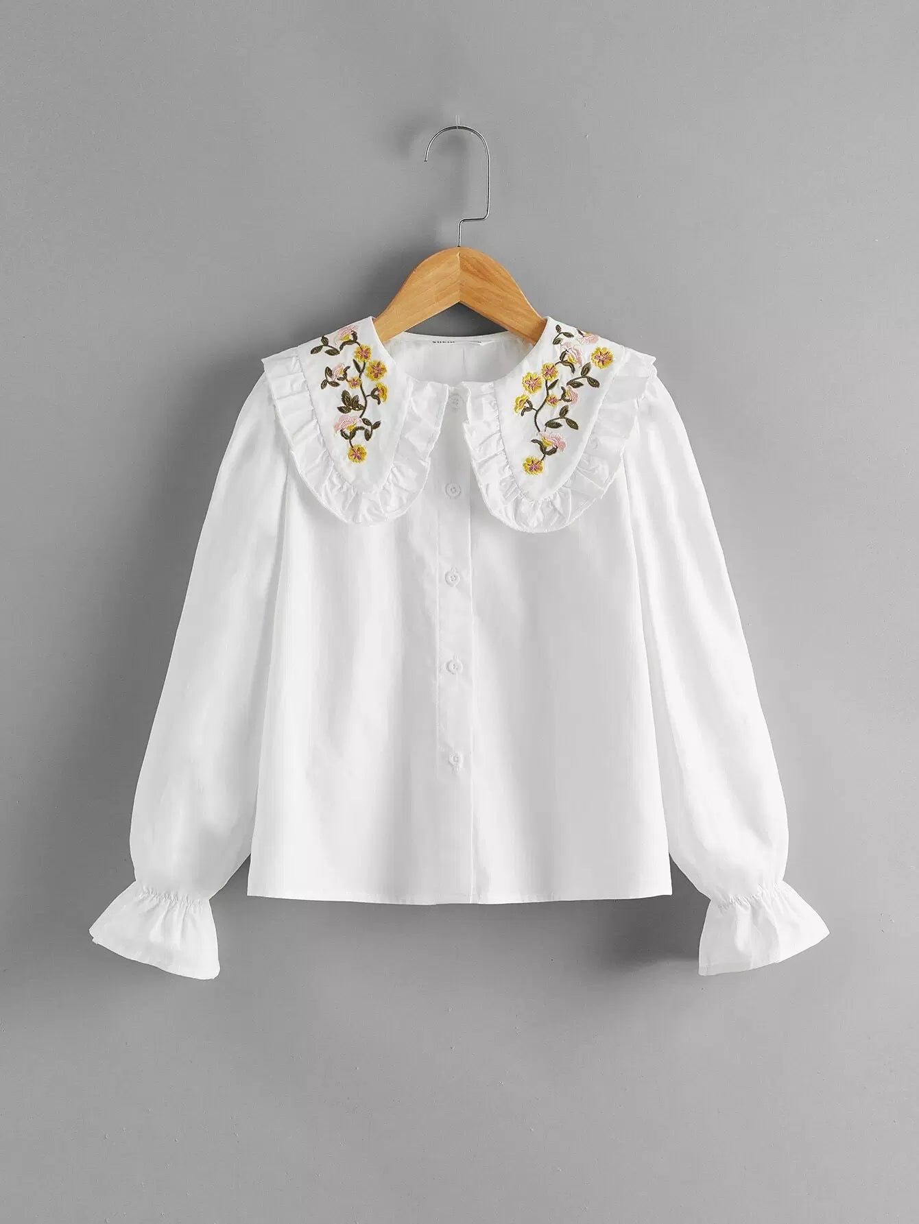 بلوزة بناتية ذات ياقة مطرزة ومزينة بكشكشة وأزرار أمامية