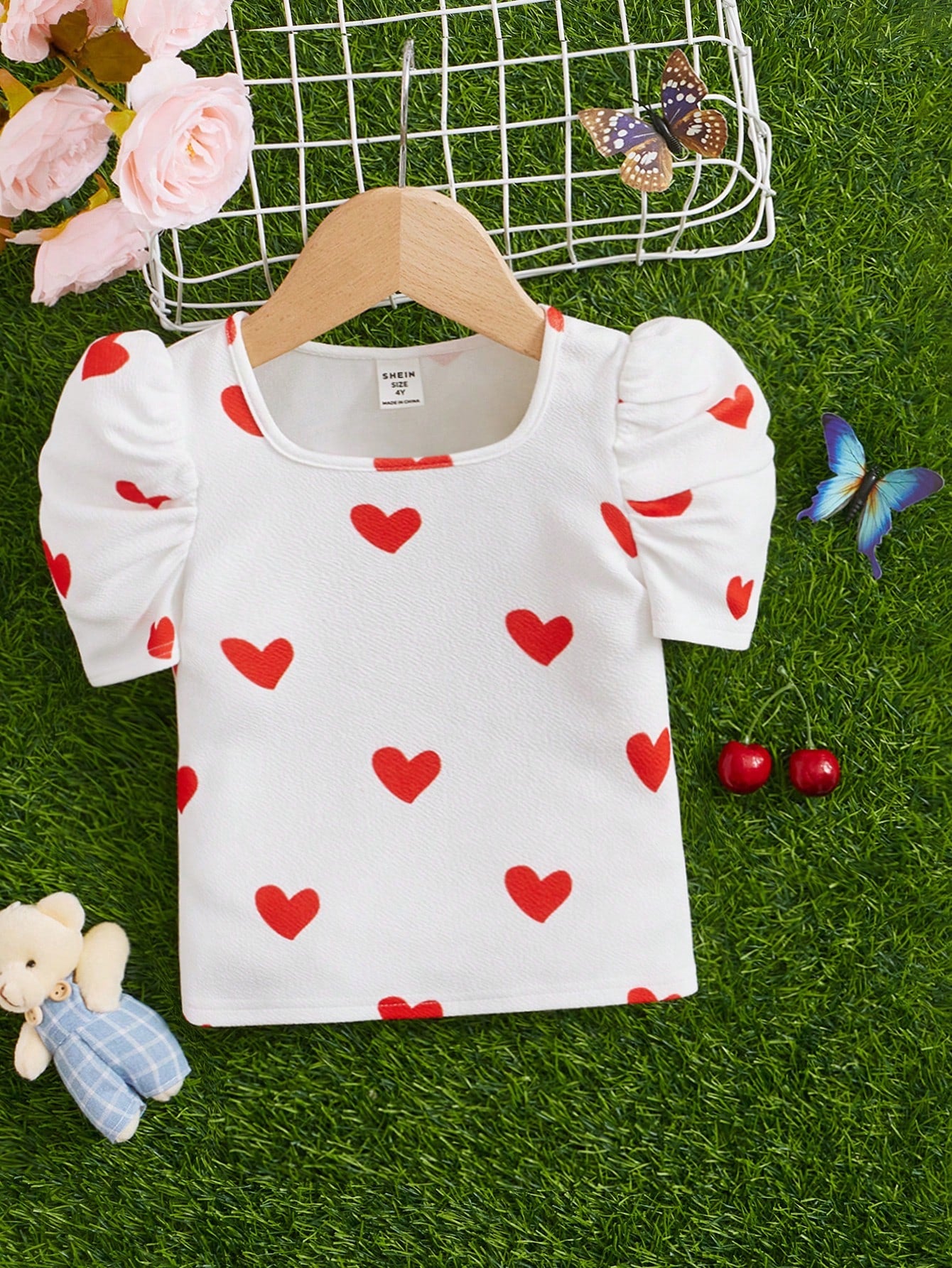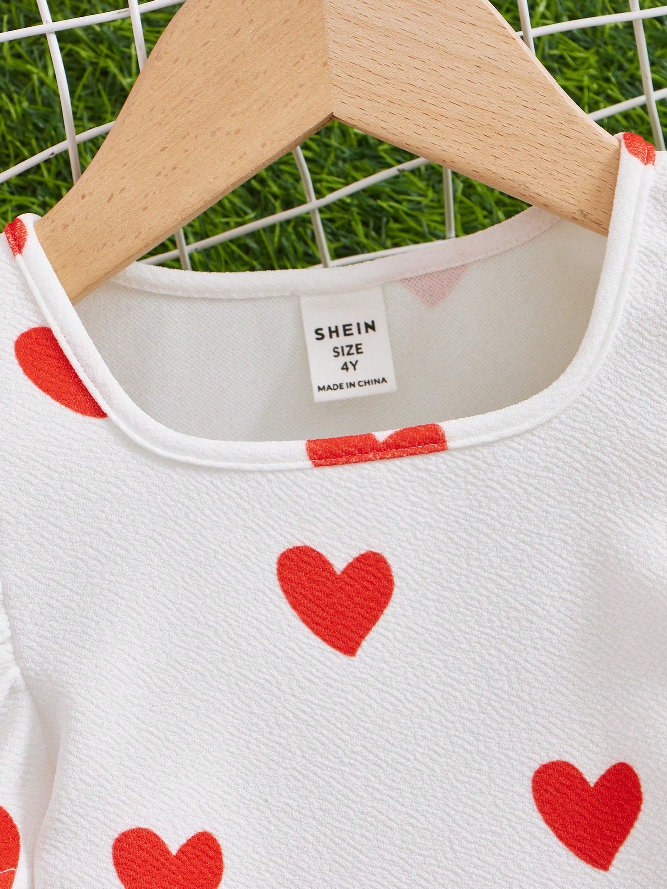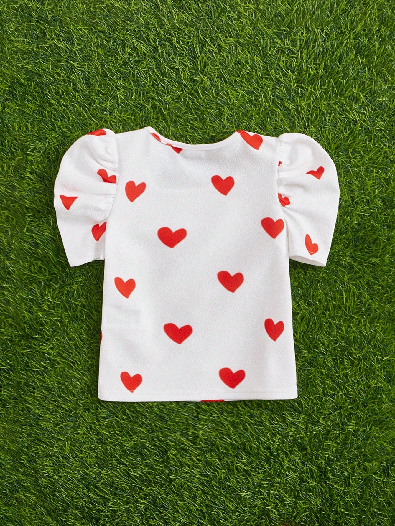 تيشيرت مريح محبوك بنمط قلوب، بياقة دائرية وأكمام راجلان، بتصميم عصري مناسب للفتيات الصغيرات.