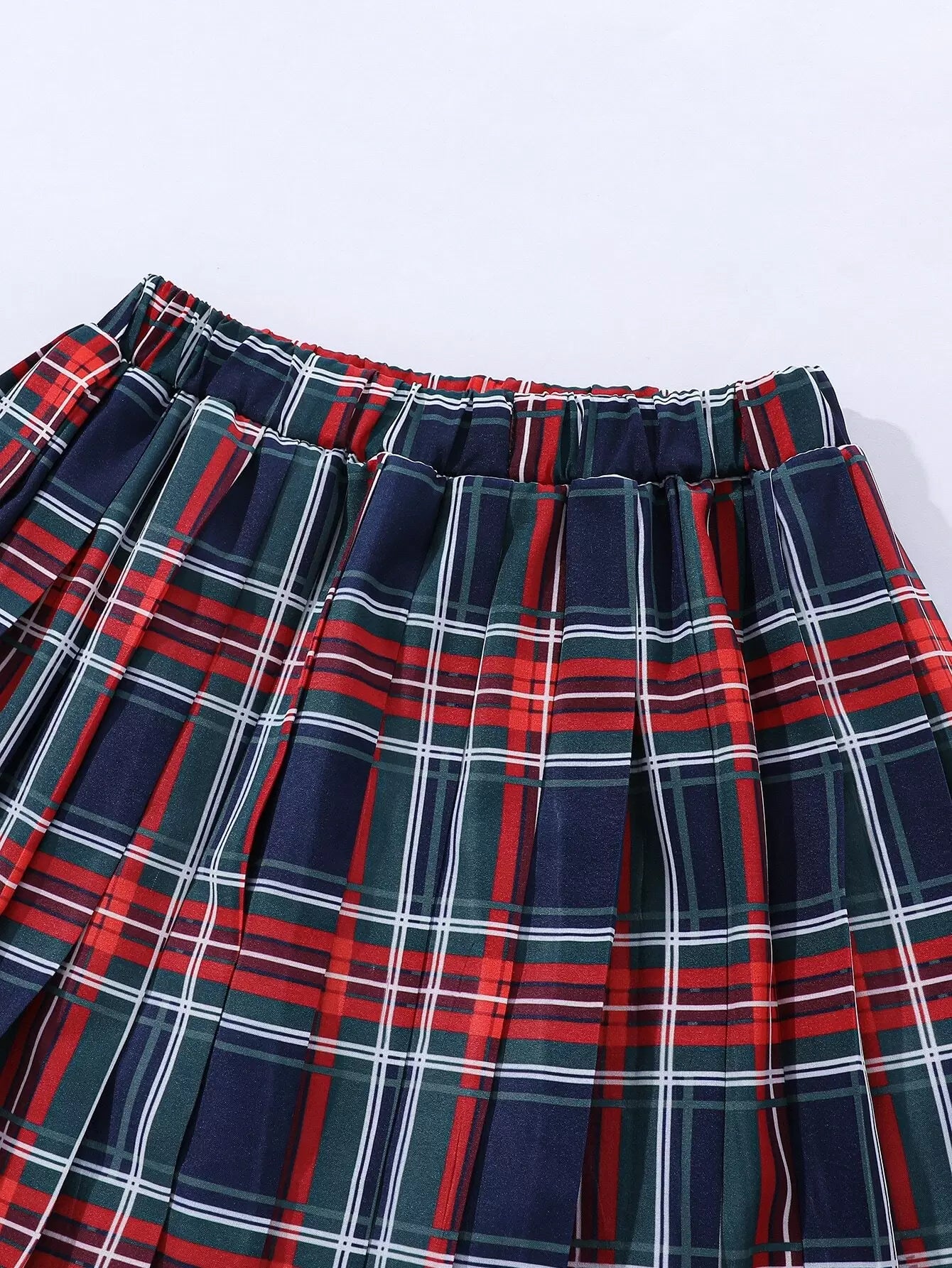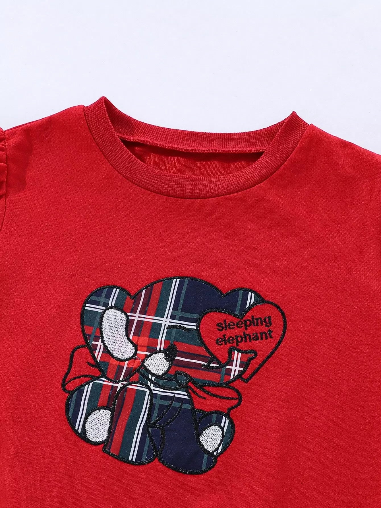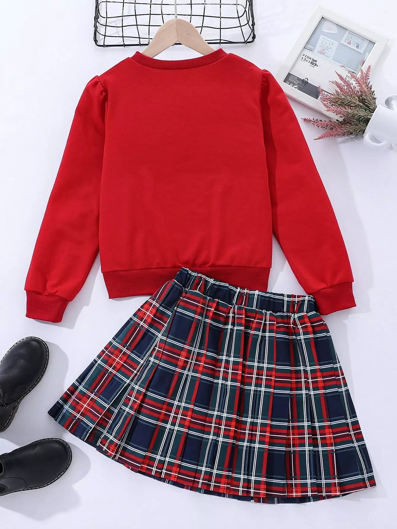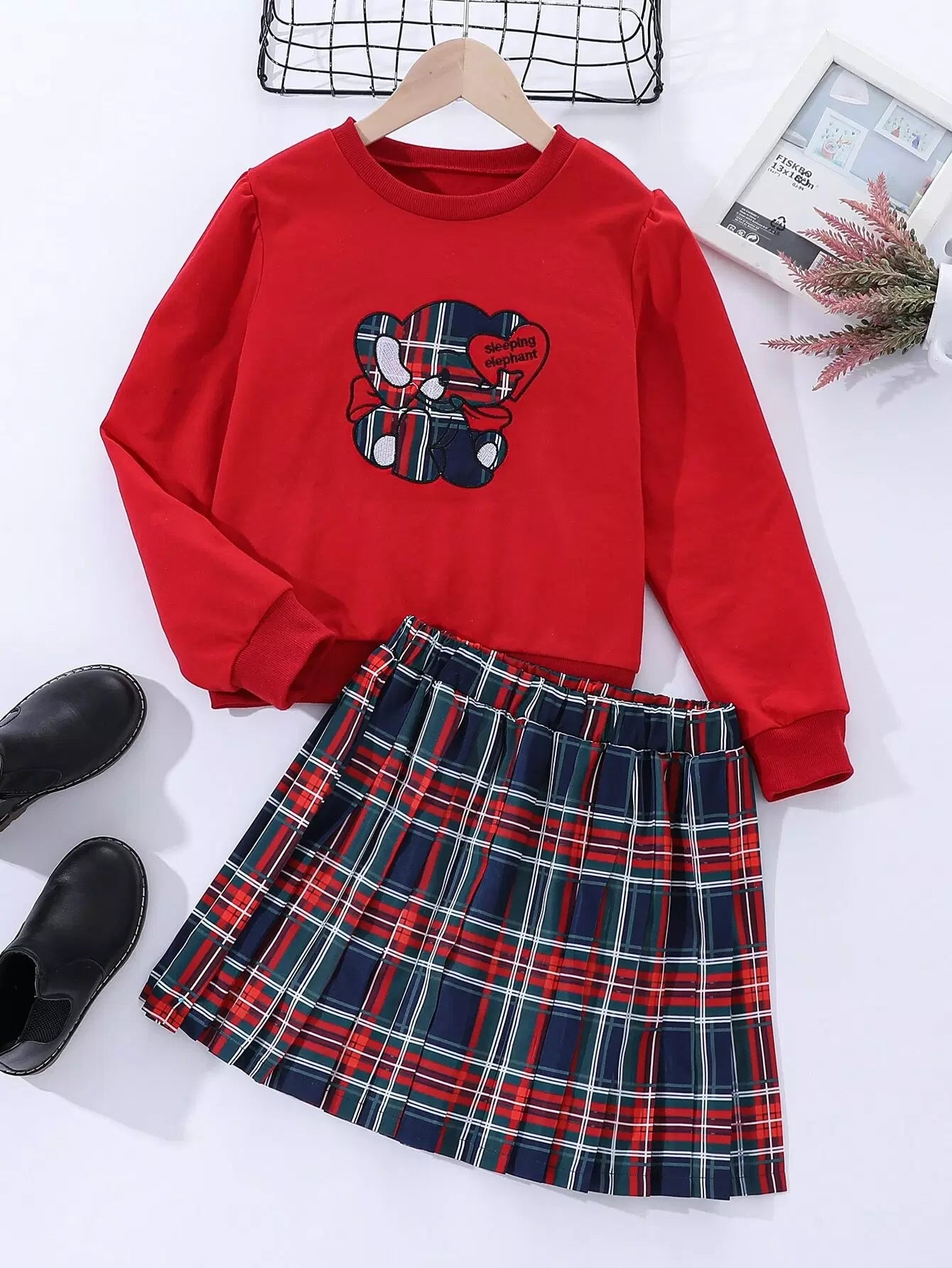 قميص بناتي سويت شيرت مطرز برسوم كرتونية وحروف وتنورة بطبعة ترتان مطوية
