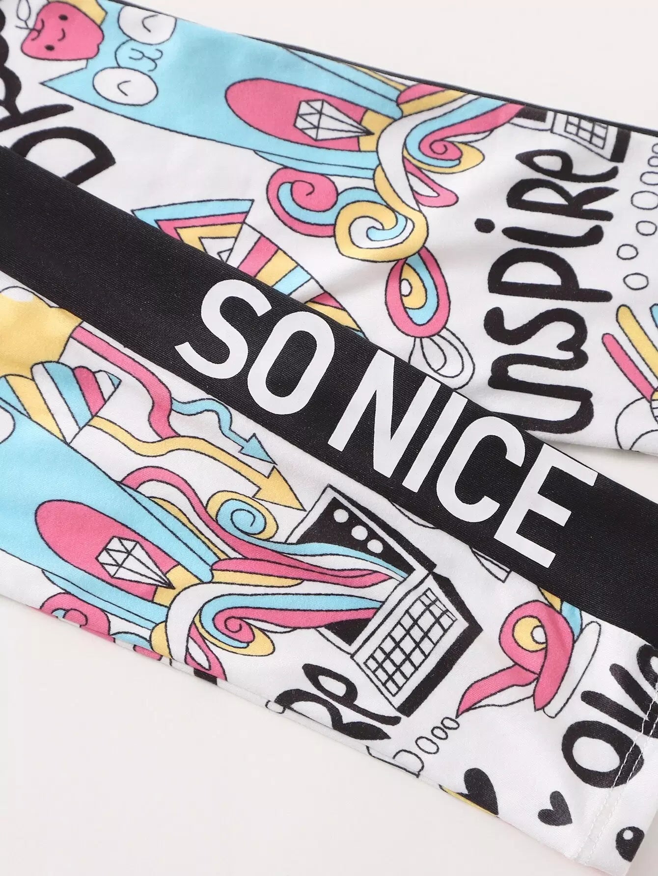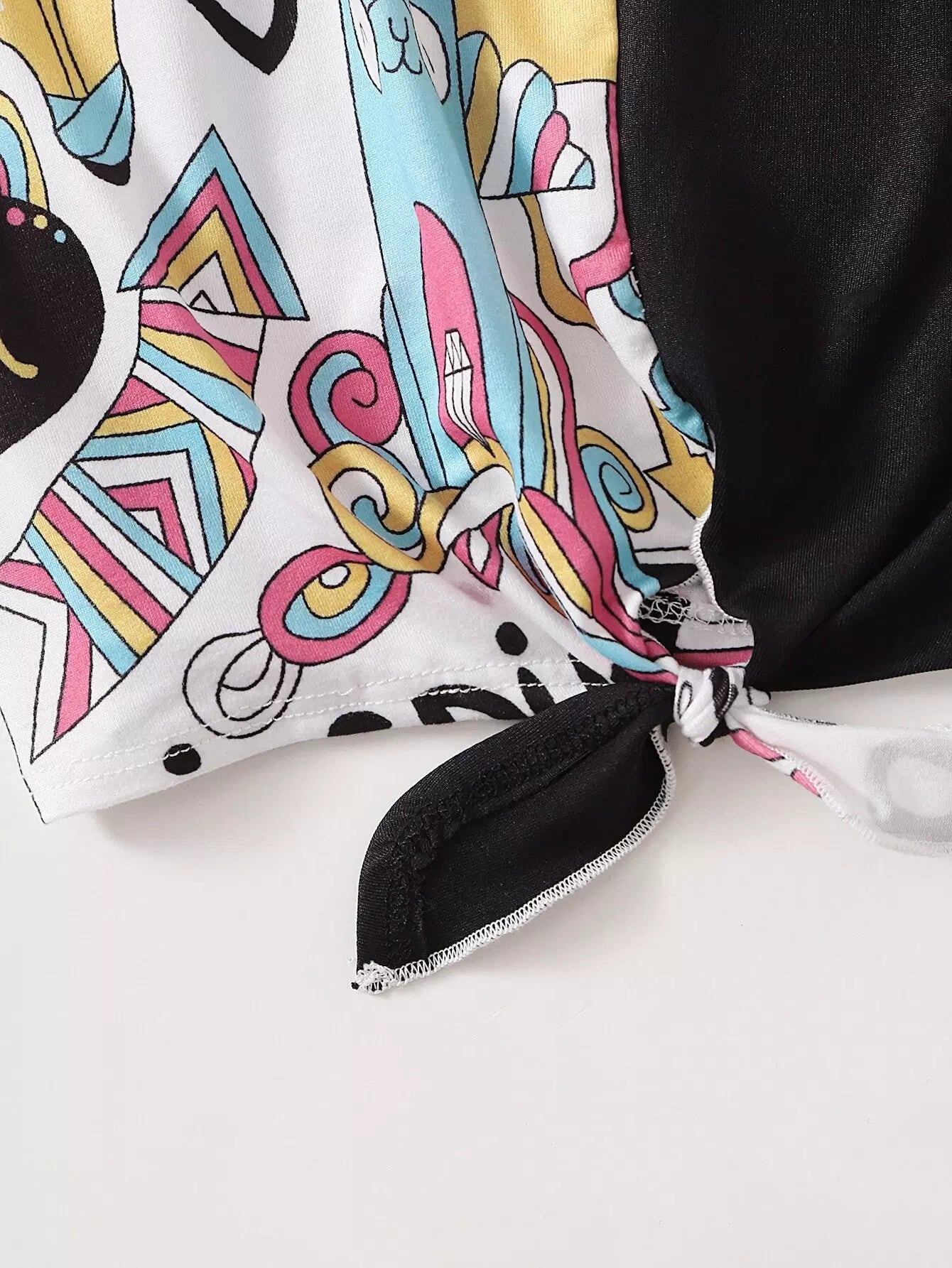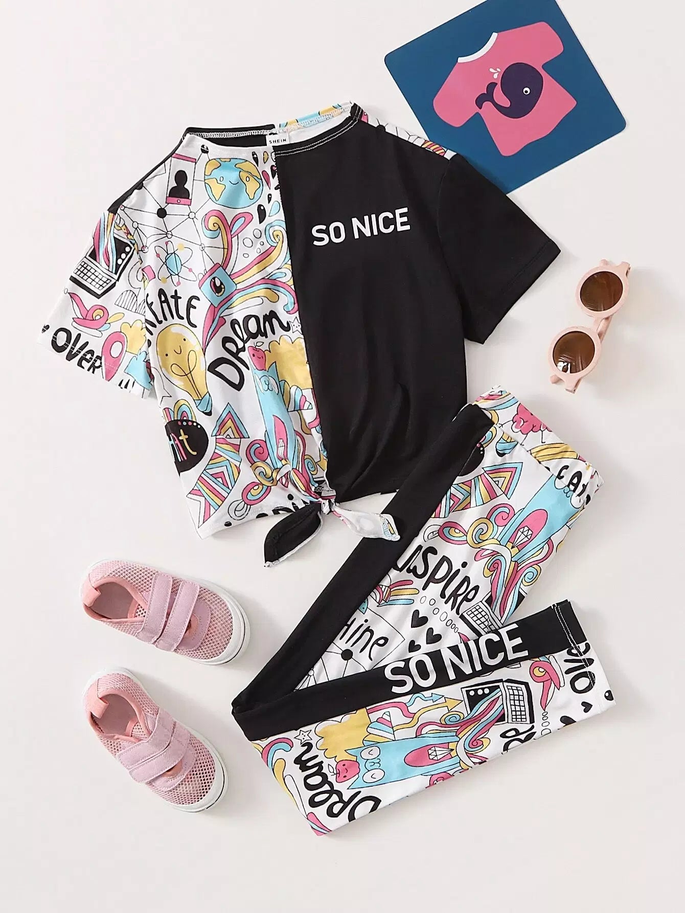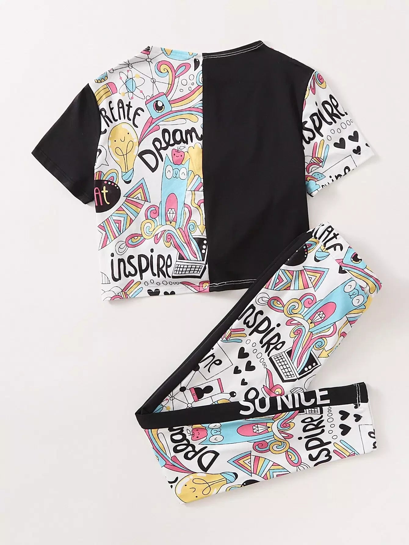 طقم بناتي من بلوزة وبنطلون ضيق بحاشية مزخرفة برسومات كرتونية وأحرف