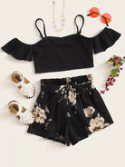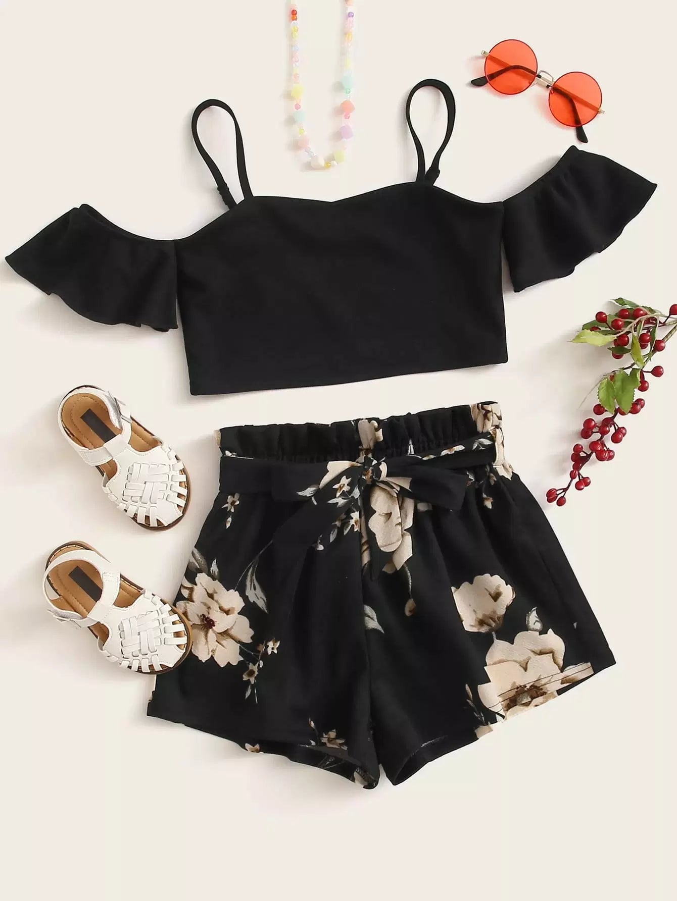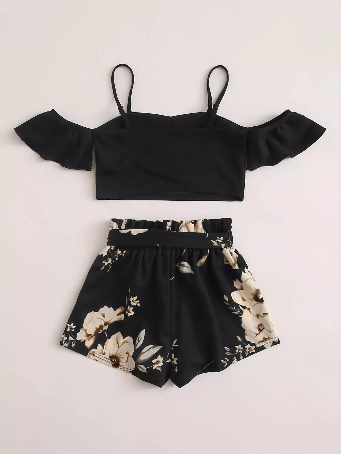 الأطفال - طقم شورت بحزام وأكتاف مكشوفة للفتيات مع طباعة زهور