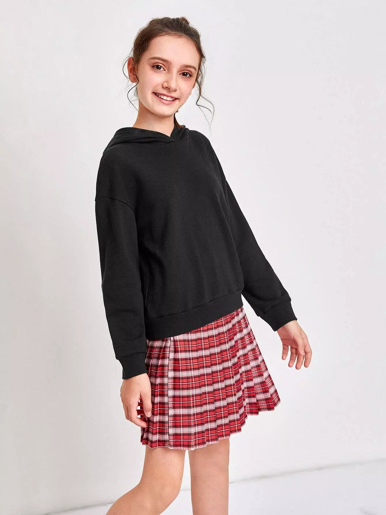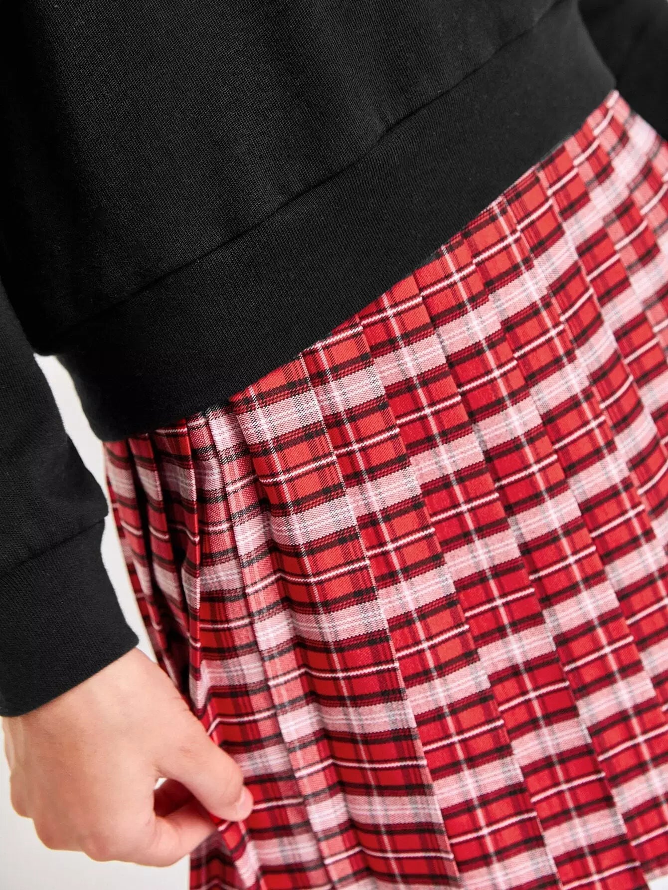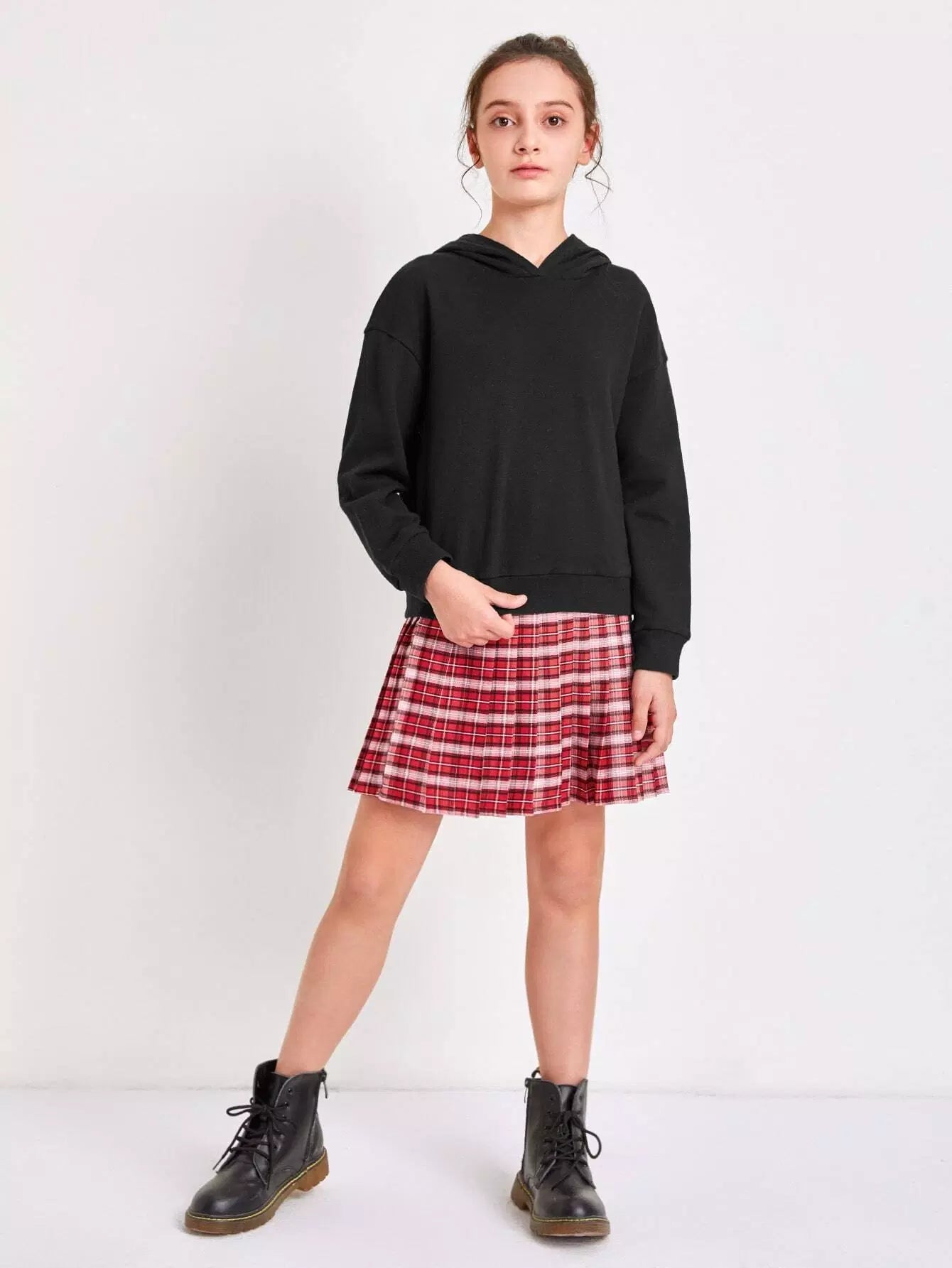 طقم هودي بكتف منسدل وتنورة منقوشة بنقشة التارتان للبنات