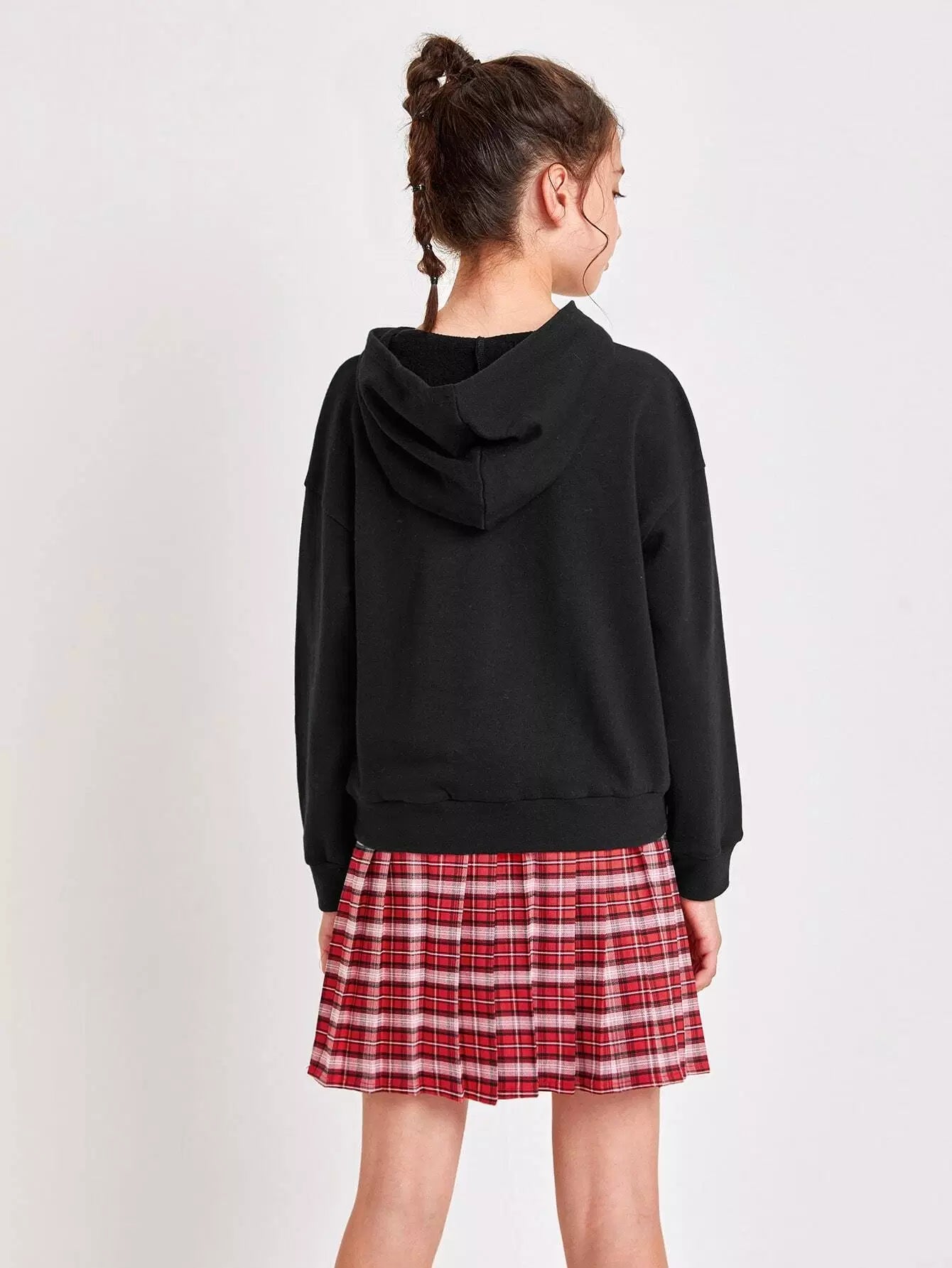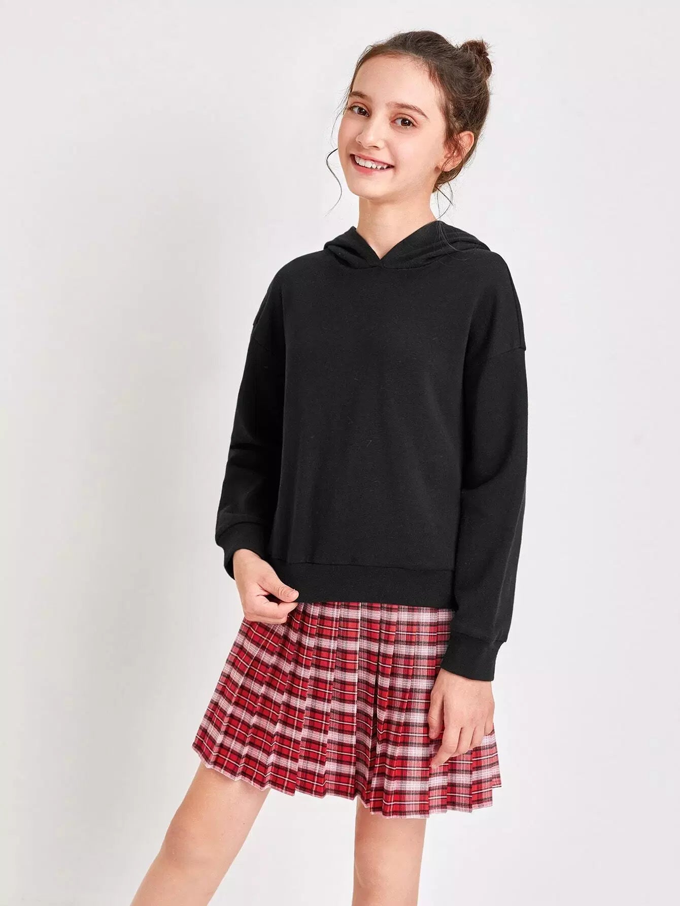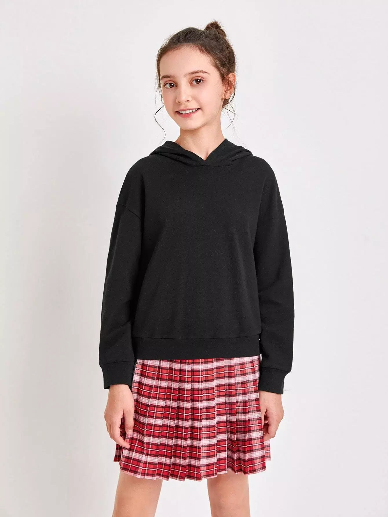 طقم هودي بكتف منسدل وتنورة منقوشة بنقشة التارتان للبنات