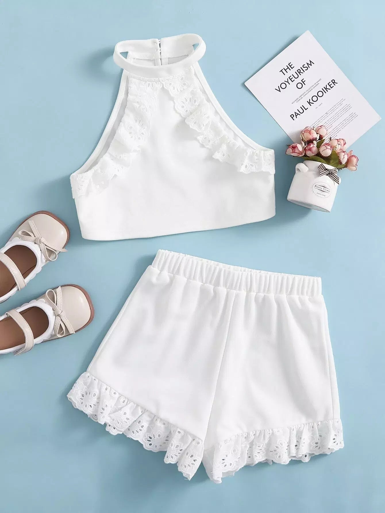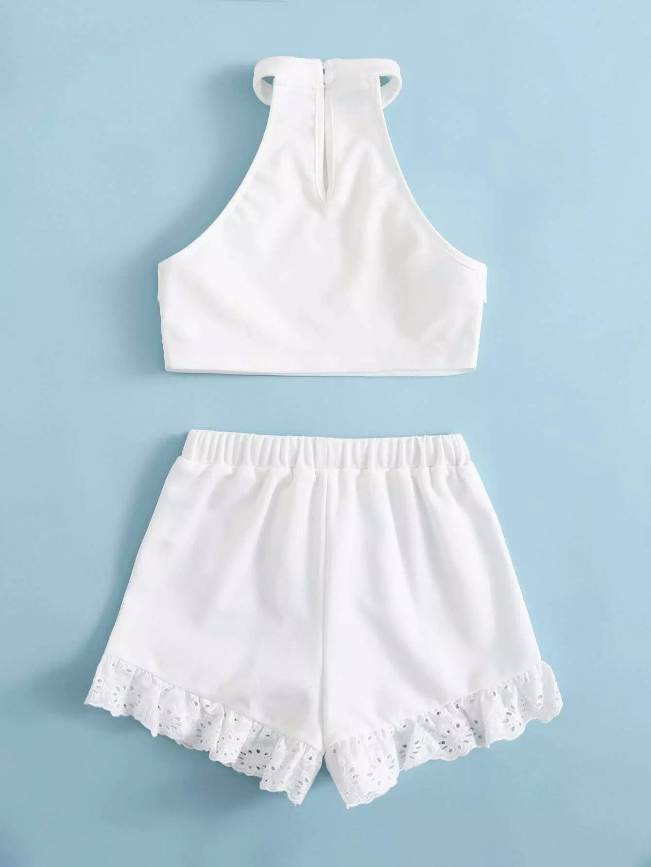 طقم شورت وقميص قصير مطرز بفتحات للبنات