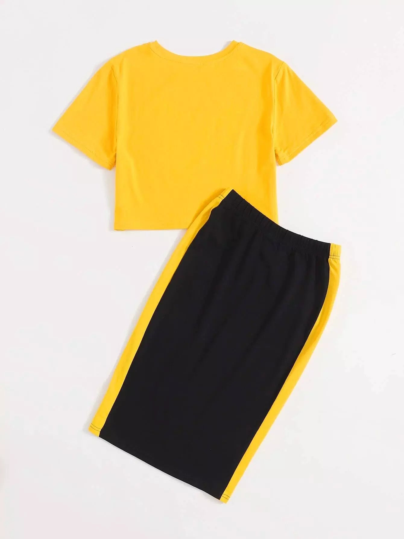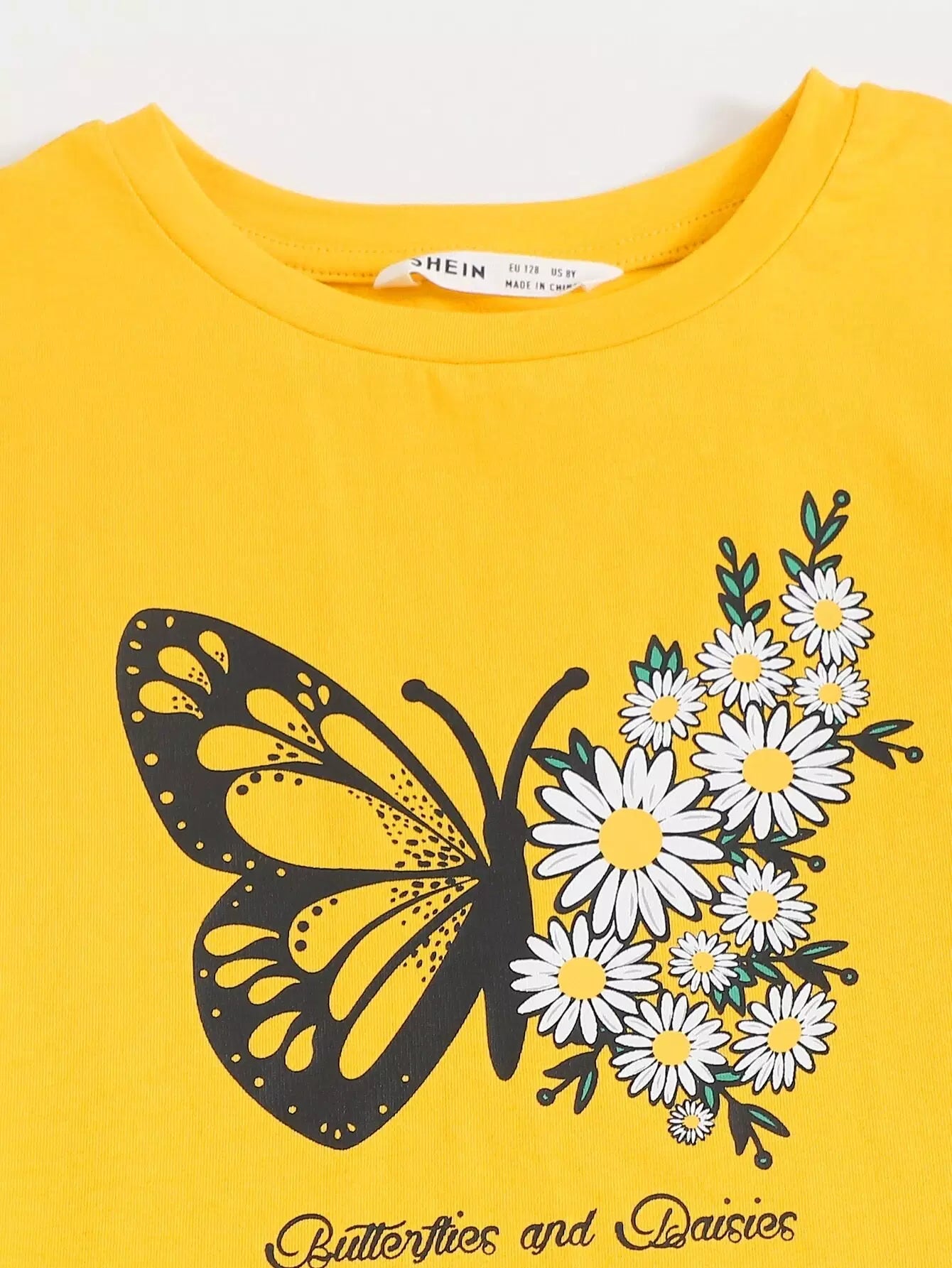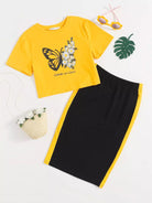 طقم تنورة وقميص بطبعات الأزهار والفراشات للبنات
