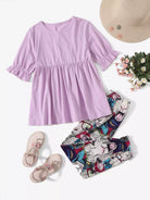 تي شيرت بأكمام منفوشة للبنات وبنطال مطبوع عليه زهور