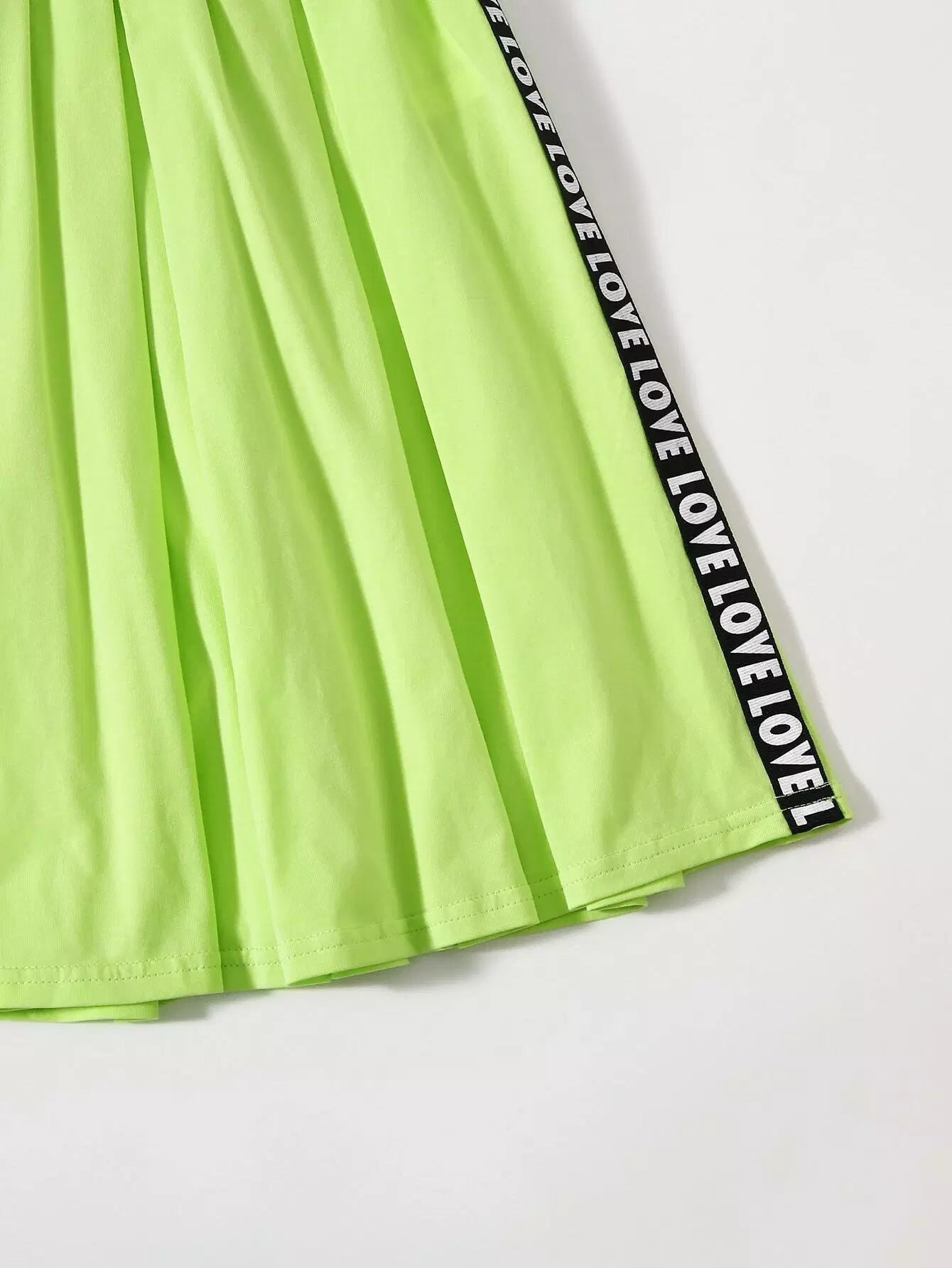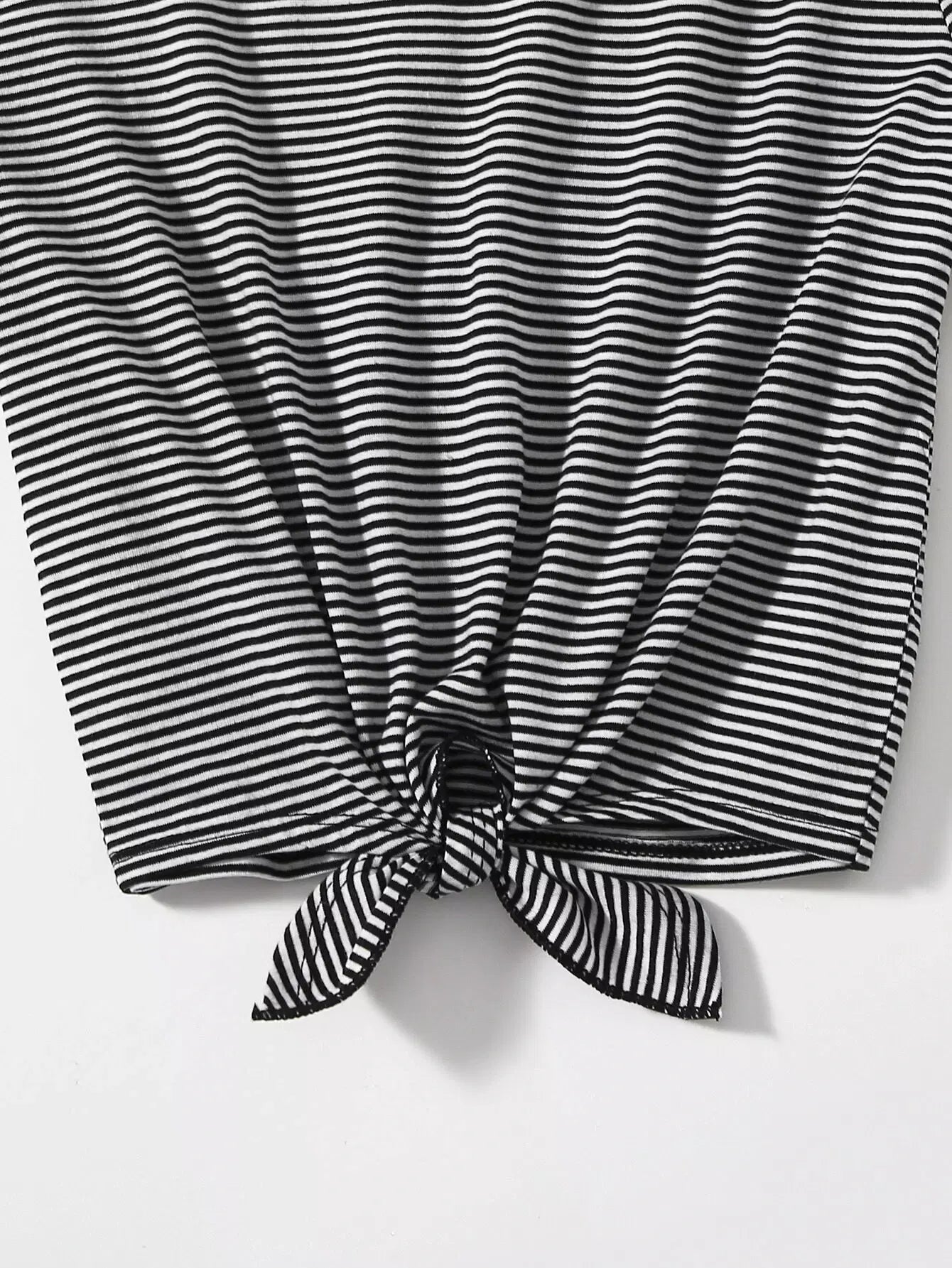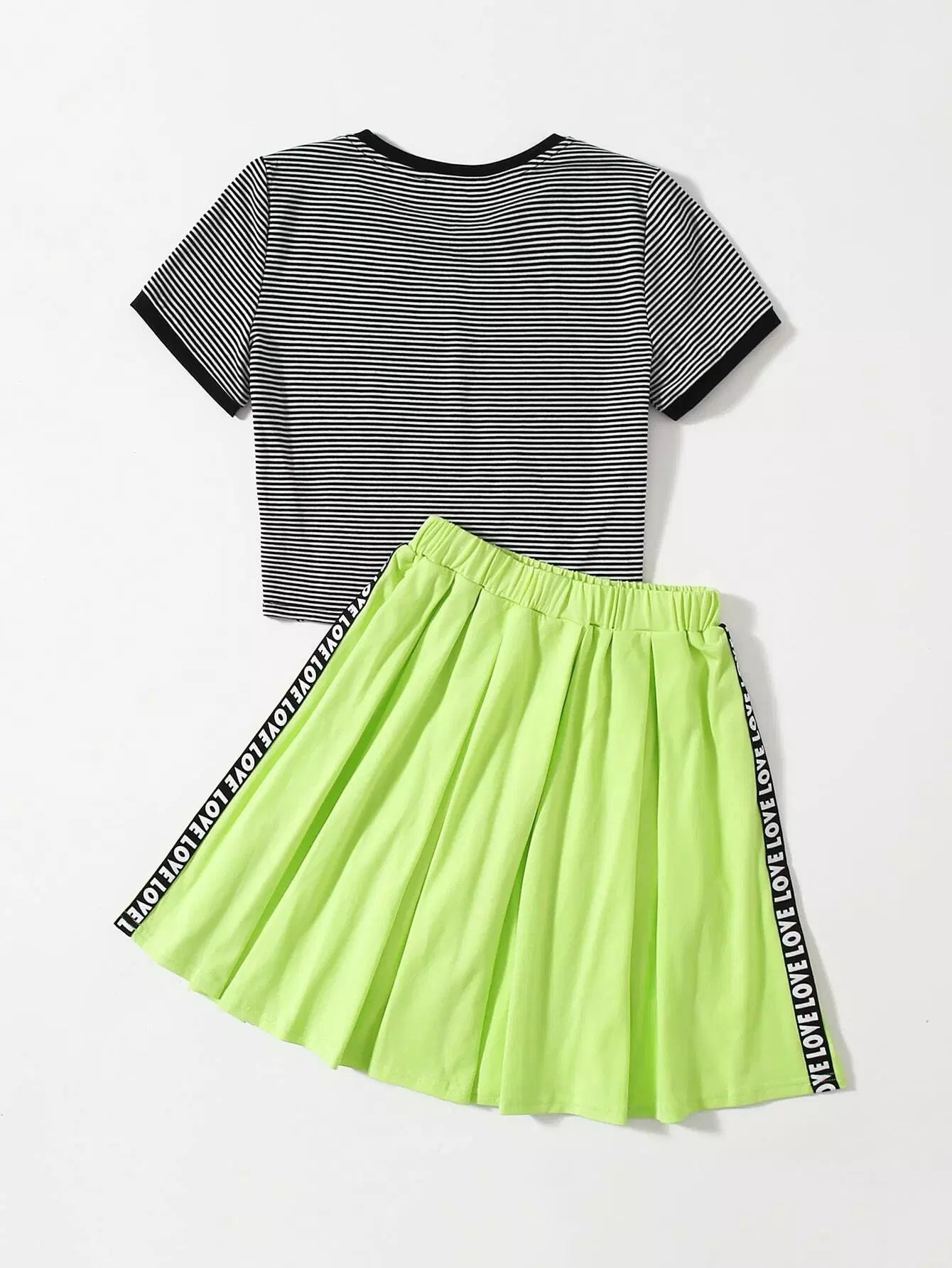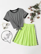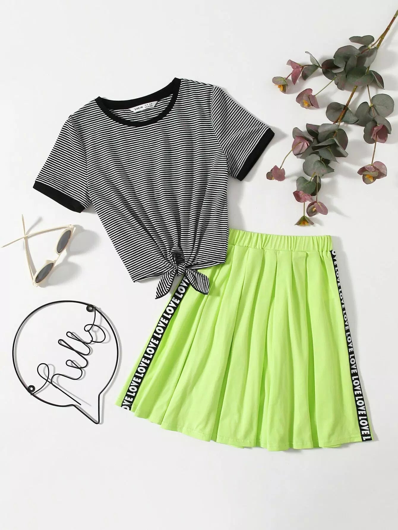 طقم بناتي من قميص مخطط بحاشية عقدة وتنورة بشريط حروف