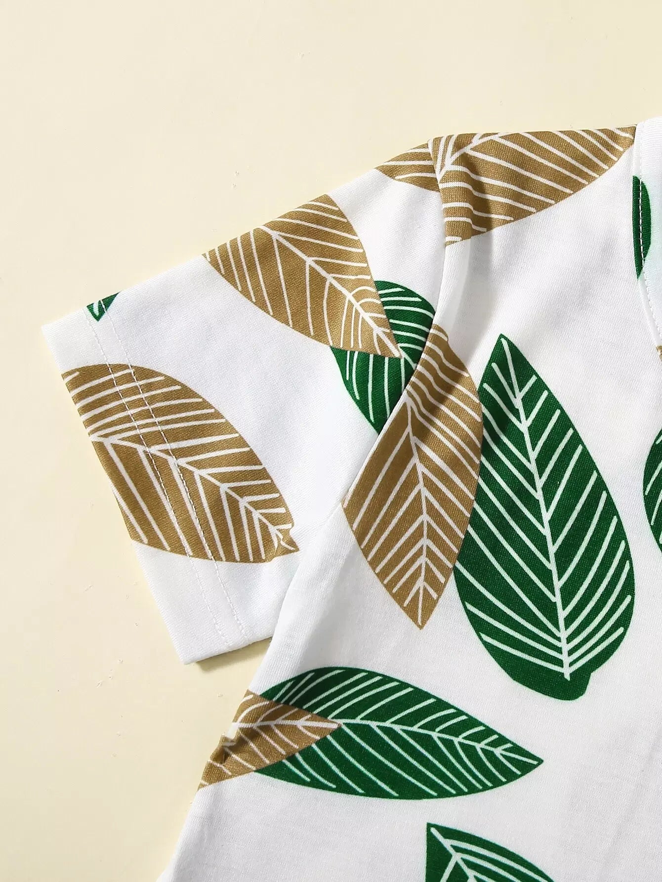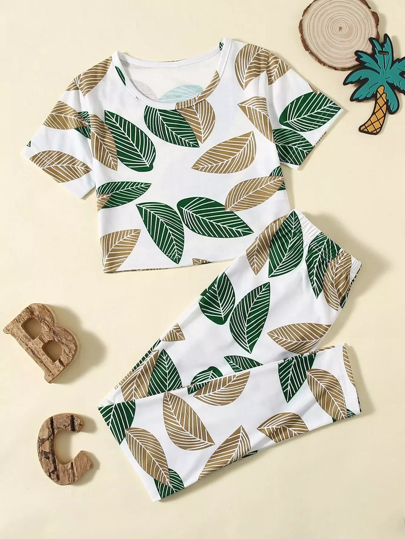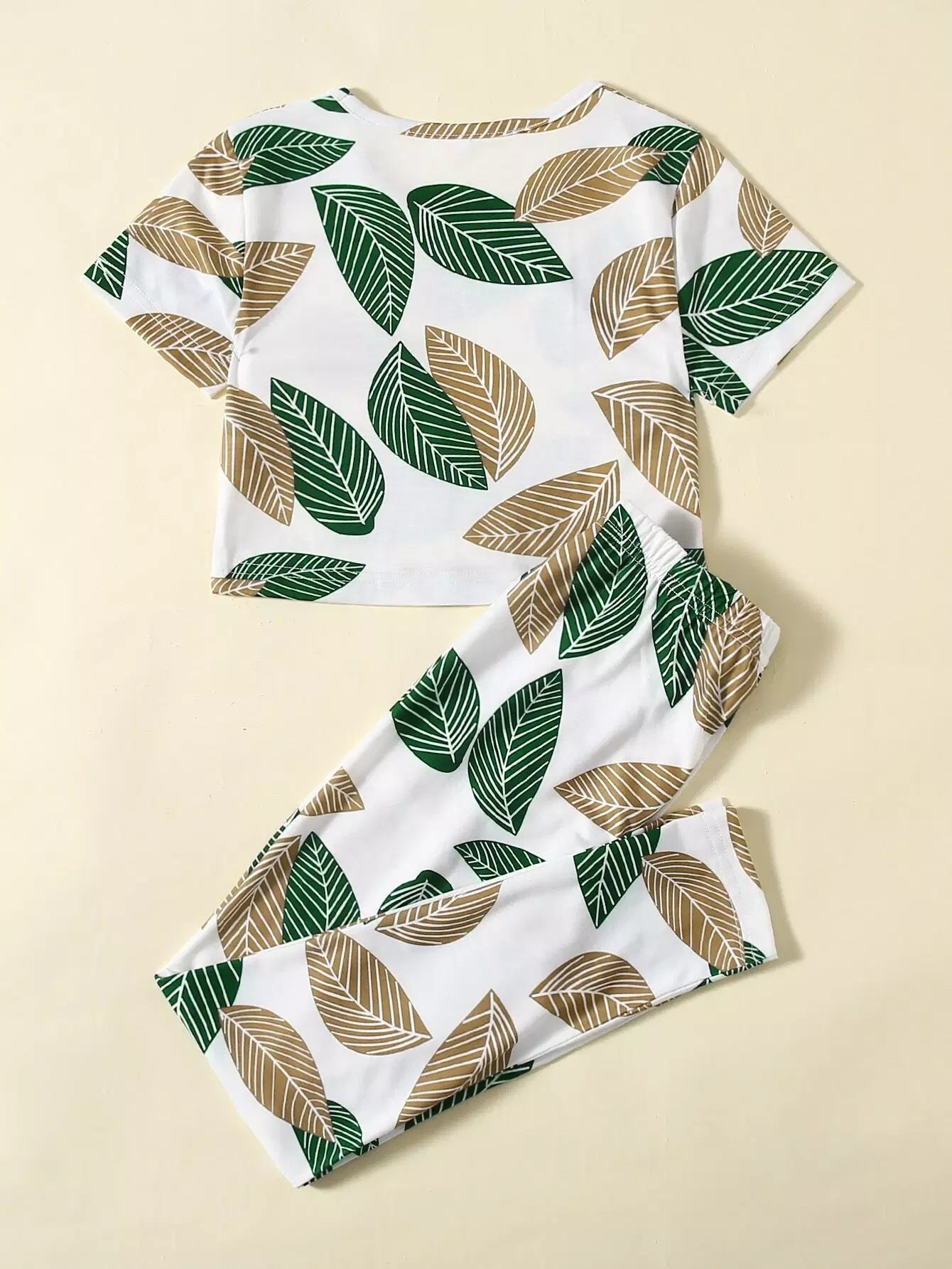 تي شيرت بطبعة أوراق الشجر وبنطال ضيق للبنات