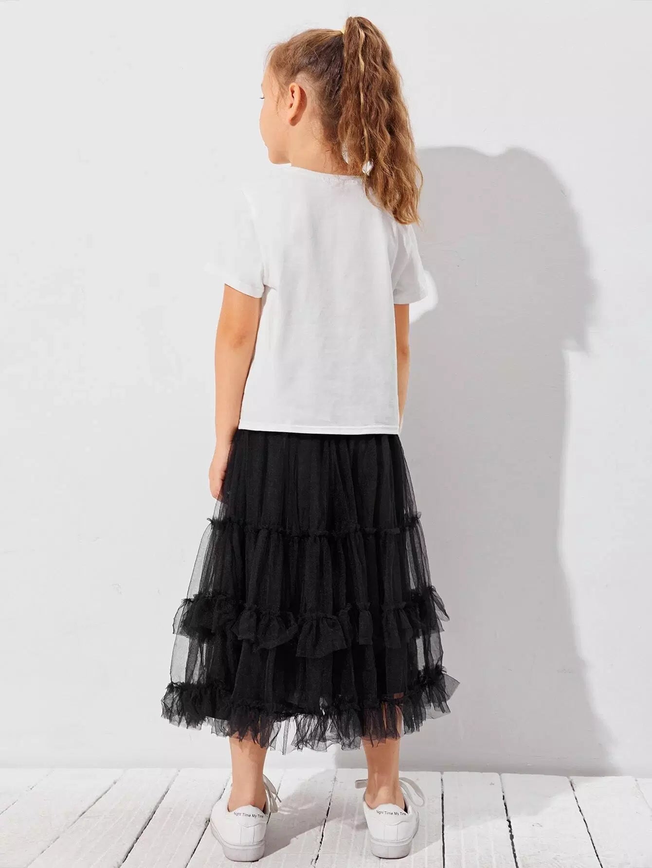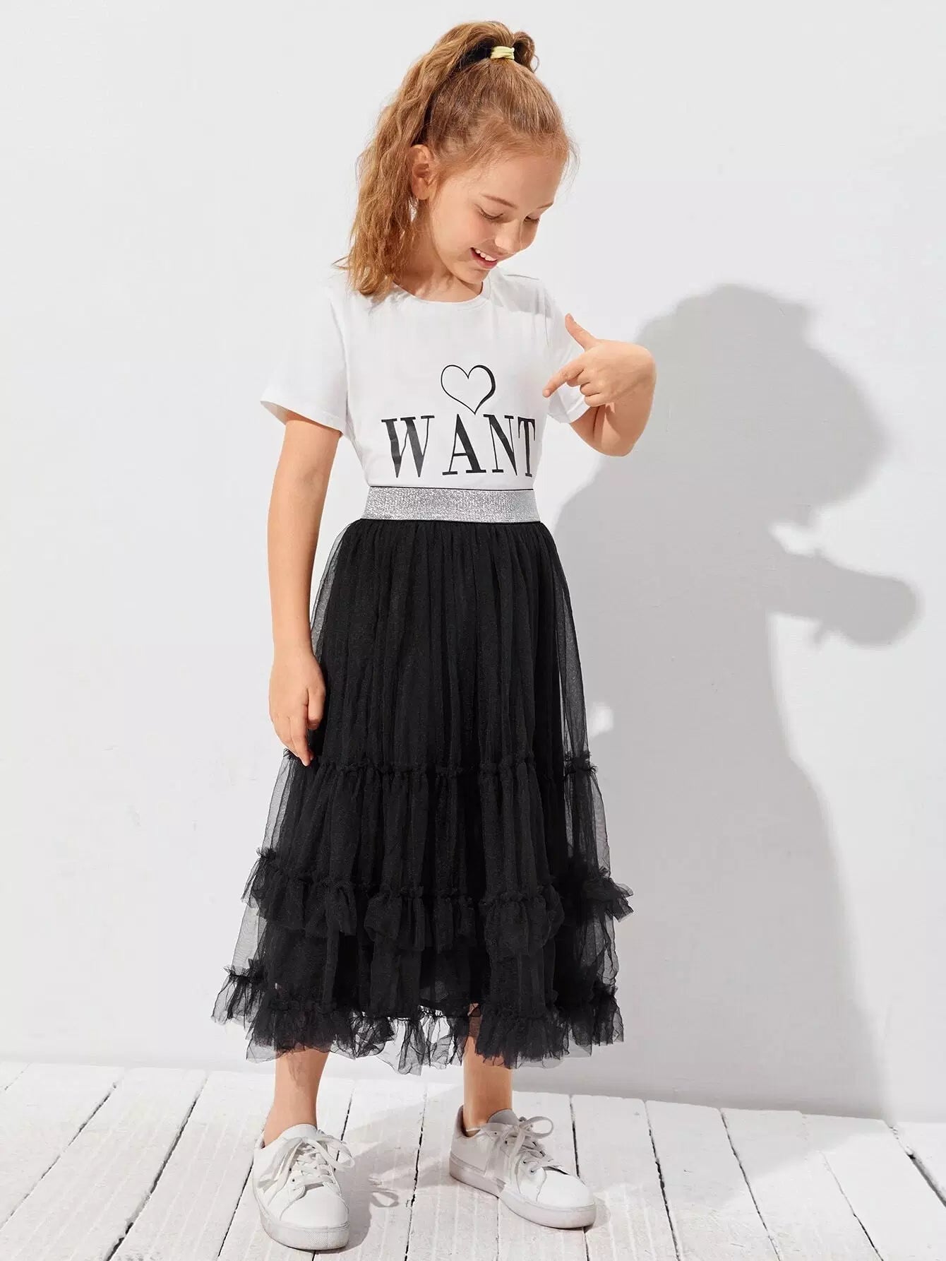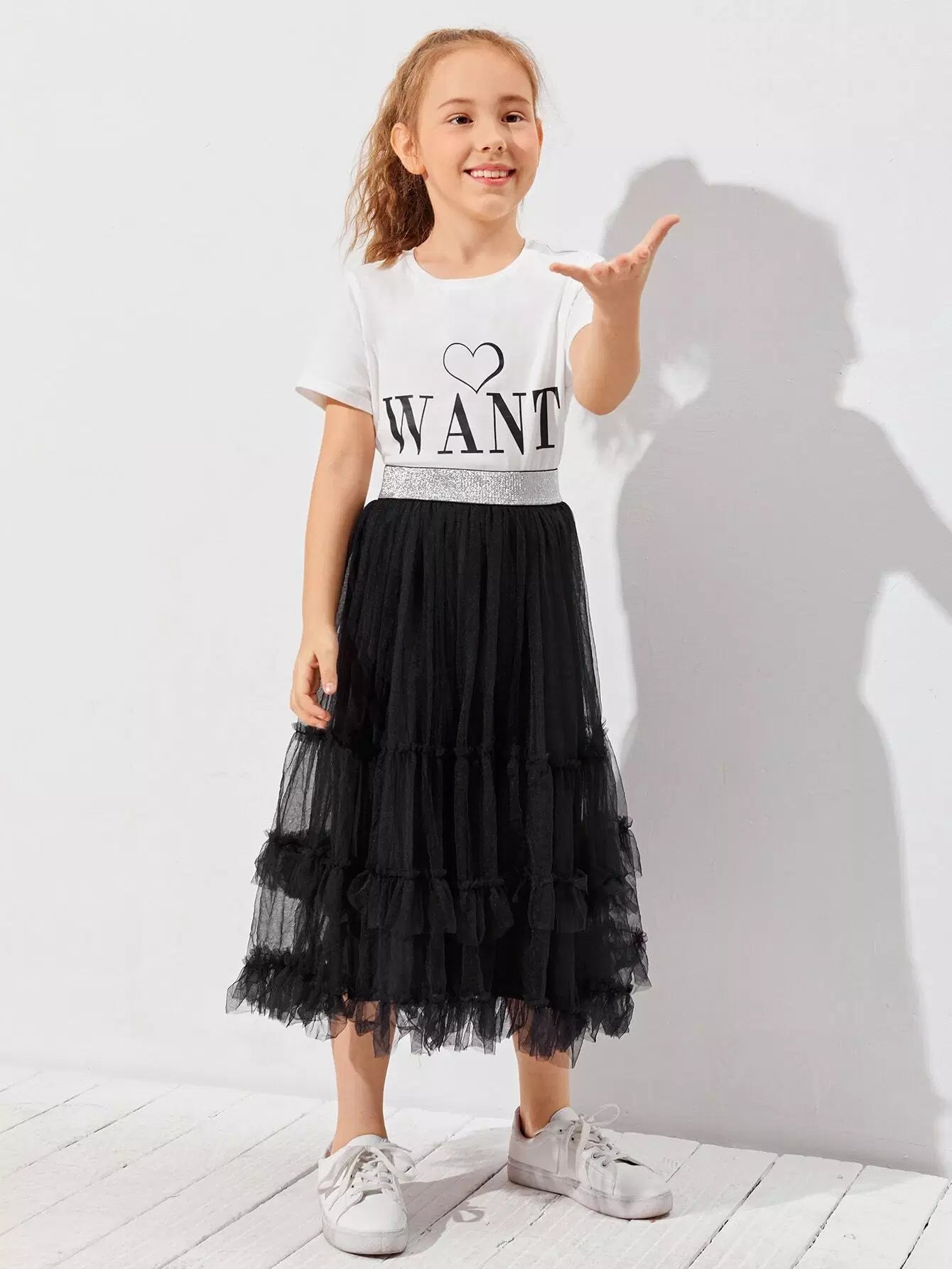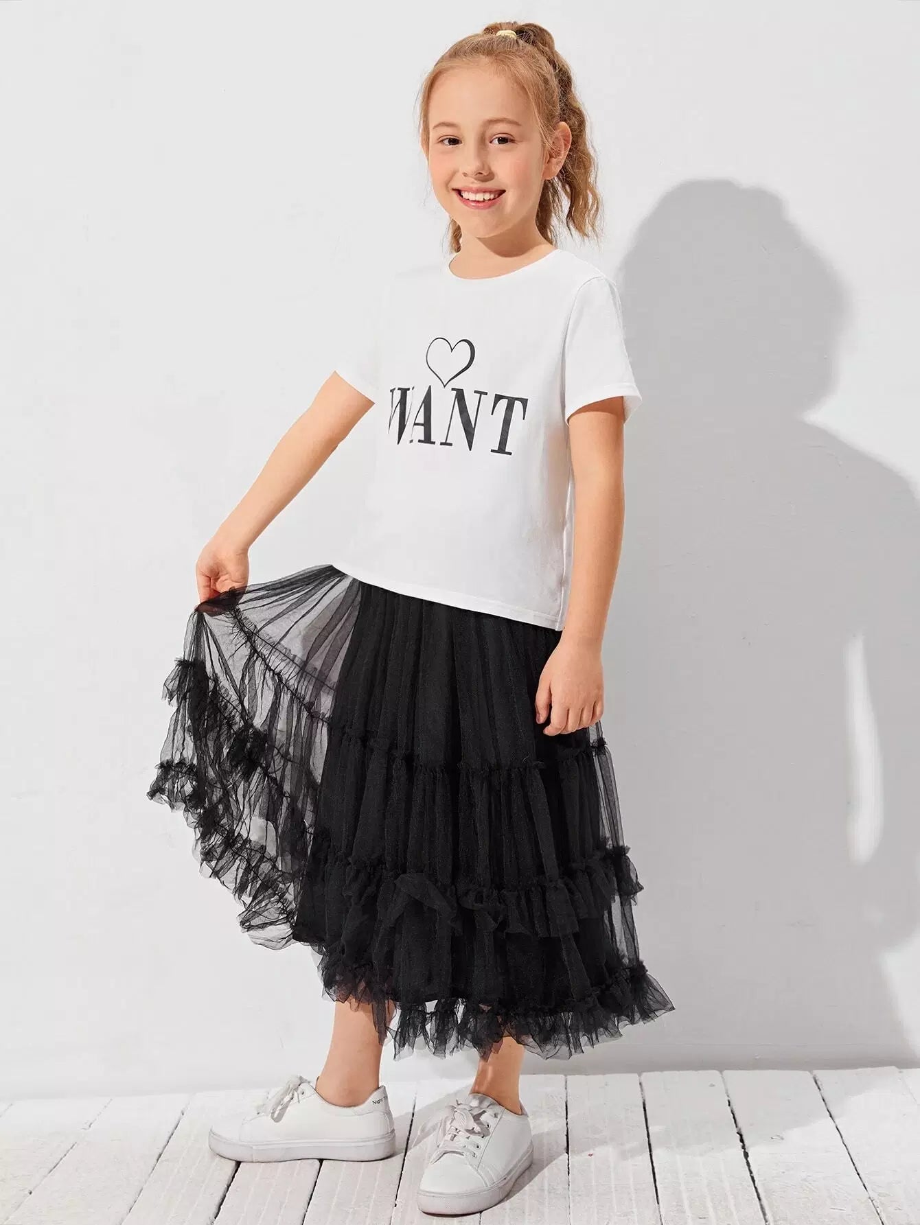 طقم بناتي مكون من بلوزة بطبعة حروف وقلوب وتنورة شبكية ذات طبقات وحواف مكشكشة