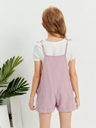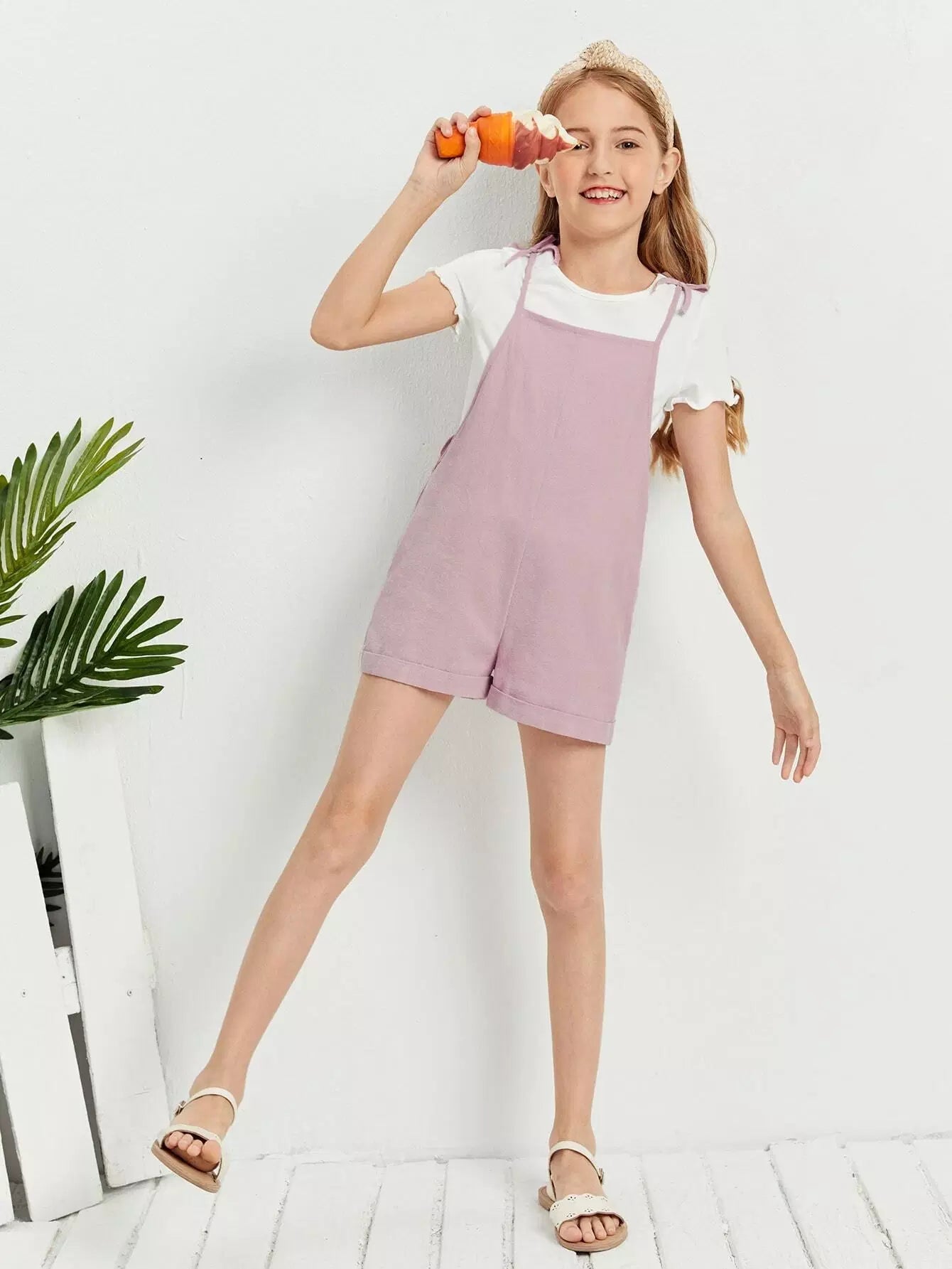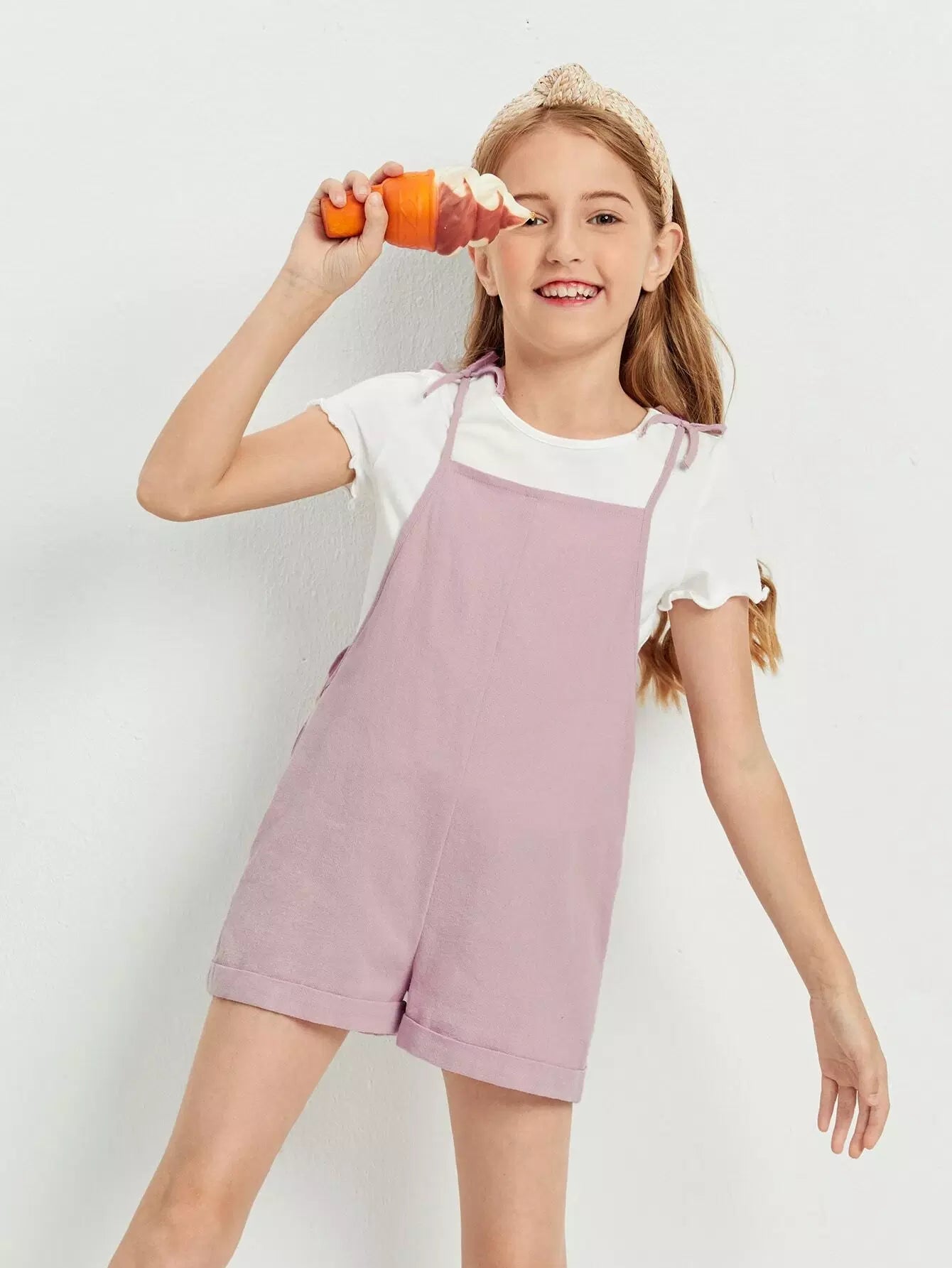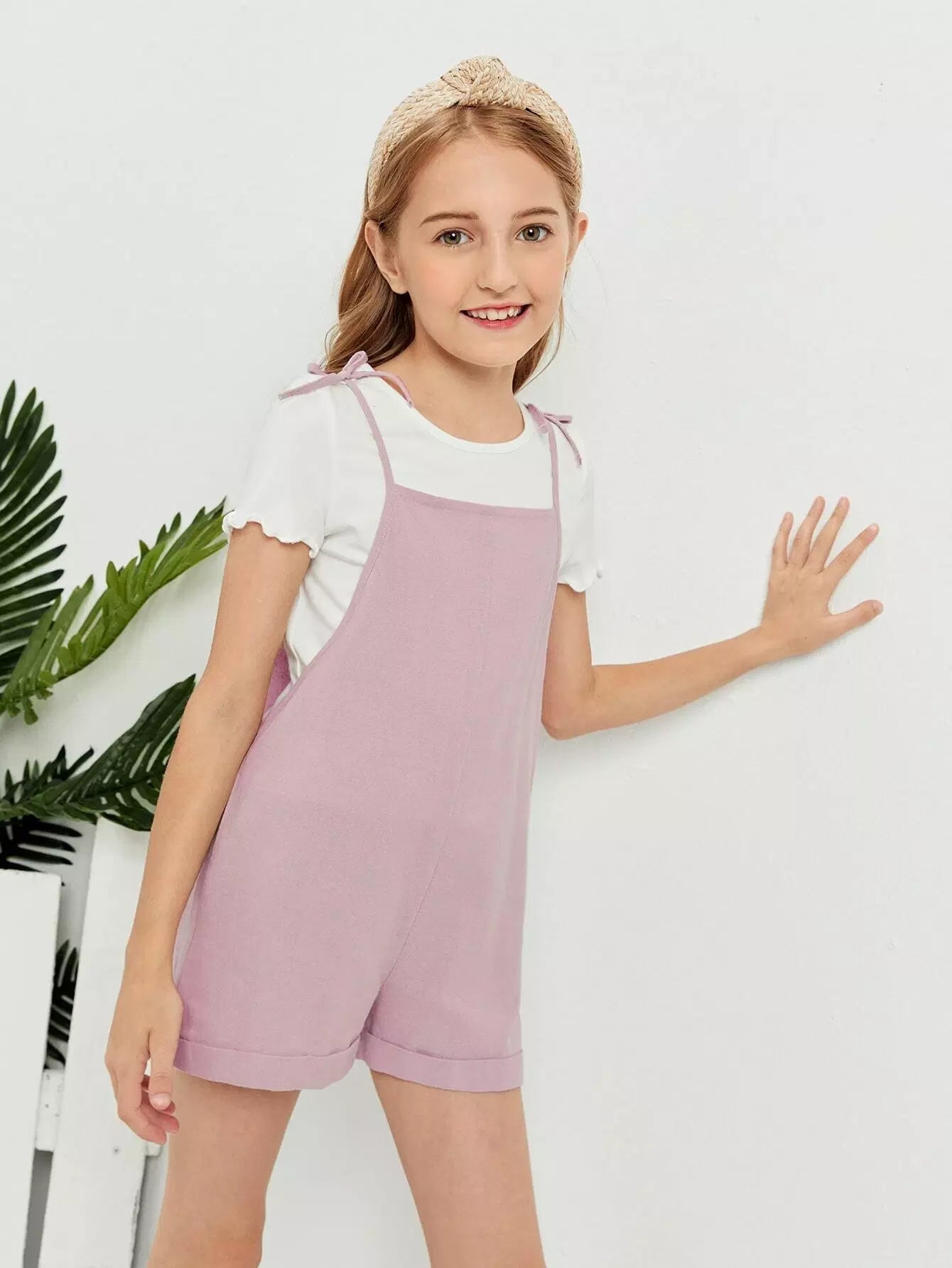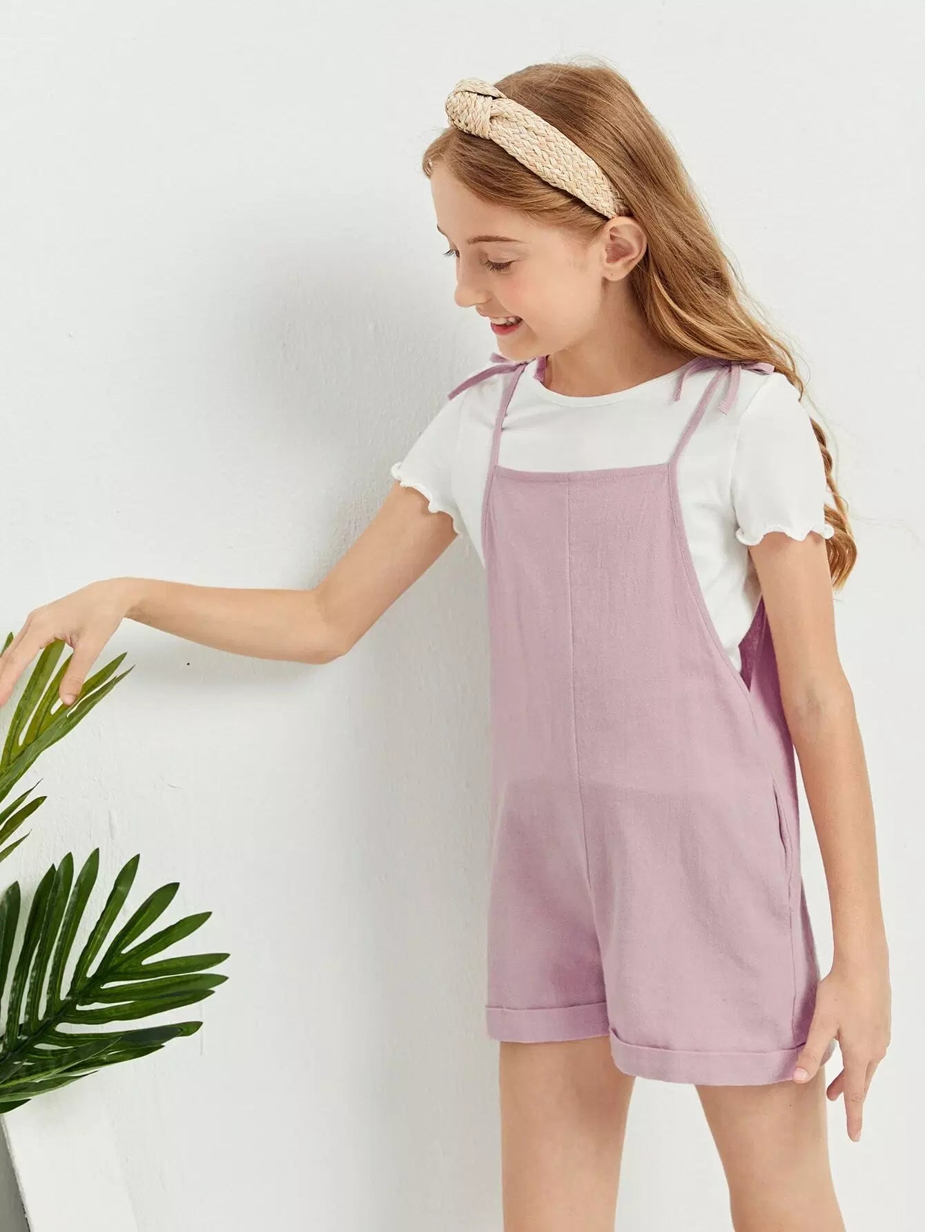 طقم رومبر بقصة تي شيرت وربطة كتف مزينة بأوراق الخس للبنات