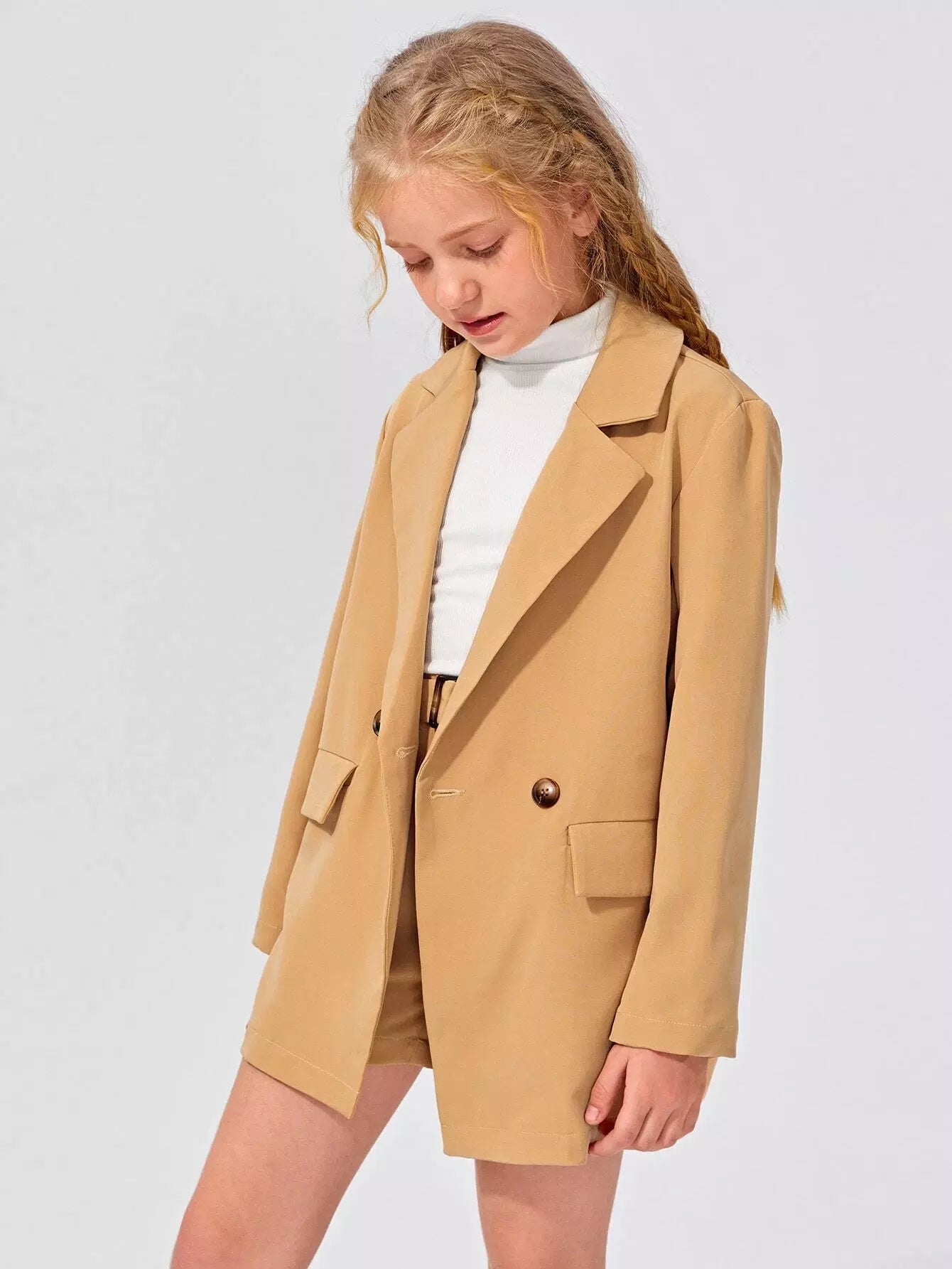 طقم بليزر بناتي بياقة مدببة وشورت بإبزيم ذاتي بدون حزام