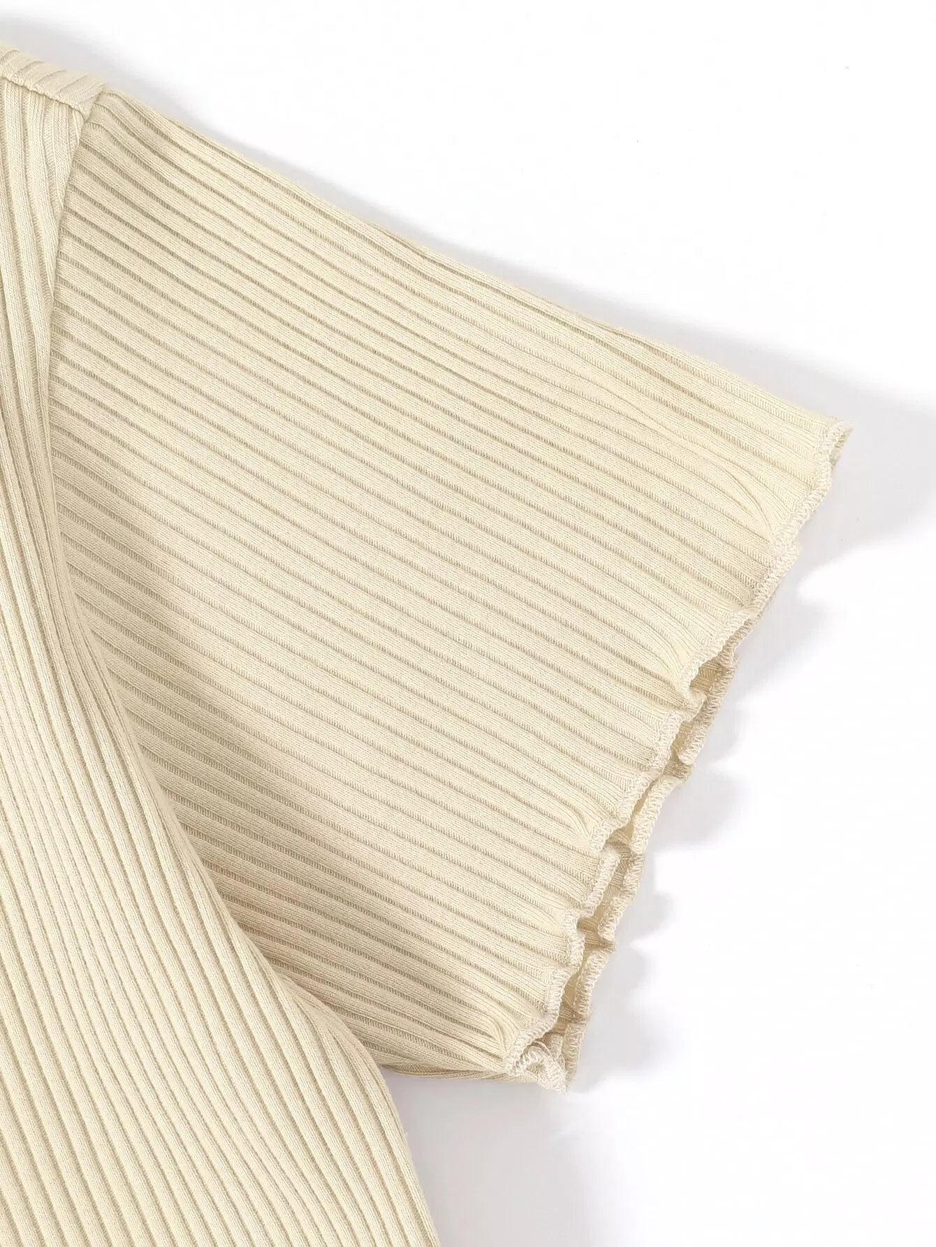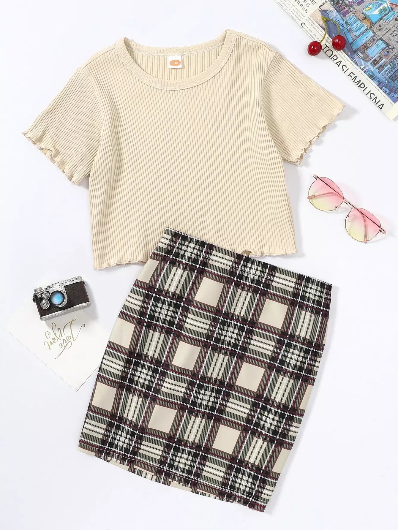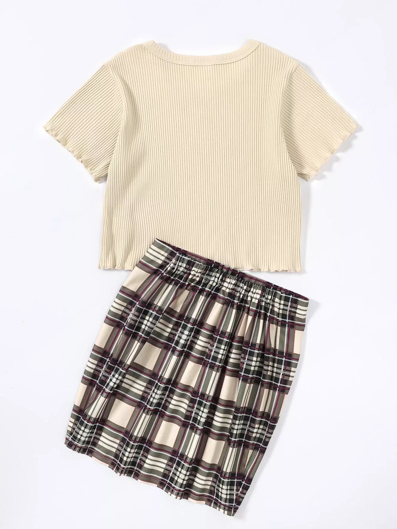 تي شيرت بحواف منقوشة على شكل ضلع للبنات وتنورة منقوشة