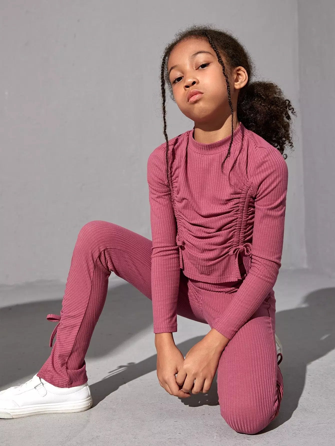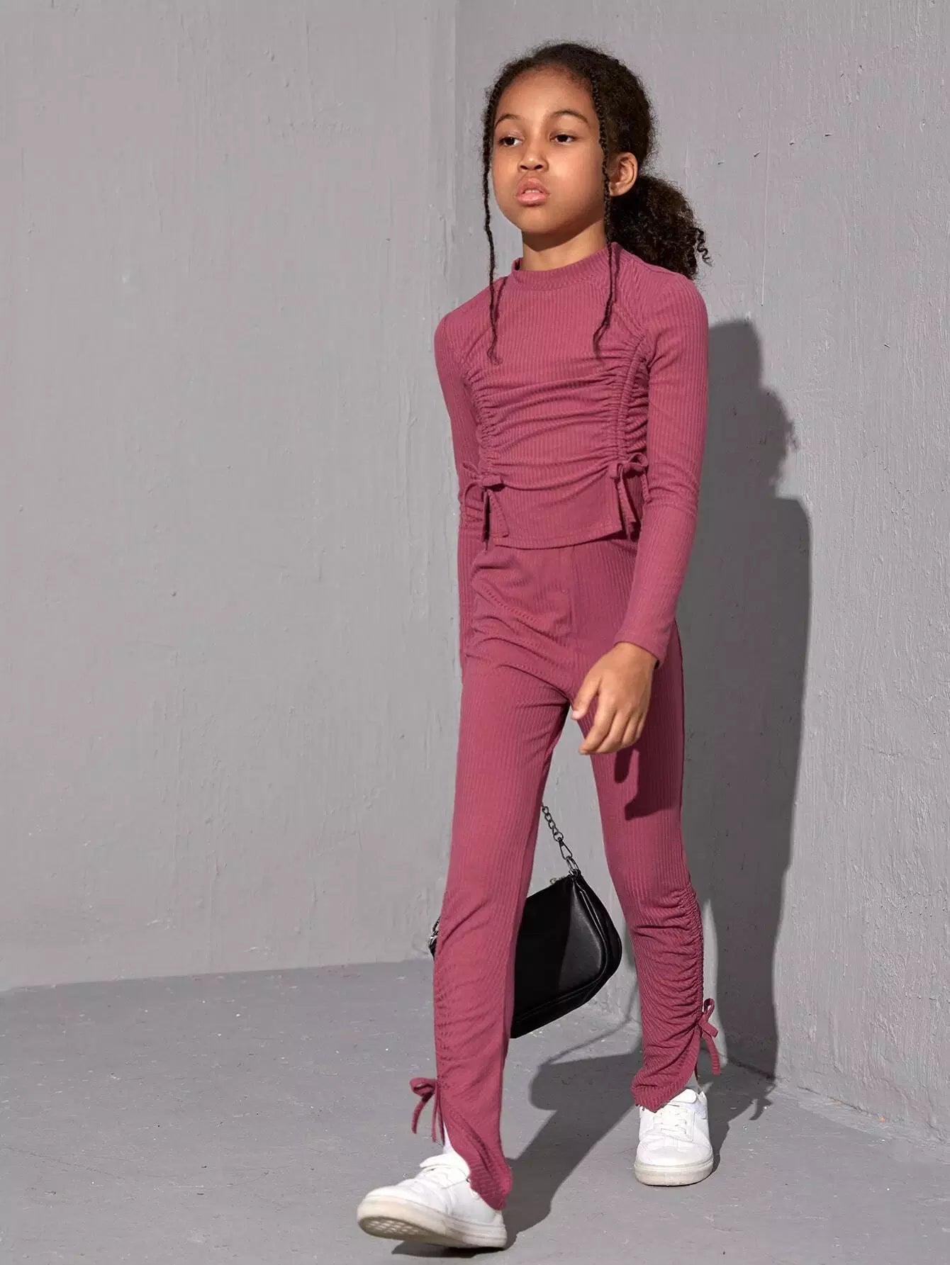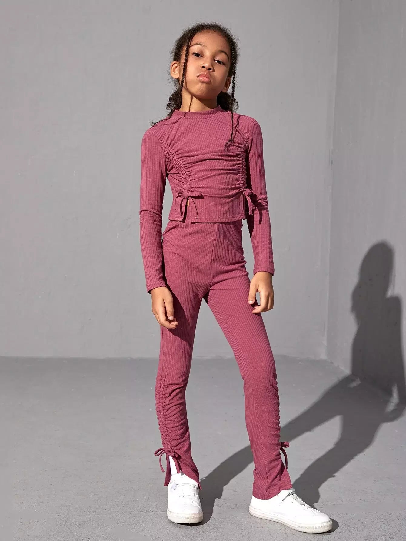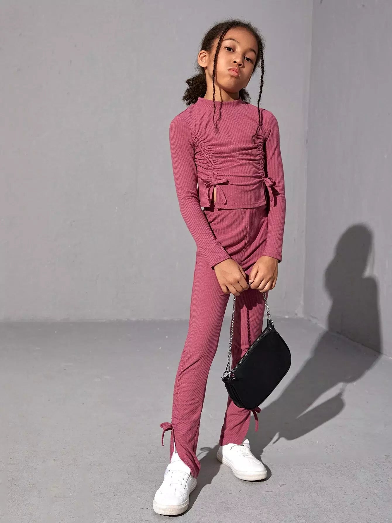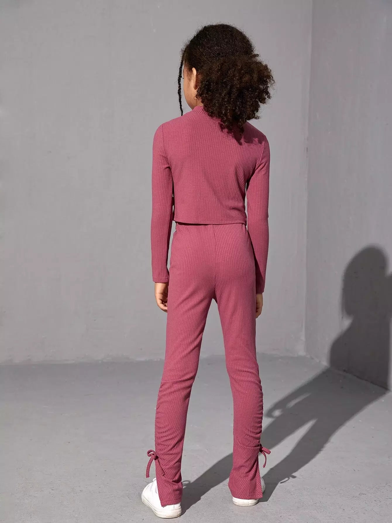 بلوزة قصيرة مضلعة برباط سحب وبنطلون بحاشية عقدة للبنات