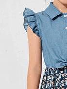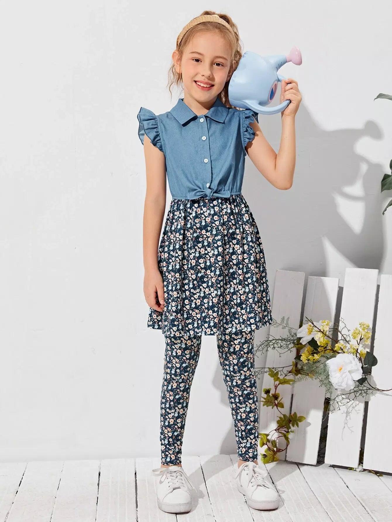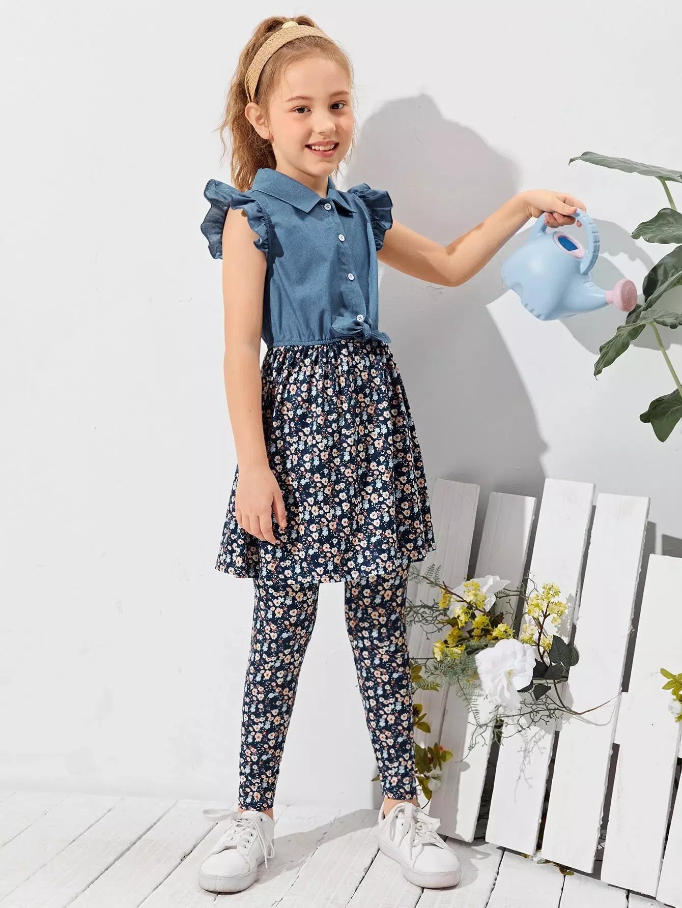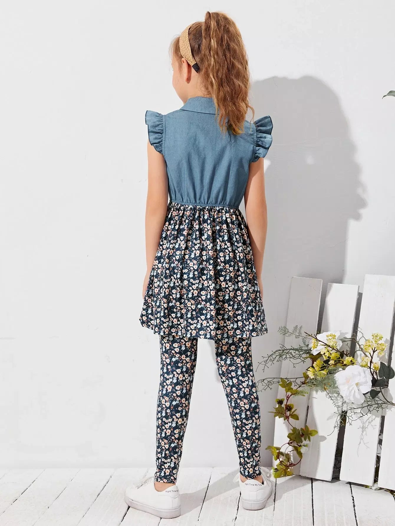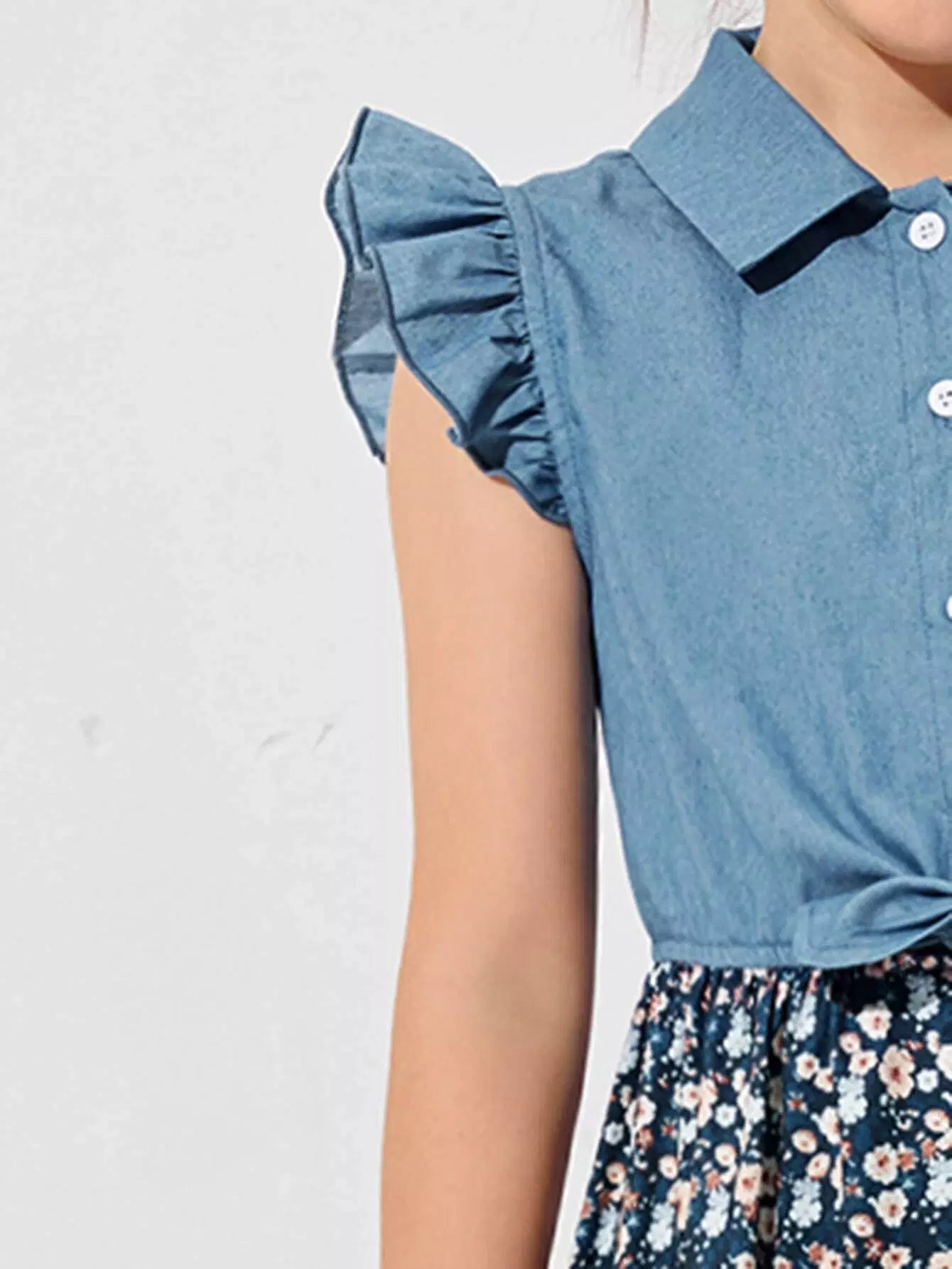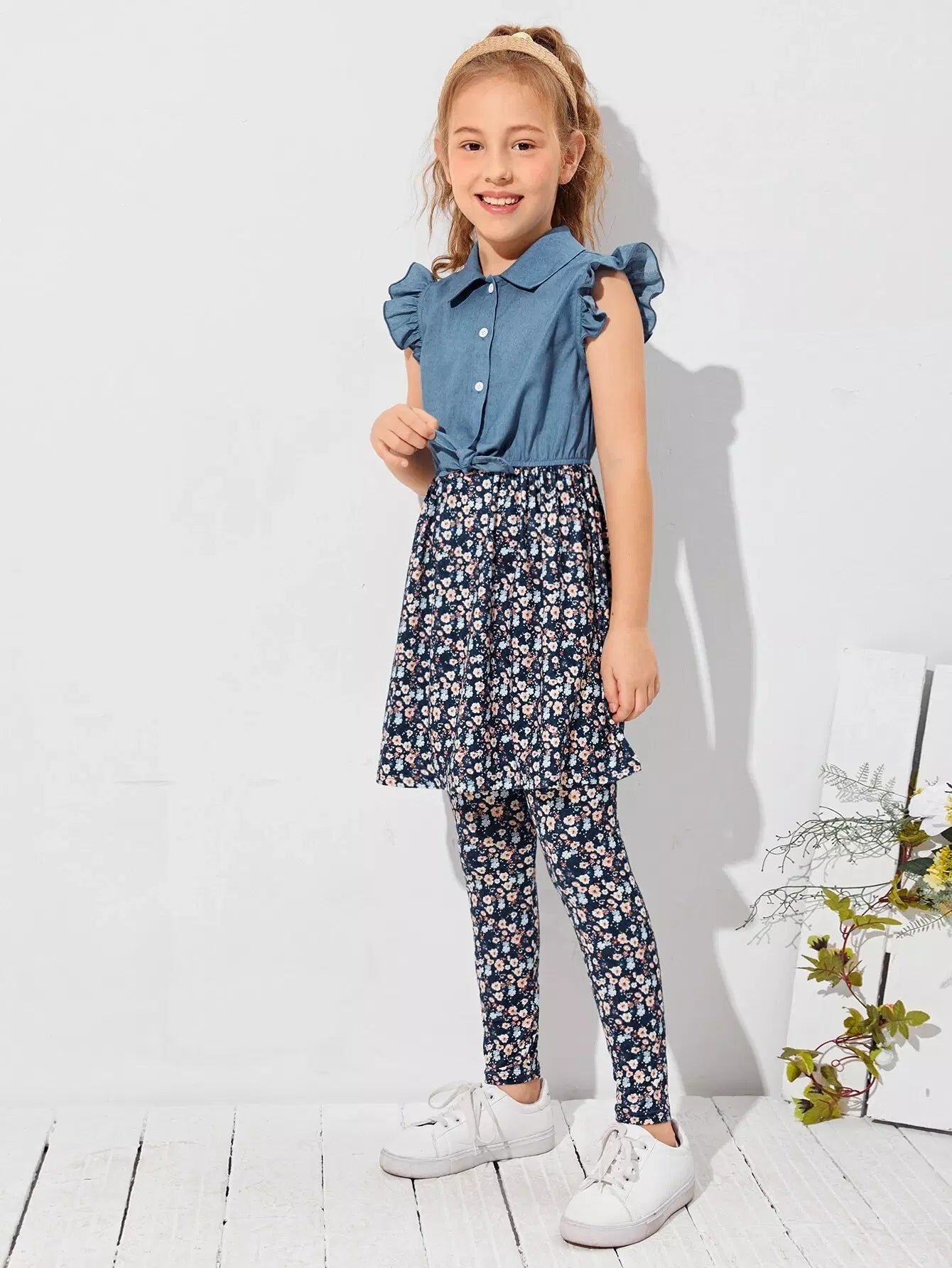 طقم بلوزة وبنطلون مع تنورة بحافة مزخرفة بكشكشة للبنات