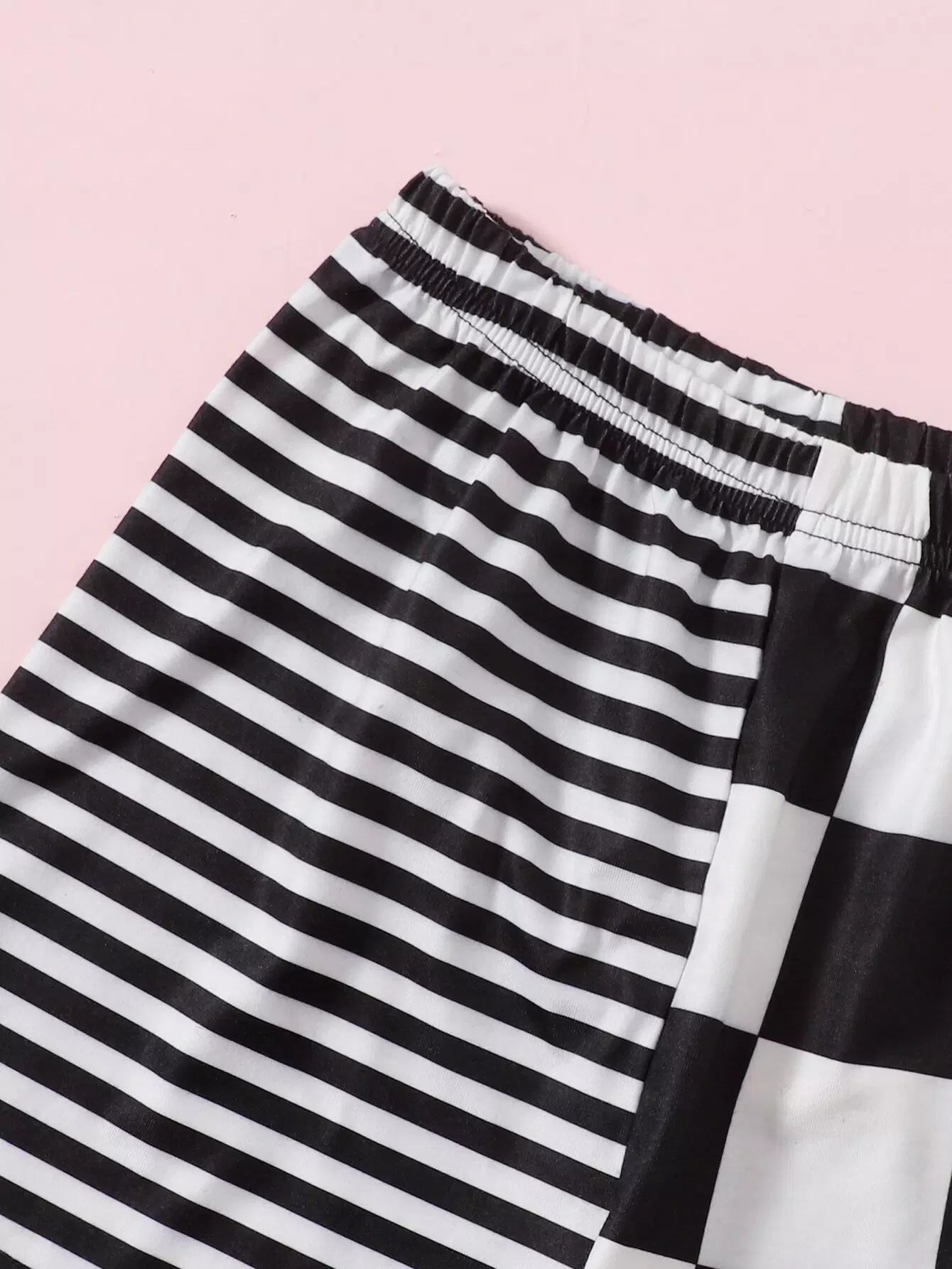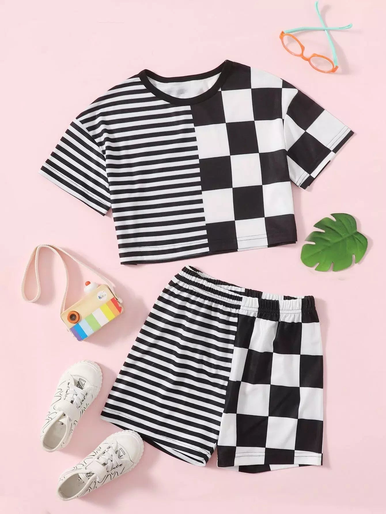 تي شيرت بناتي مخطط ومربّع مع شورت بنقشة المربعات