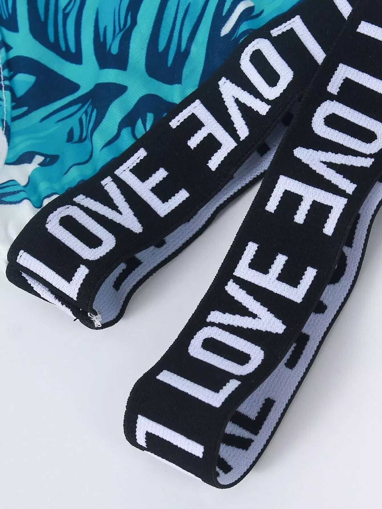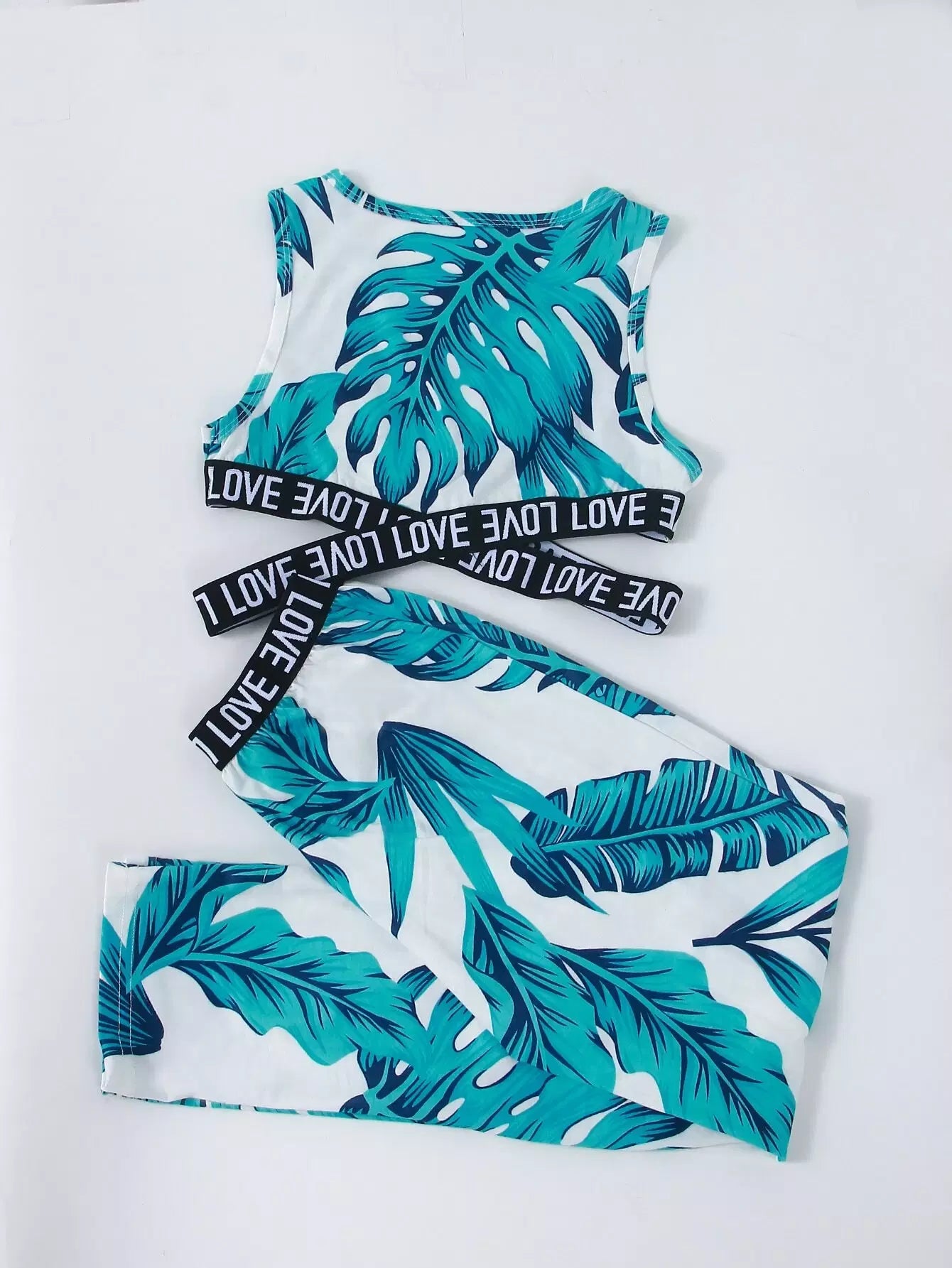 تي شيرت بدون أكمام بطبعة استوائية للبنات مع بنطال ضيق