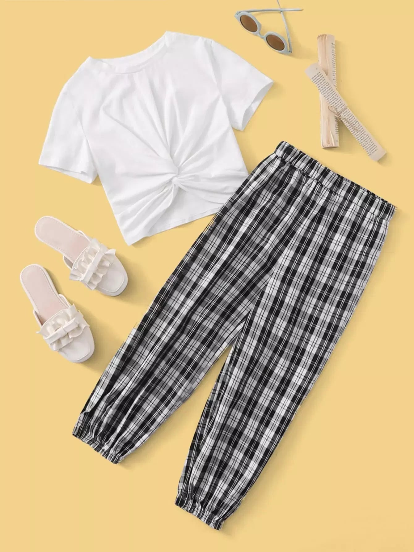 تي شيرت بناتي ملتوي من الأمام وبنطلون منقوش بنقشة الجزر