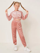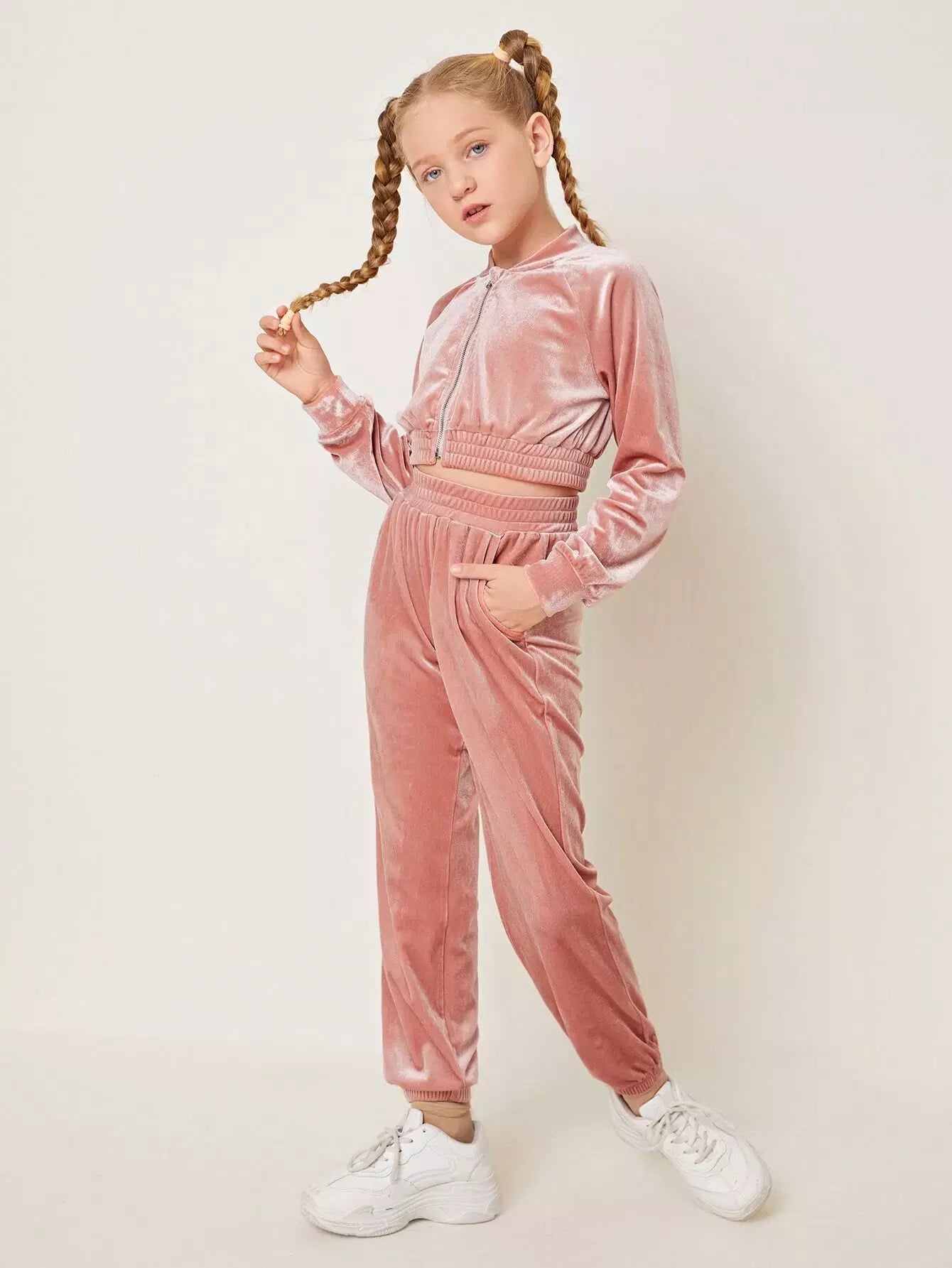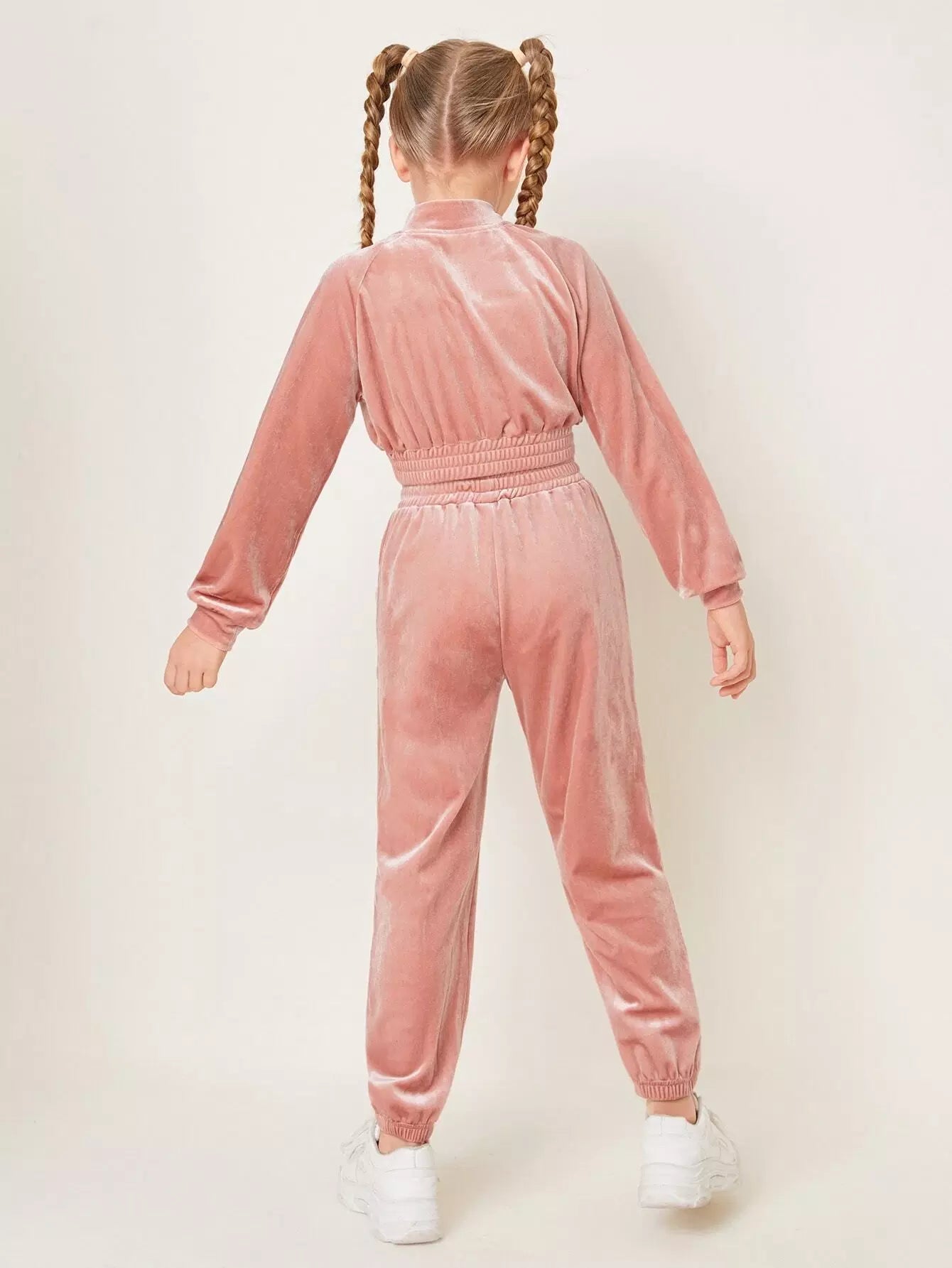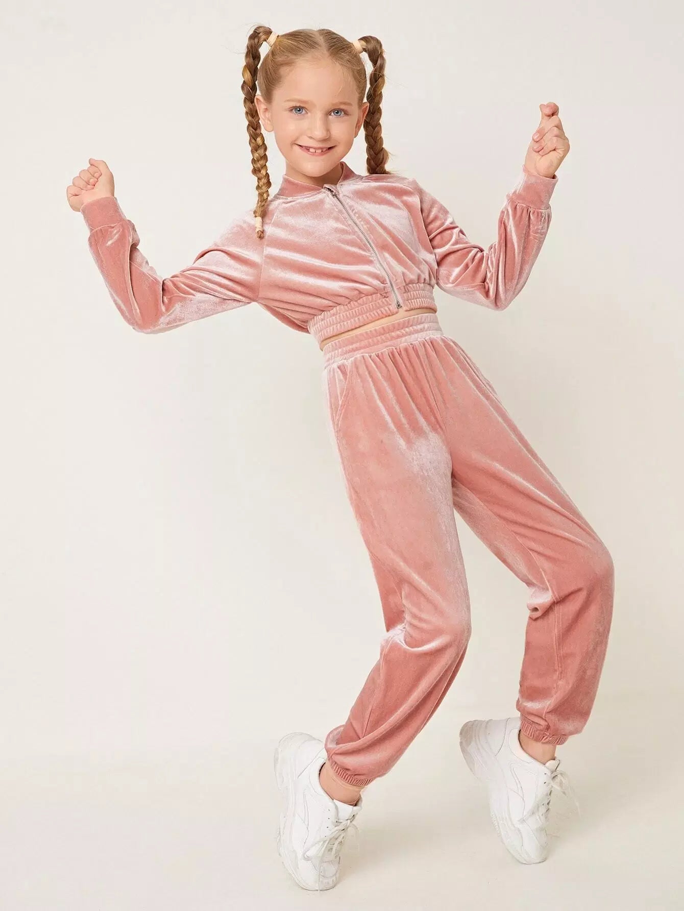 الأطفال - طقم جاكيت وسروال مخملي بسحاب للفتيات