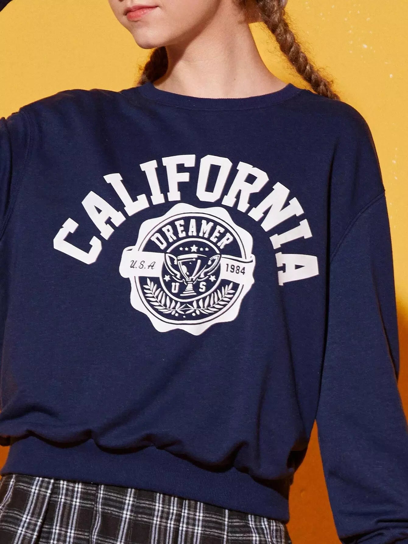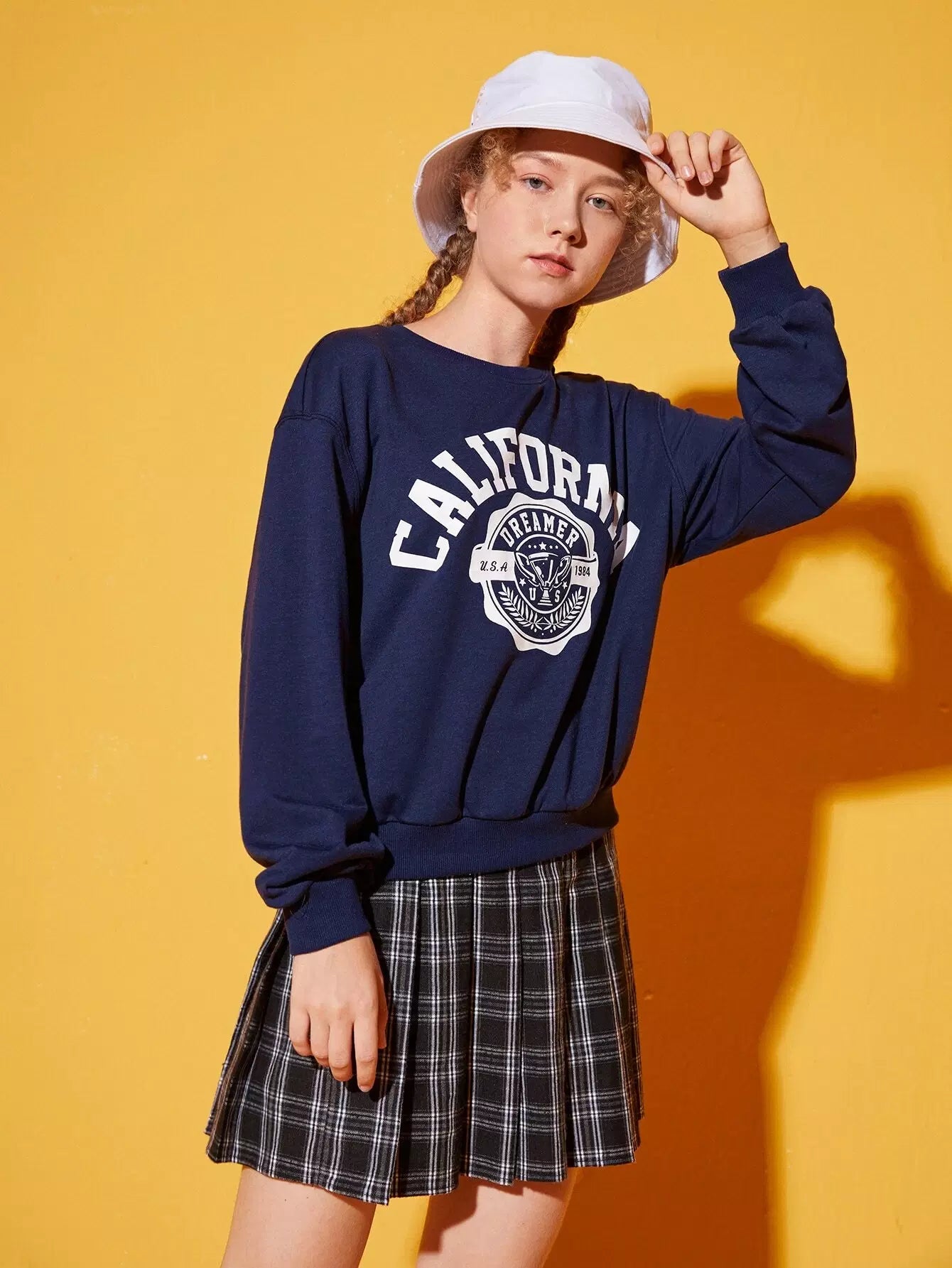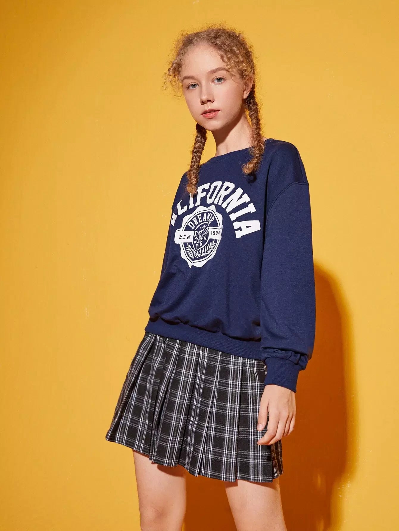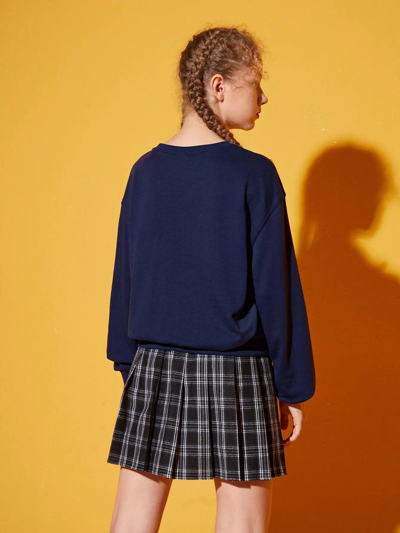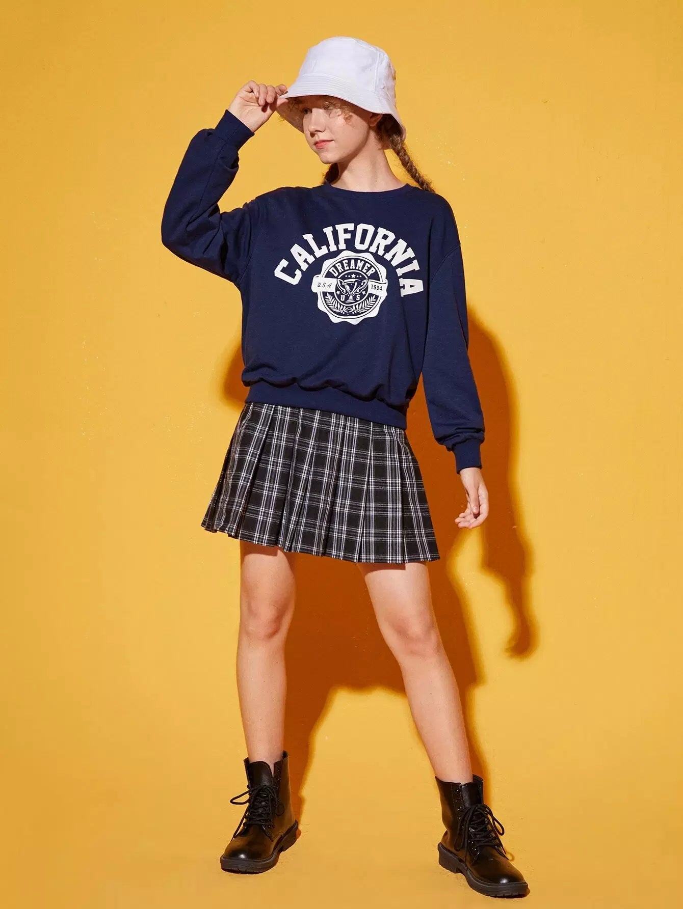 بلوزة بأكمام منسدلة وطبعة حروف وشعار للفتيات المراهقات وتنورة منقوشة بنقشة التارتان