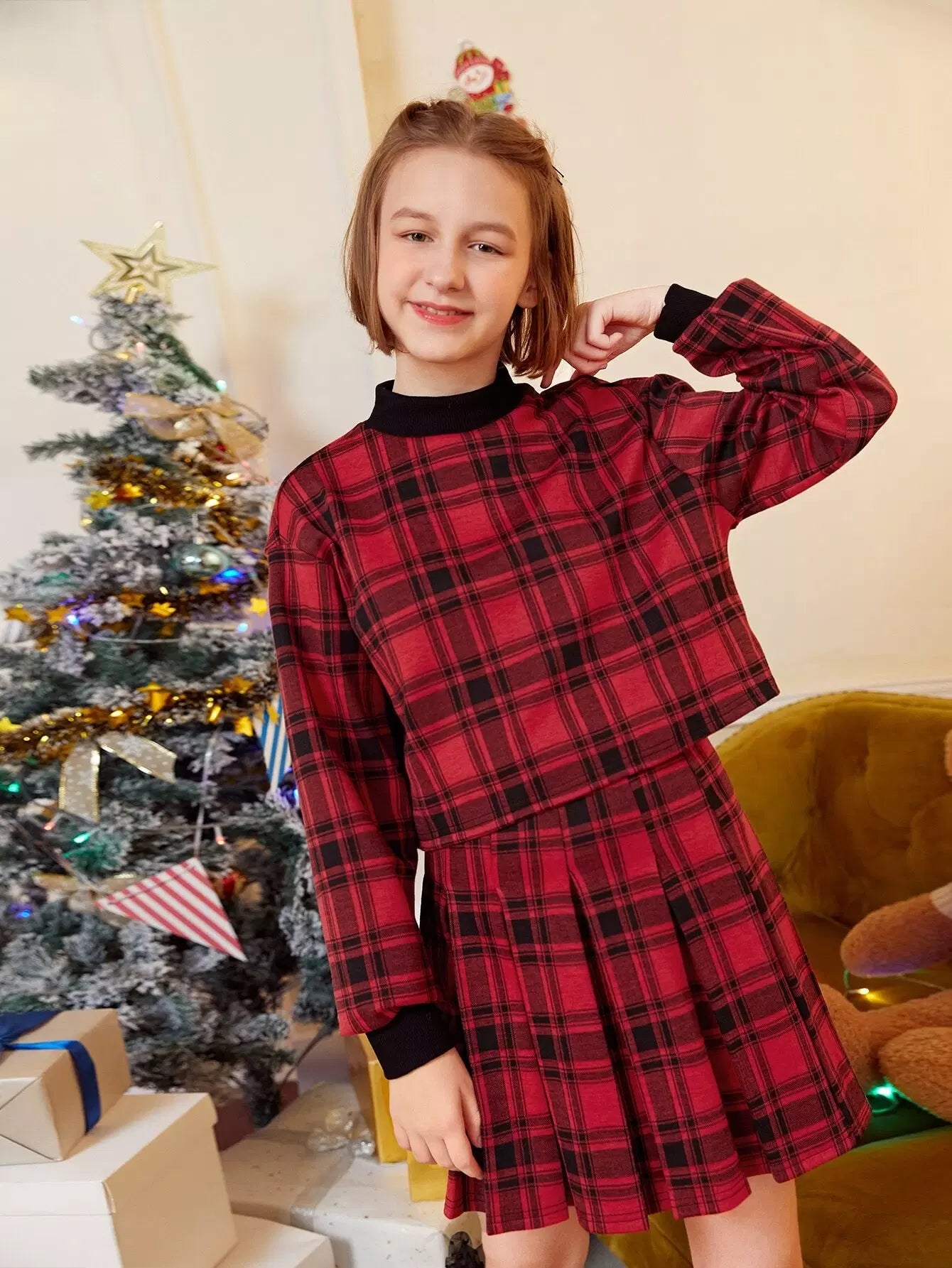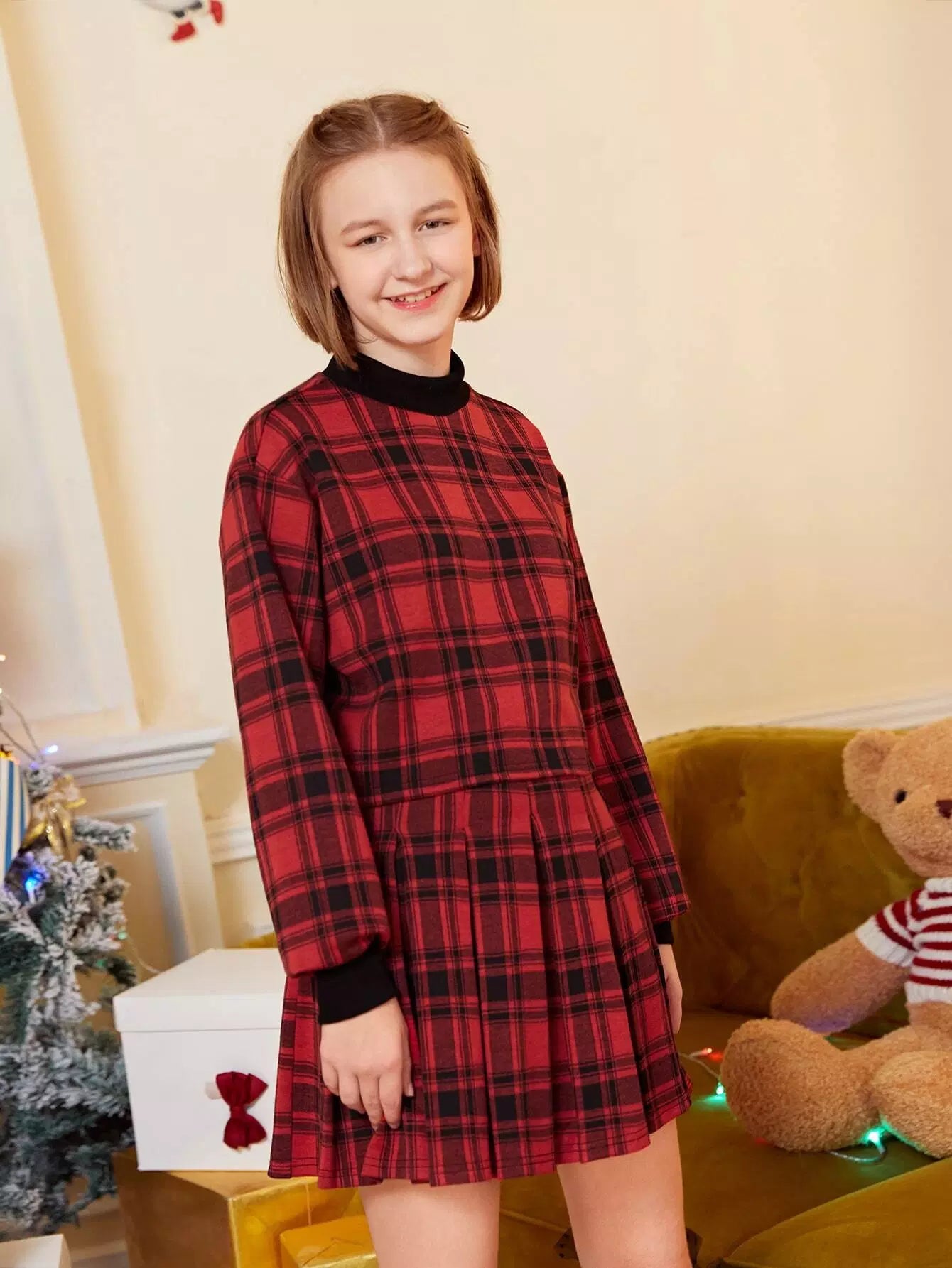 بلوزة منقوشة بأكمام منسدلة ورقبة وهمية وتنورة مطوية للفتيات المراهقات