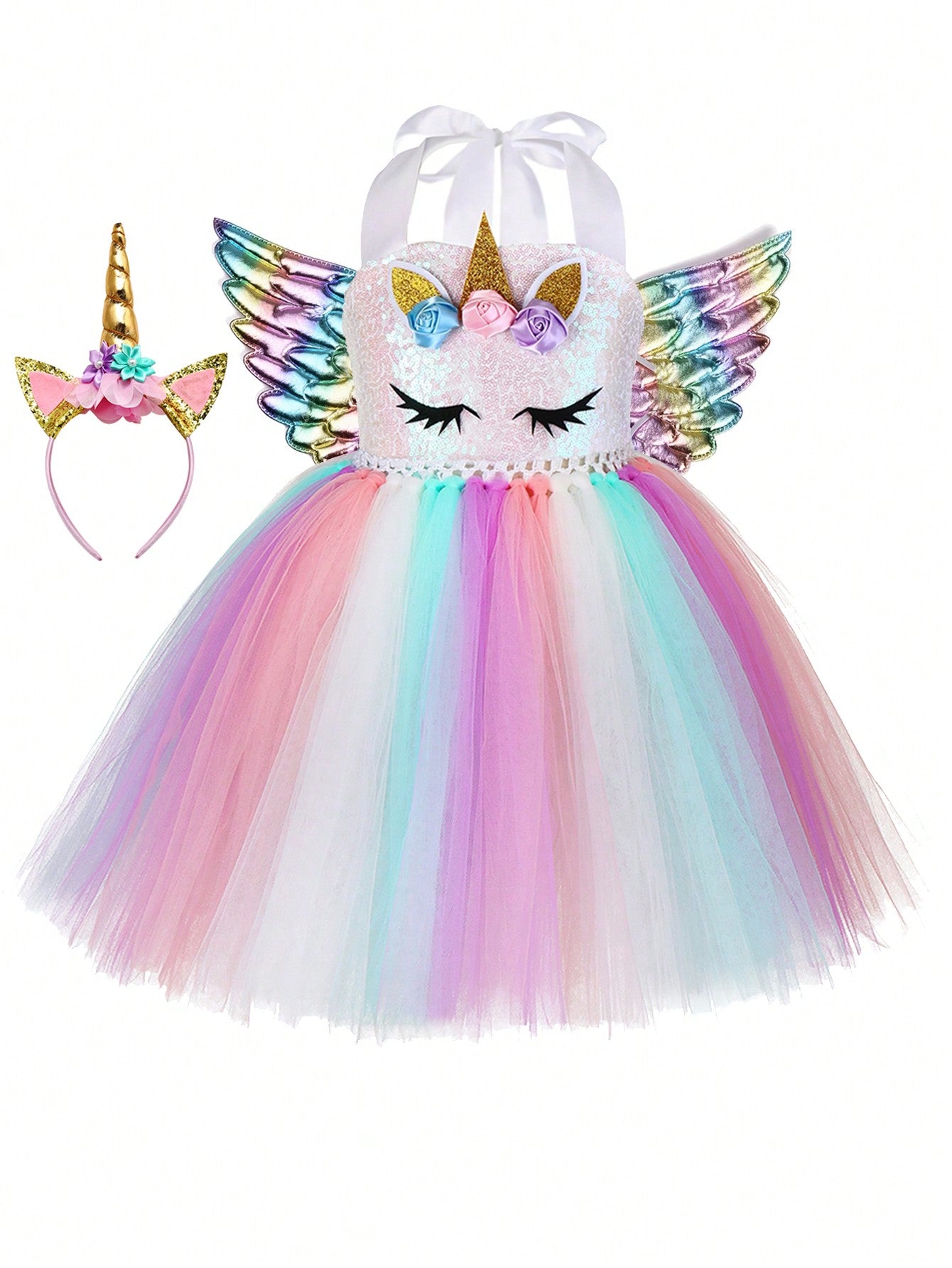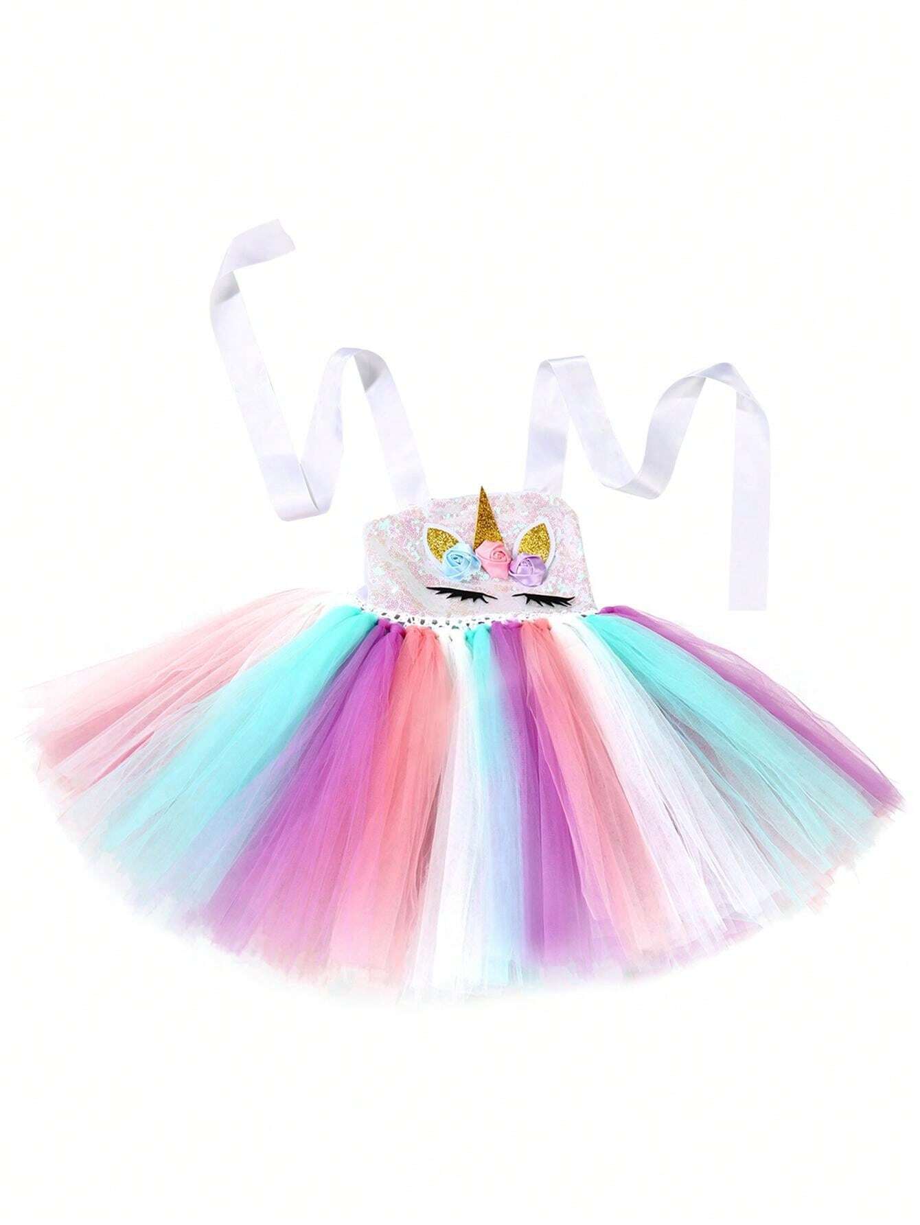 1pc Young Girl Unicorn Birthday Party Puffy Tulle Dress With Sequin Mesh Overlay, Including Headband