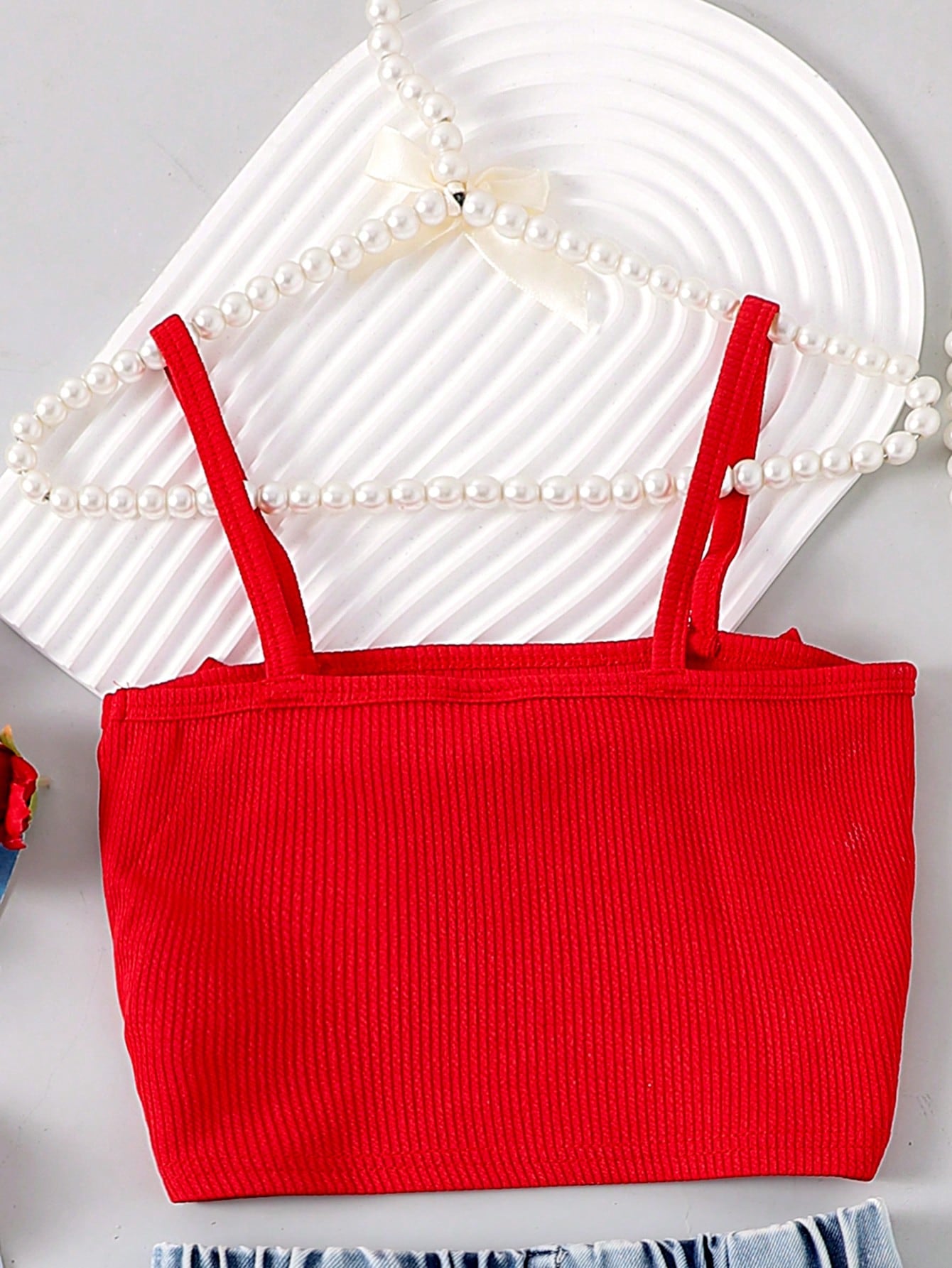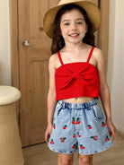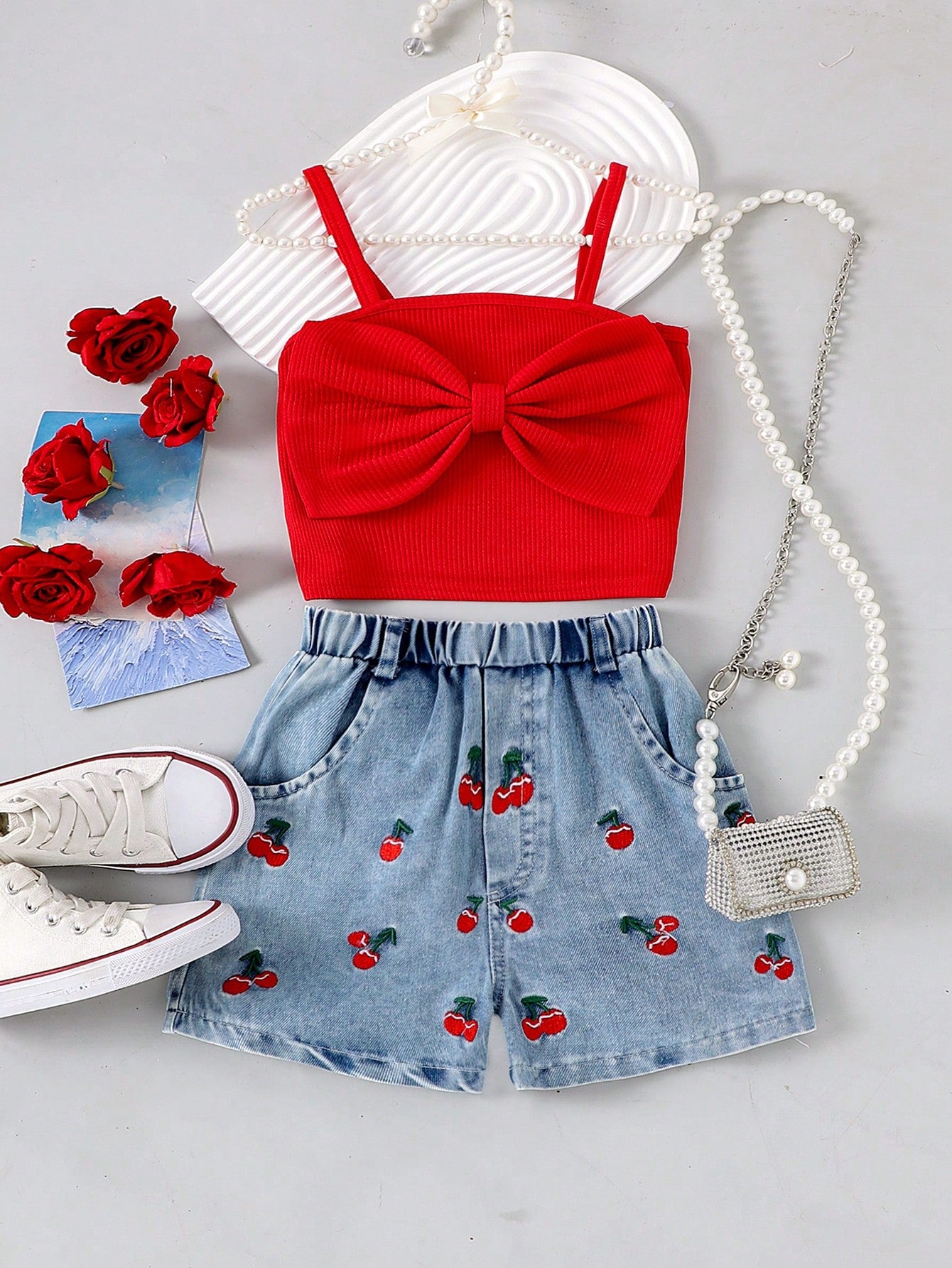 2pcs/Set Young Girl Red Bow Cami Top And Blue Denim Cherries Embroidered Shorts, Summer Casual Cute Vacation
