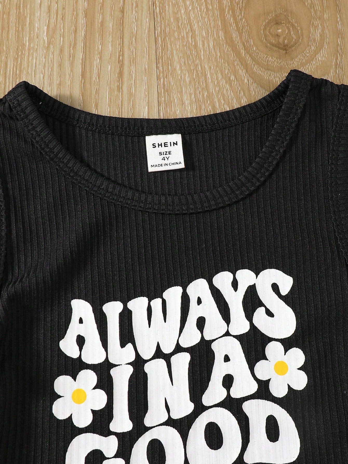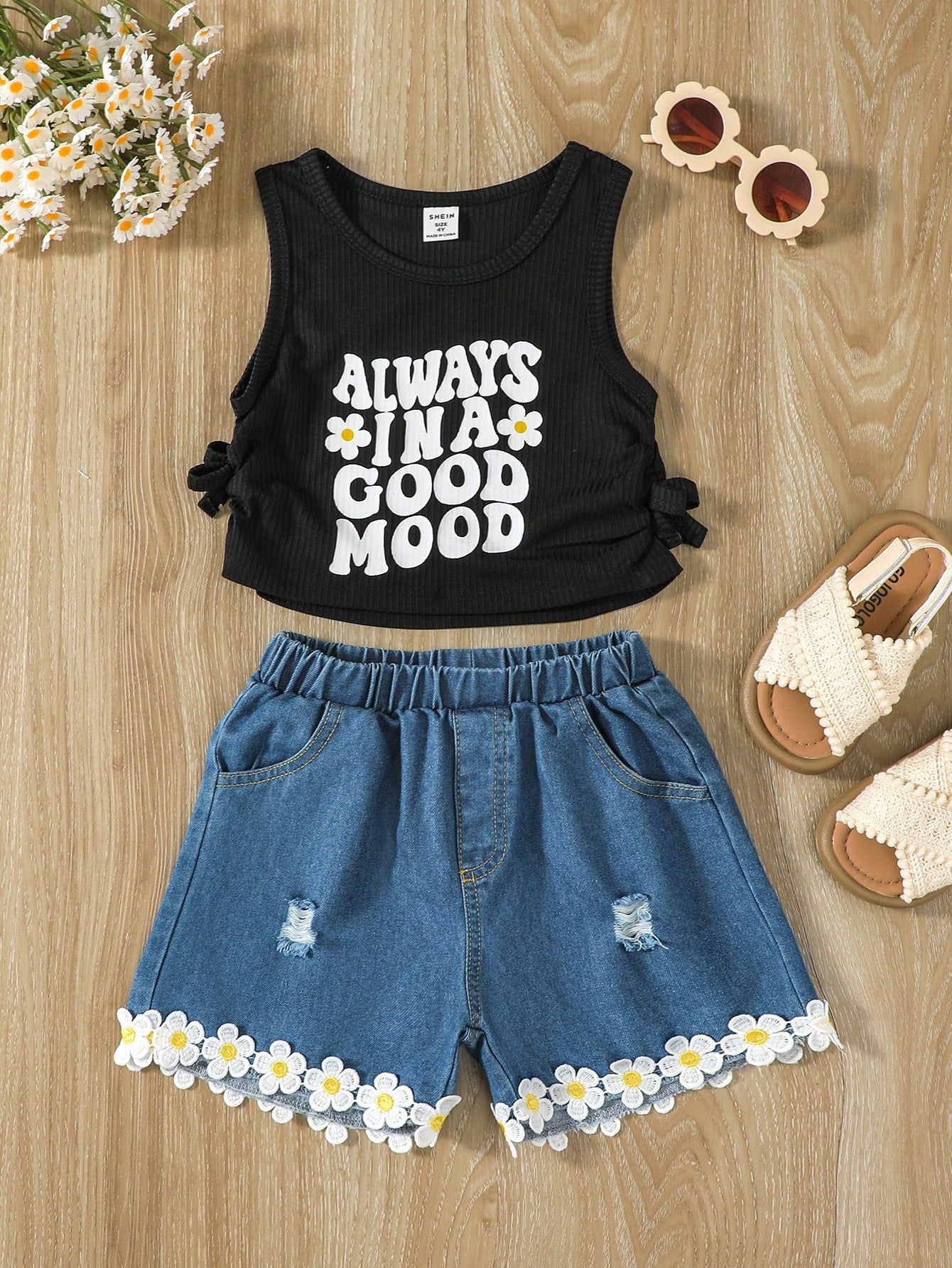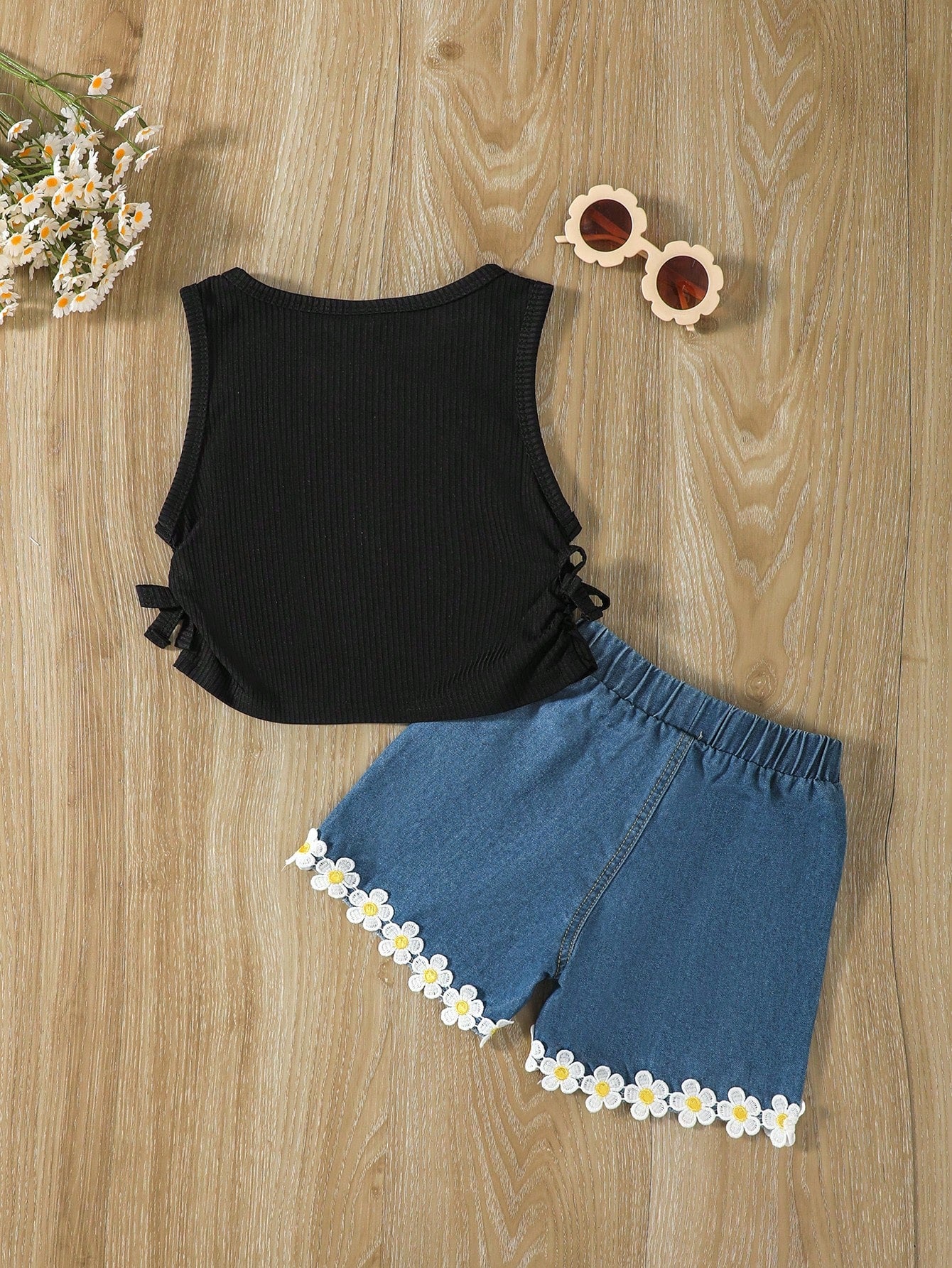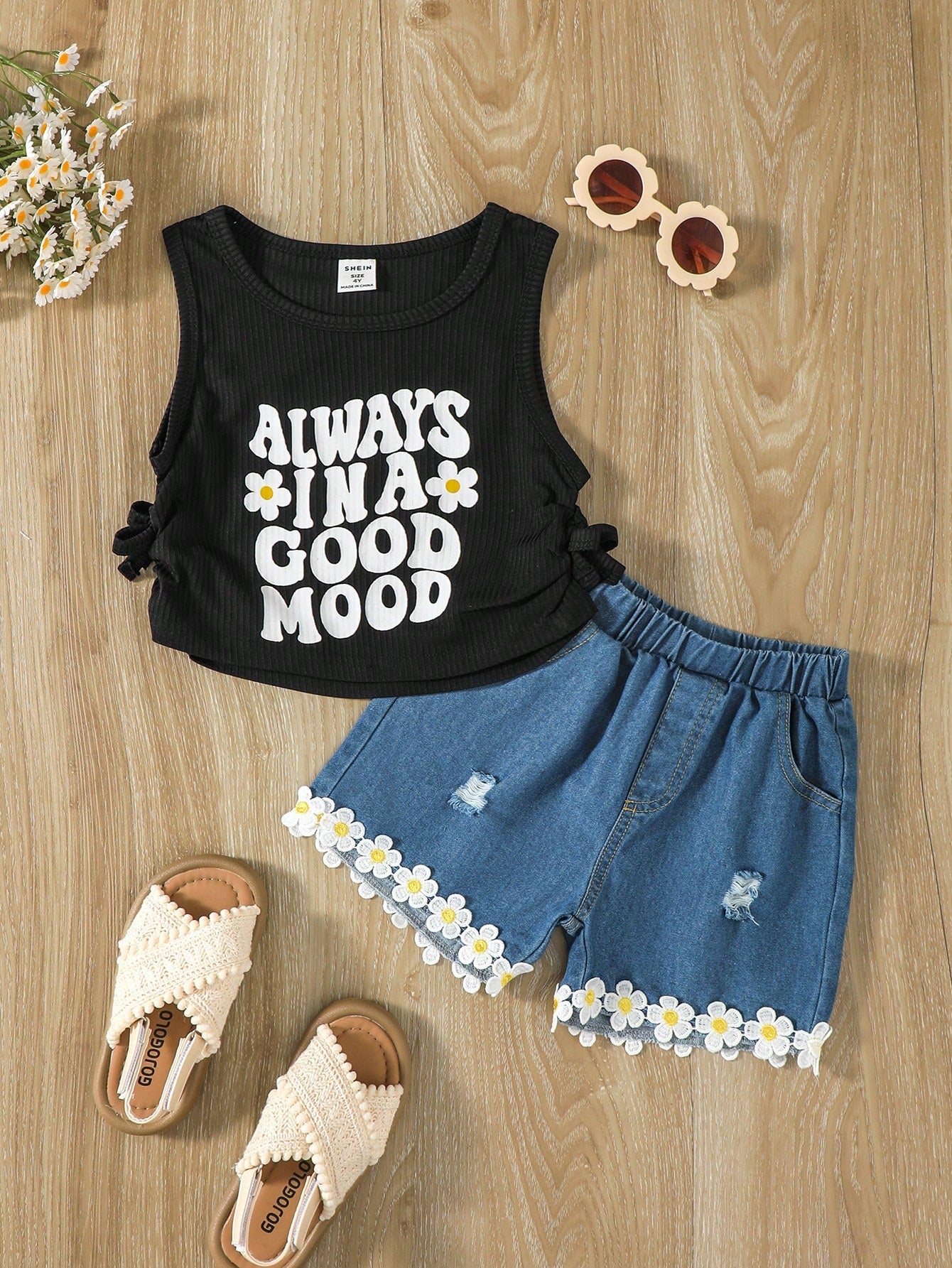قطعتان من بلوزة بدون أكمام بطبعة حروف ونمط كاجوال للفتيات الصغيرات وشورت جينز أزرق