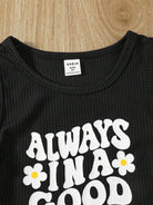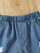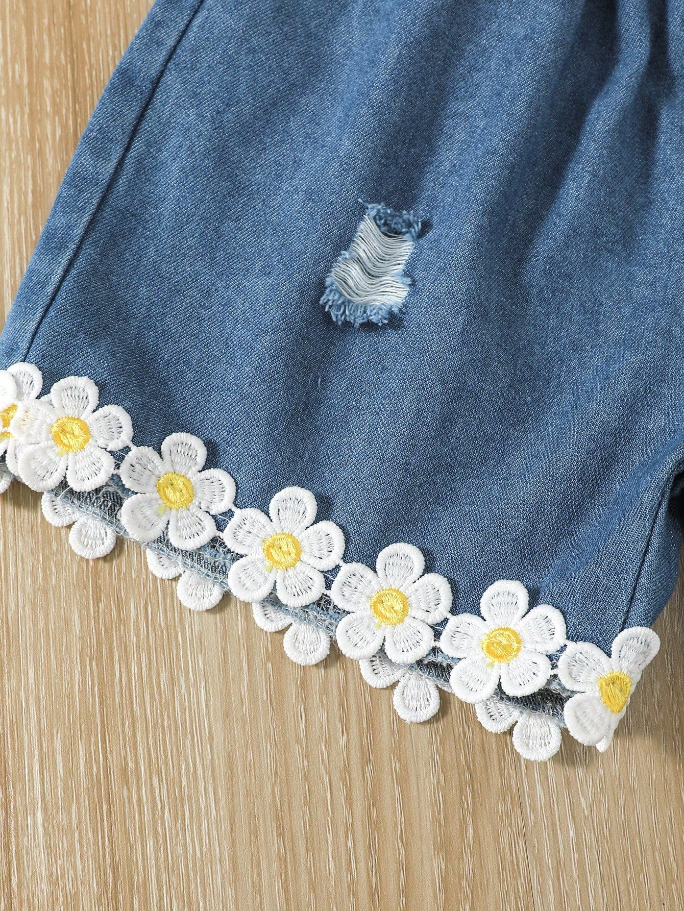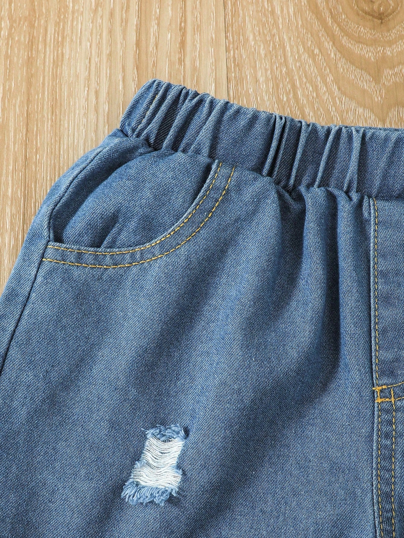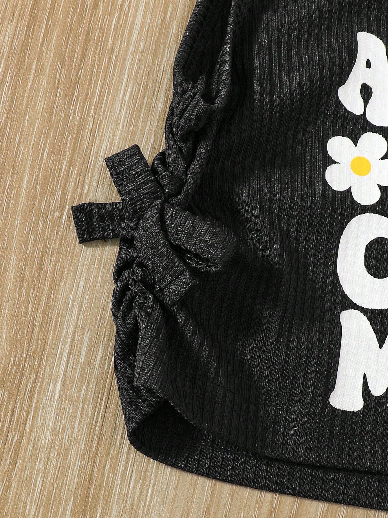 قطعتان من بلوزة بدون أكمام بطبعة حروف ونمط كاجوال للفتيات الصغيرات وشورت جينز أزرق