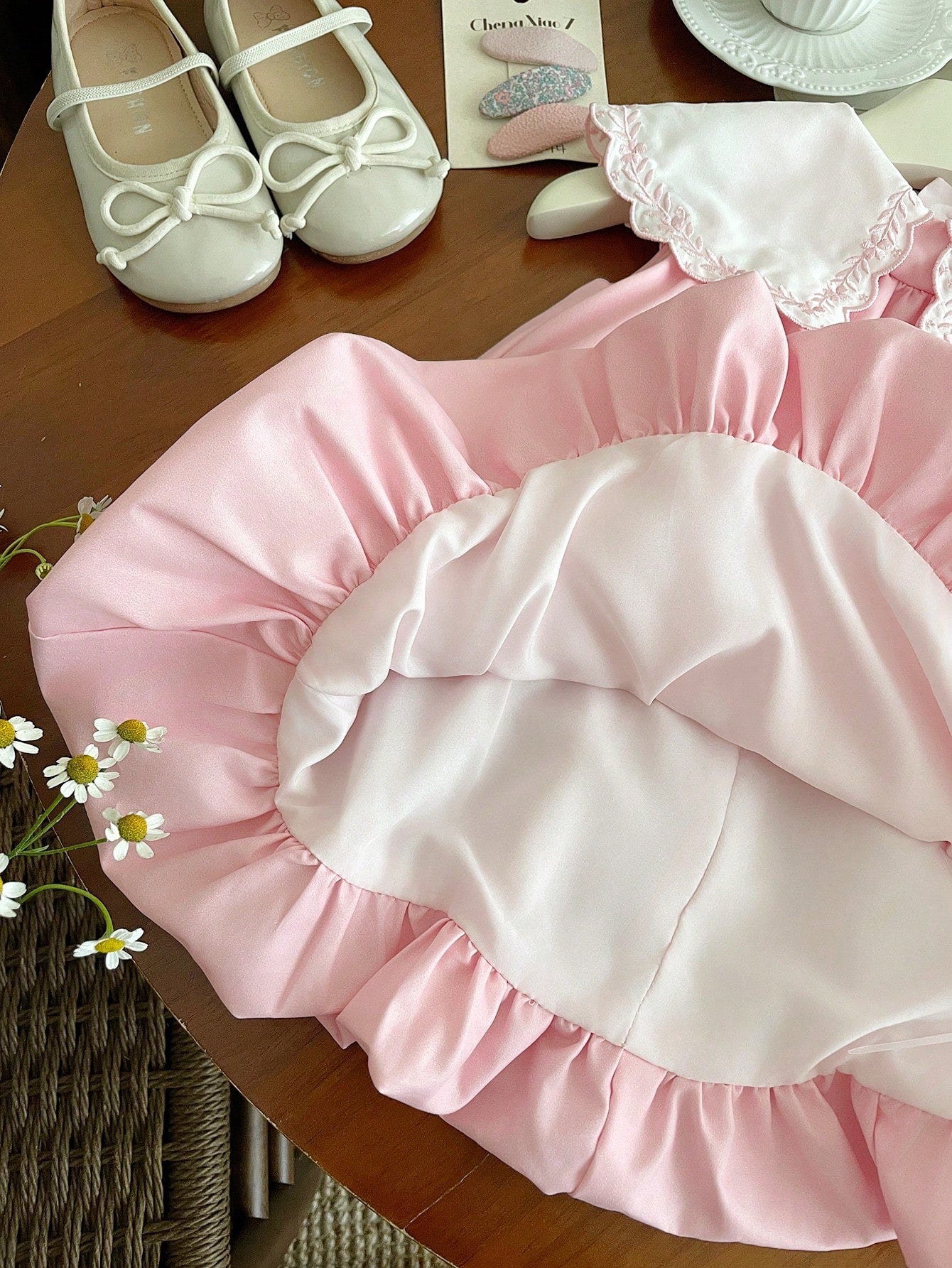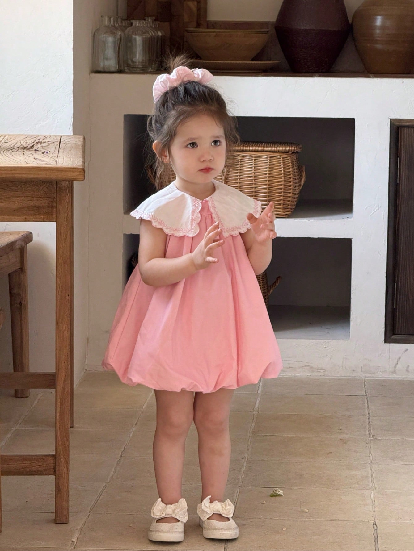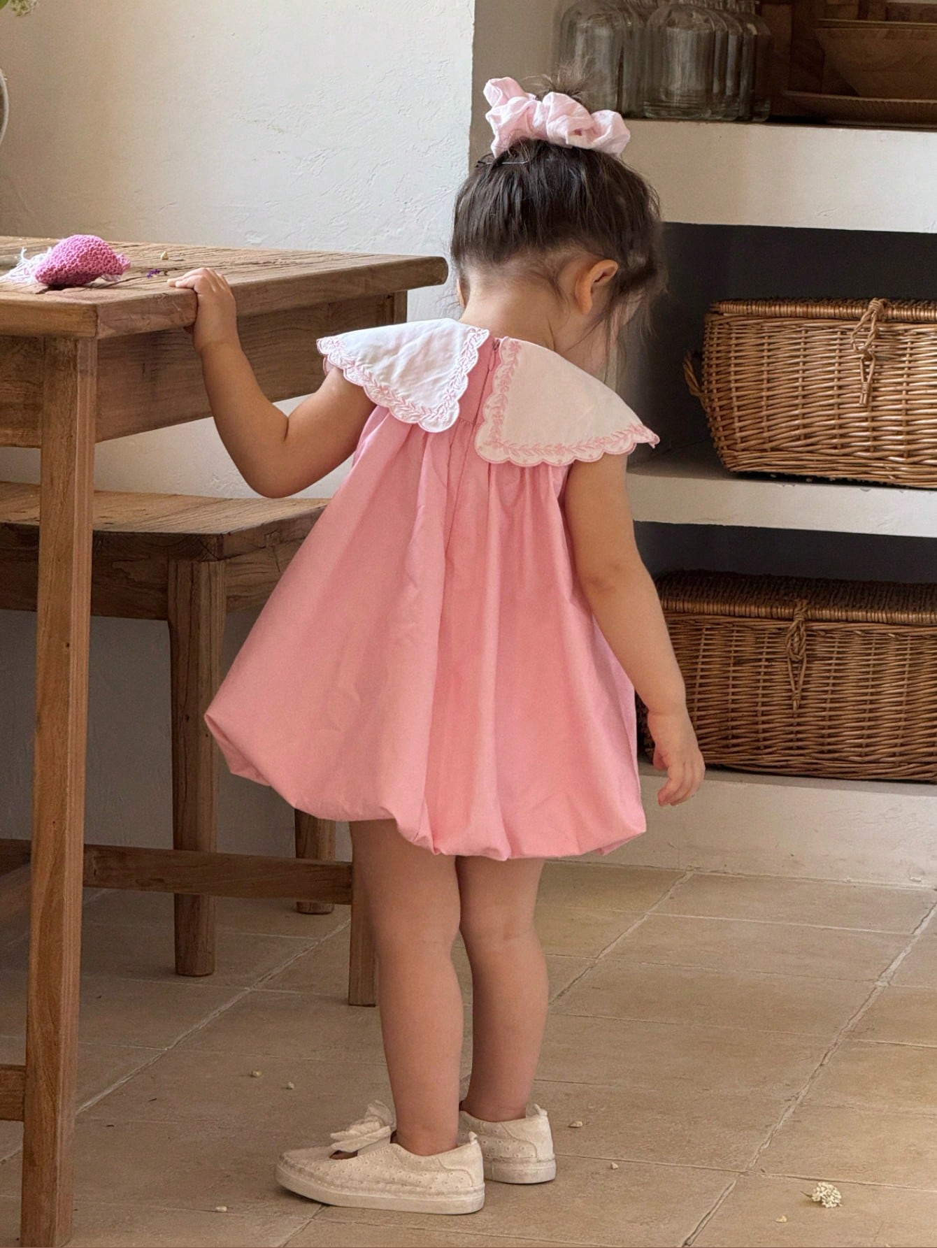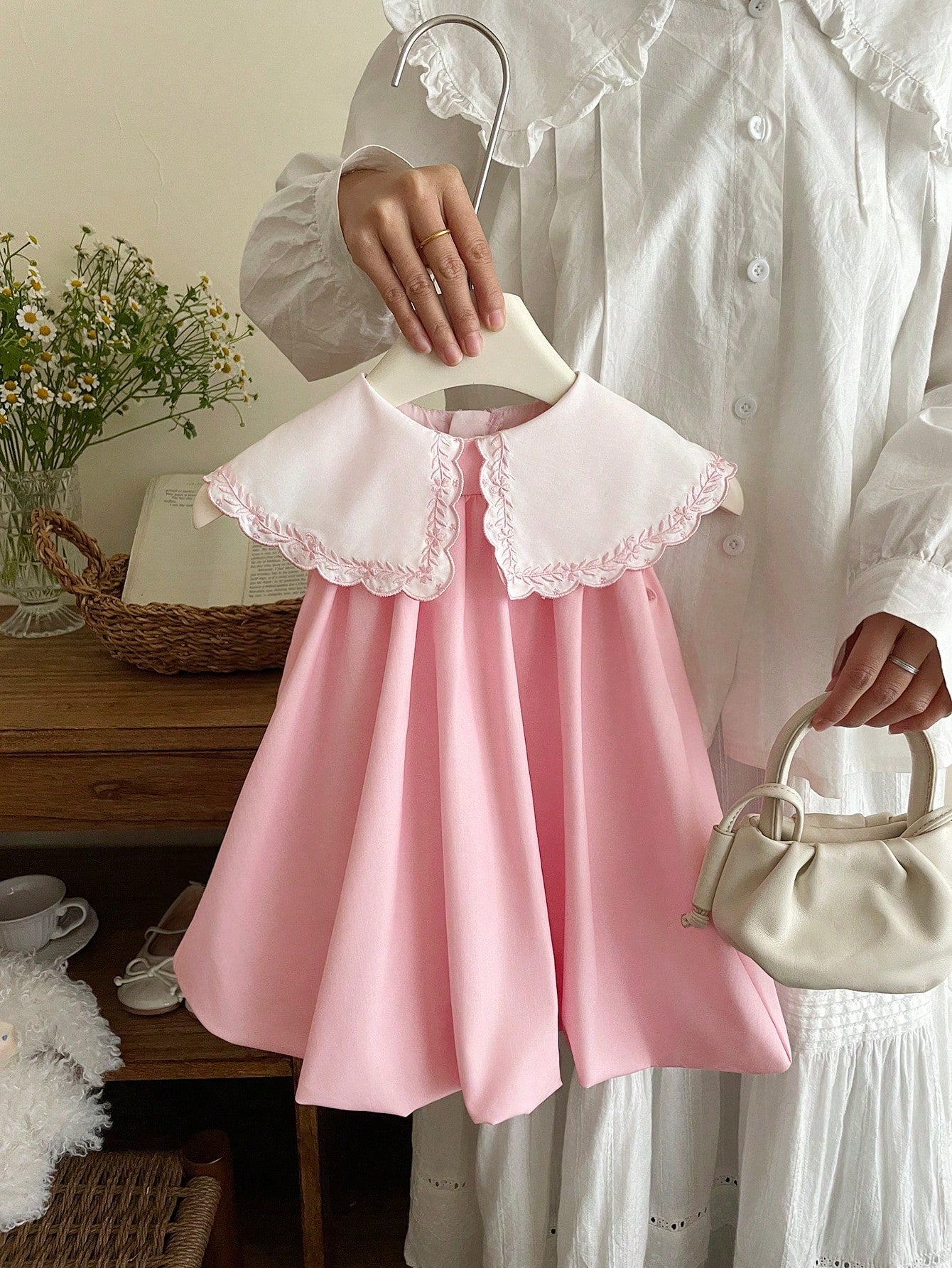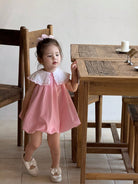 فستان وردي لطيف بدون أكمام مطرز بياقة بيتر بان مناسب للفتيات الصغيرات لفصل الصيف