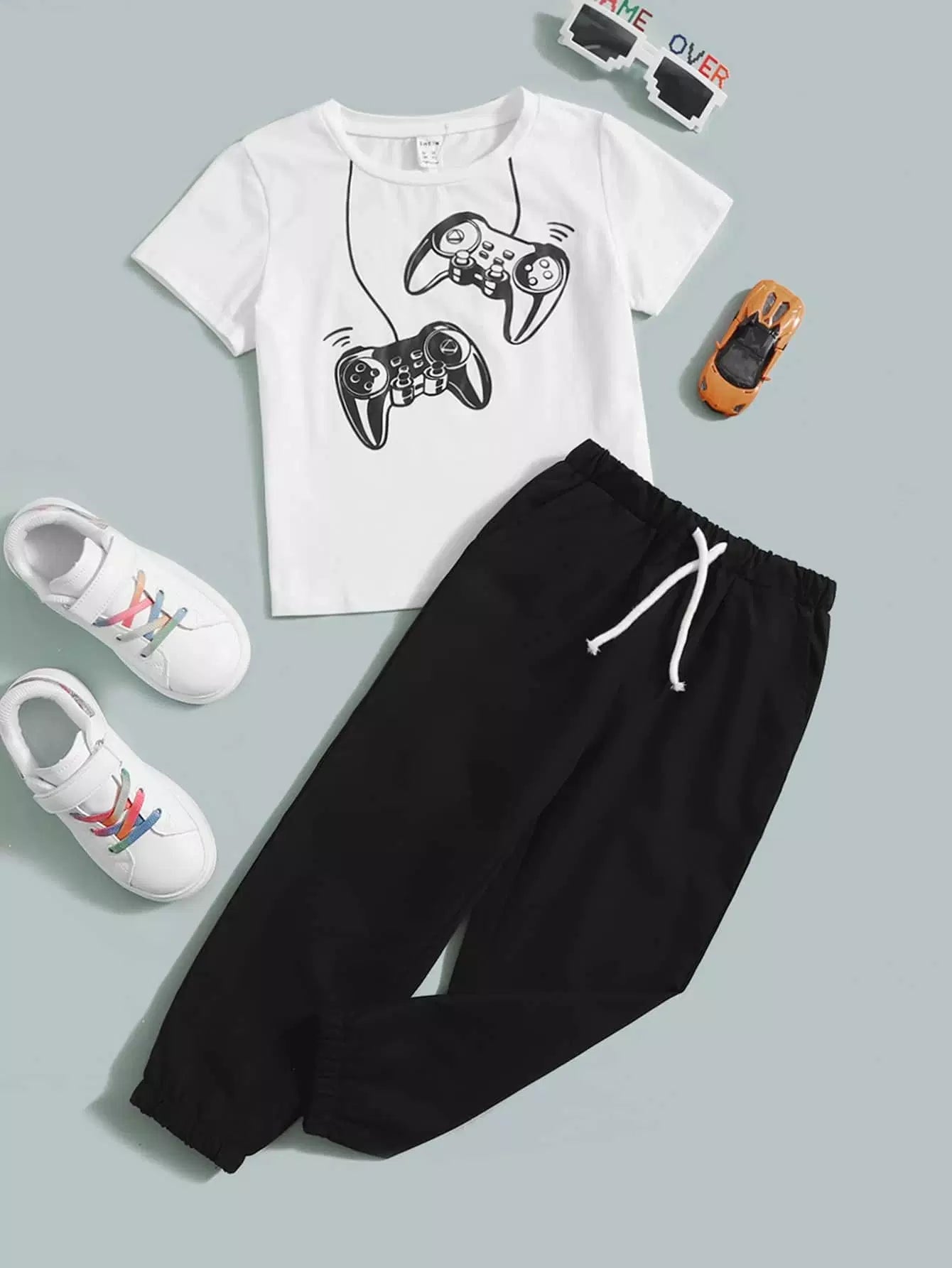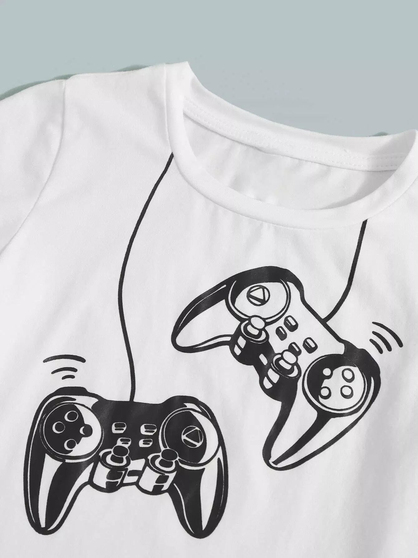 طقم تي شيرت وبنطلون مطبوع عليه صورة وحدة تحكم ألعاب للأولاد الصغار