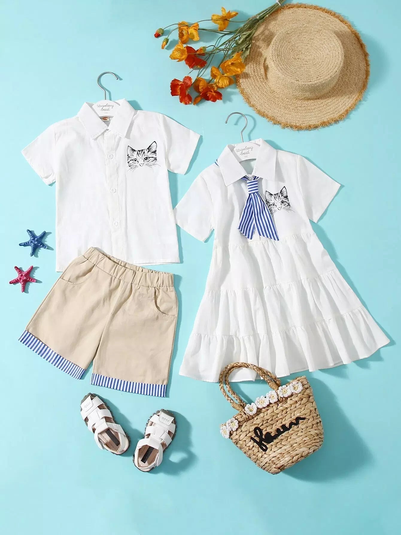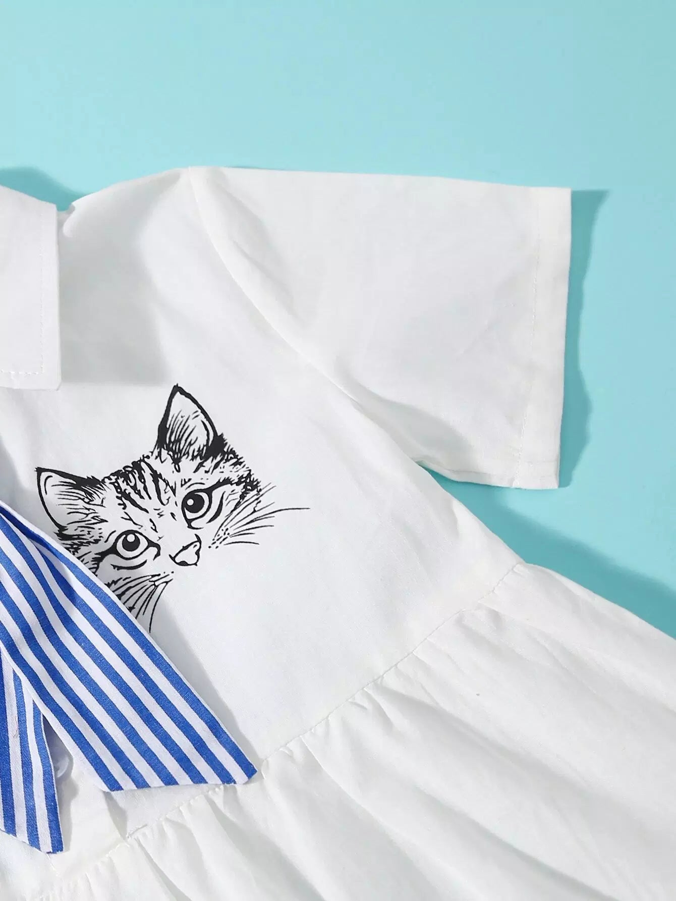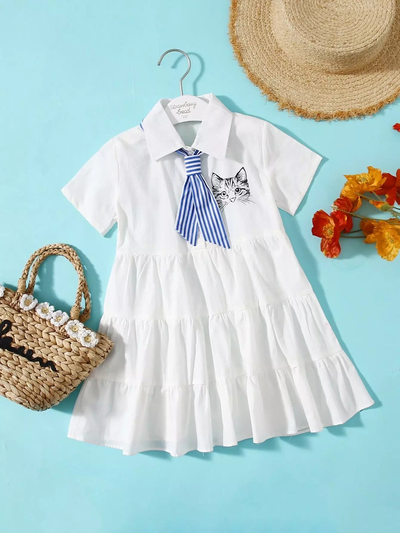 فستان بناتي صغيرات 1 قطعة بطبعة قطط مع ربطة عنق
