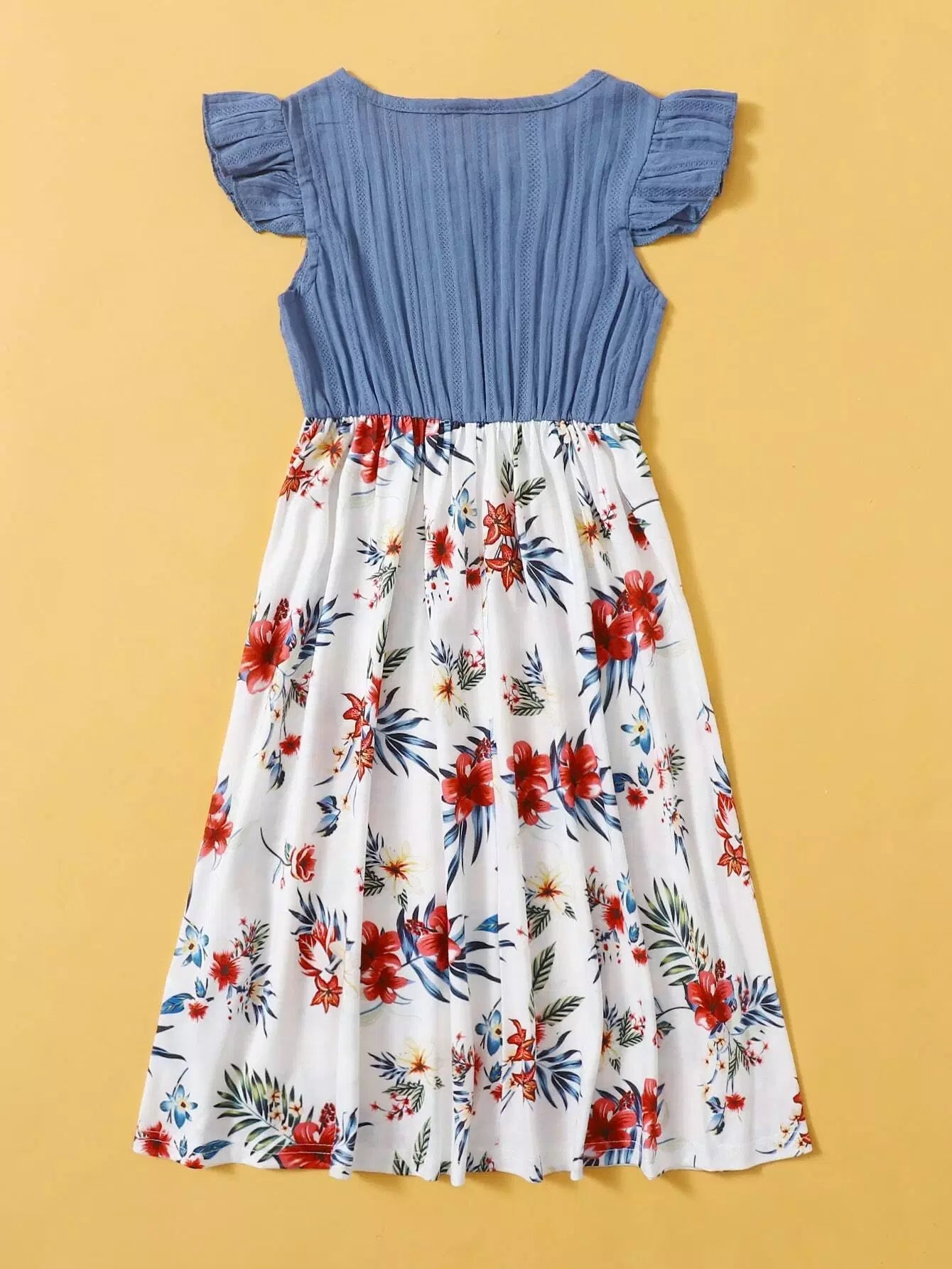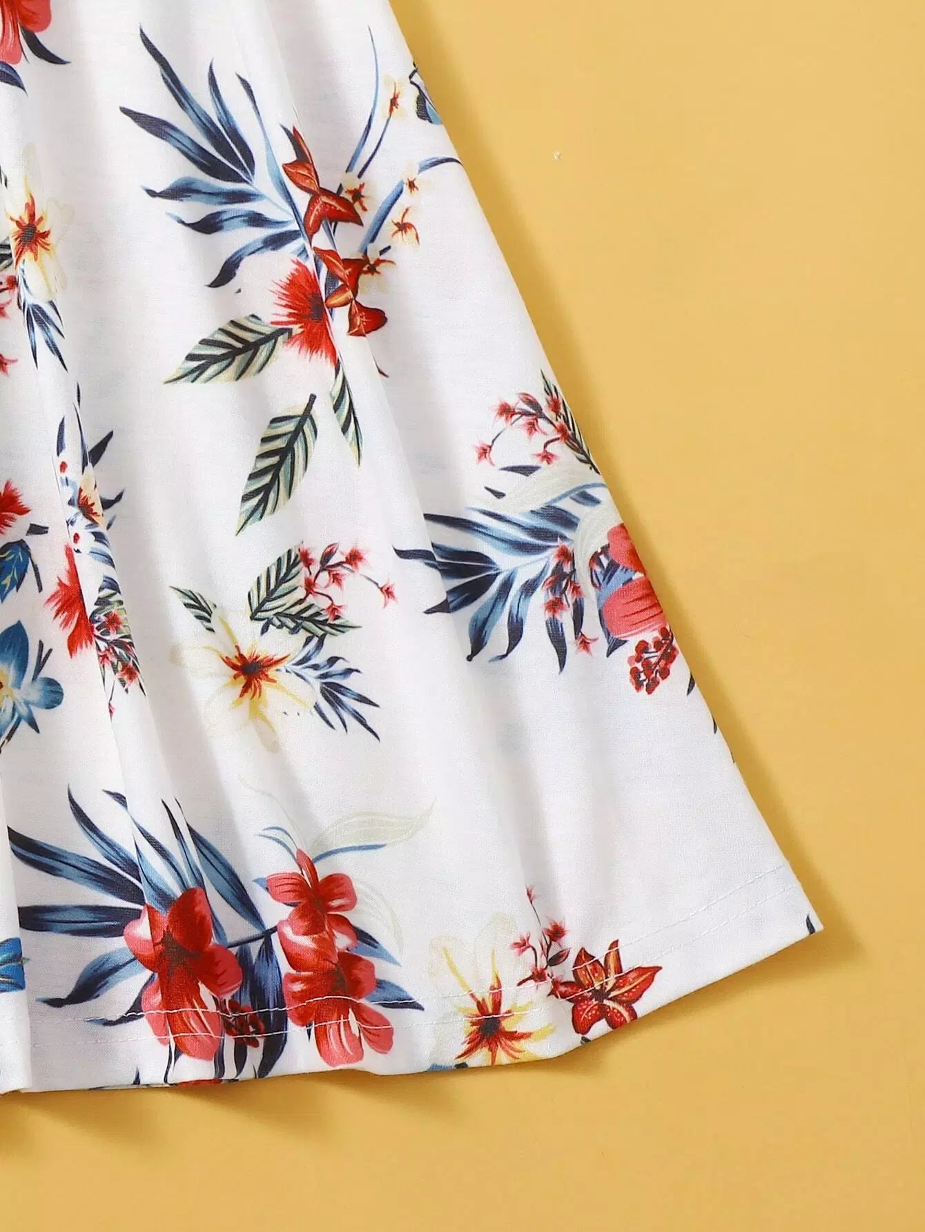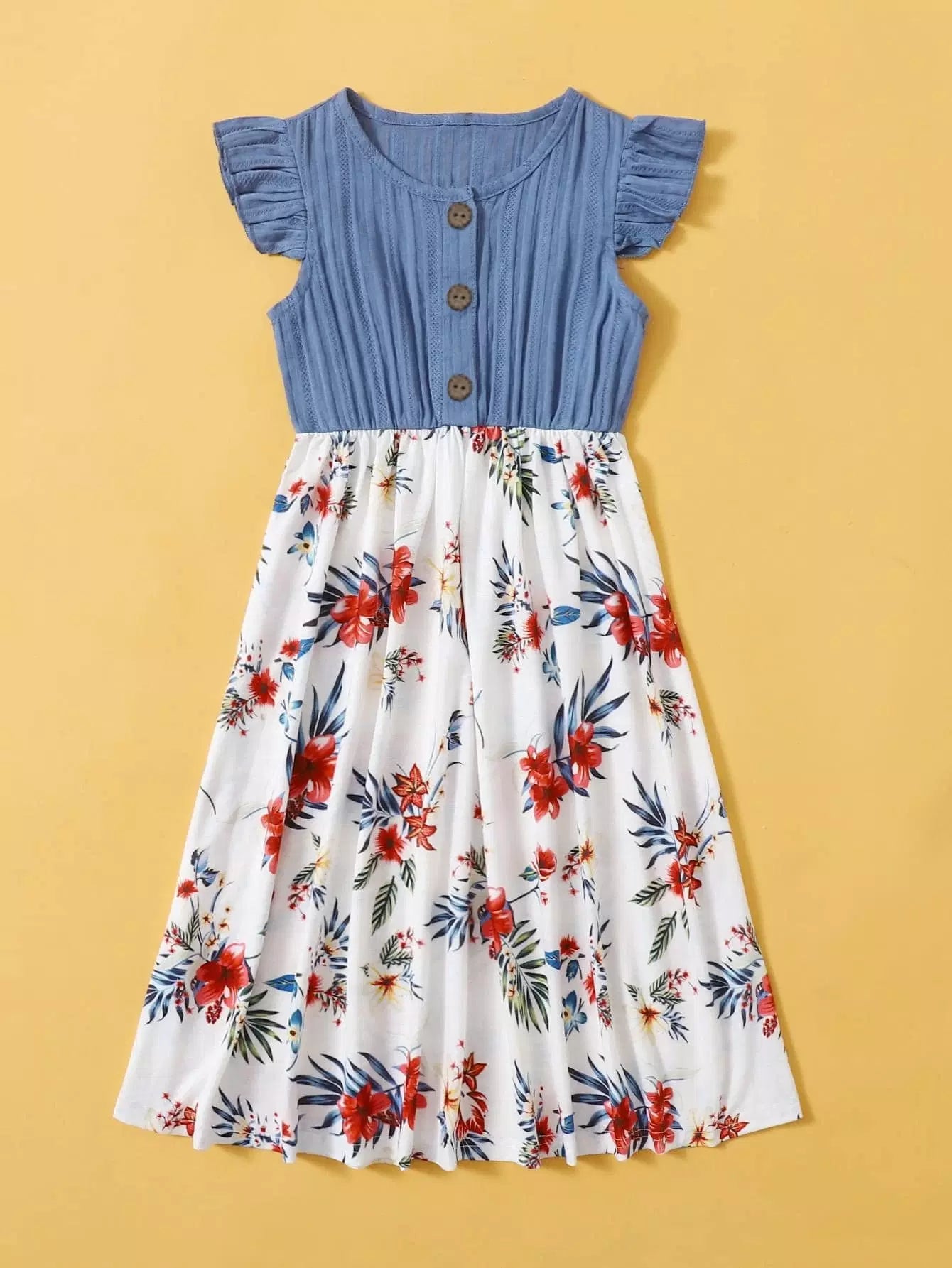 فستان بناتي صغيرات بطبعة أزهار بنصف زر على شكل حرف A بنصف قطعة