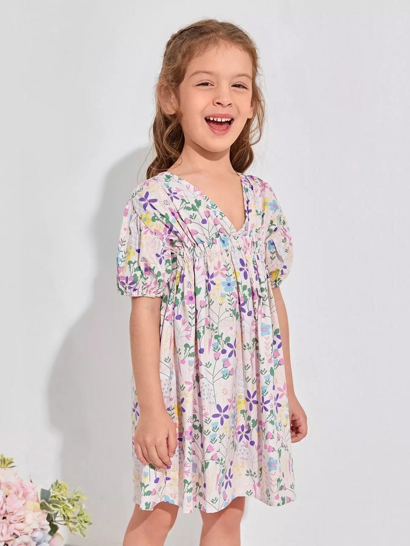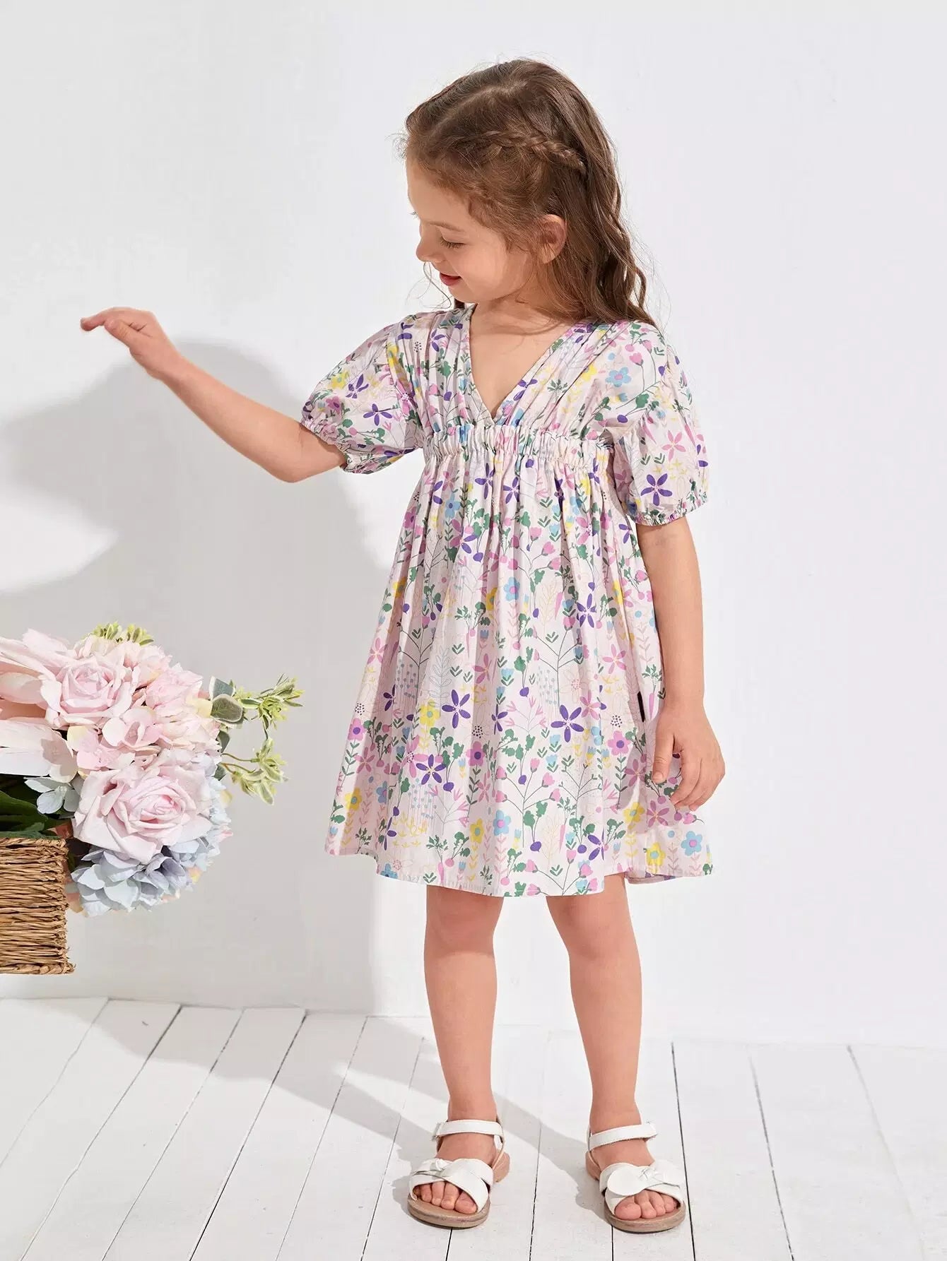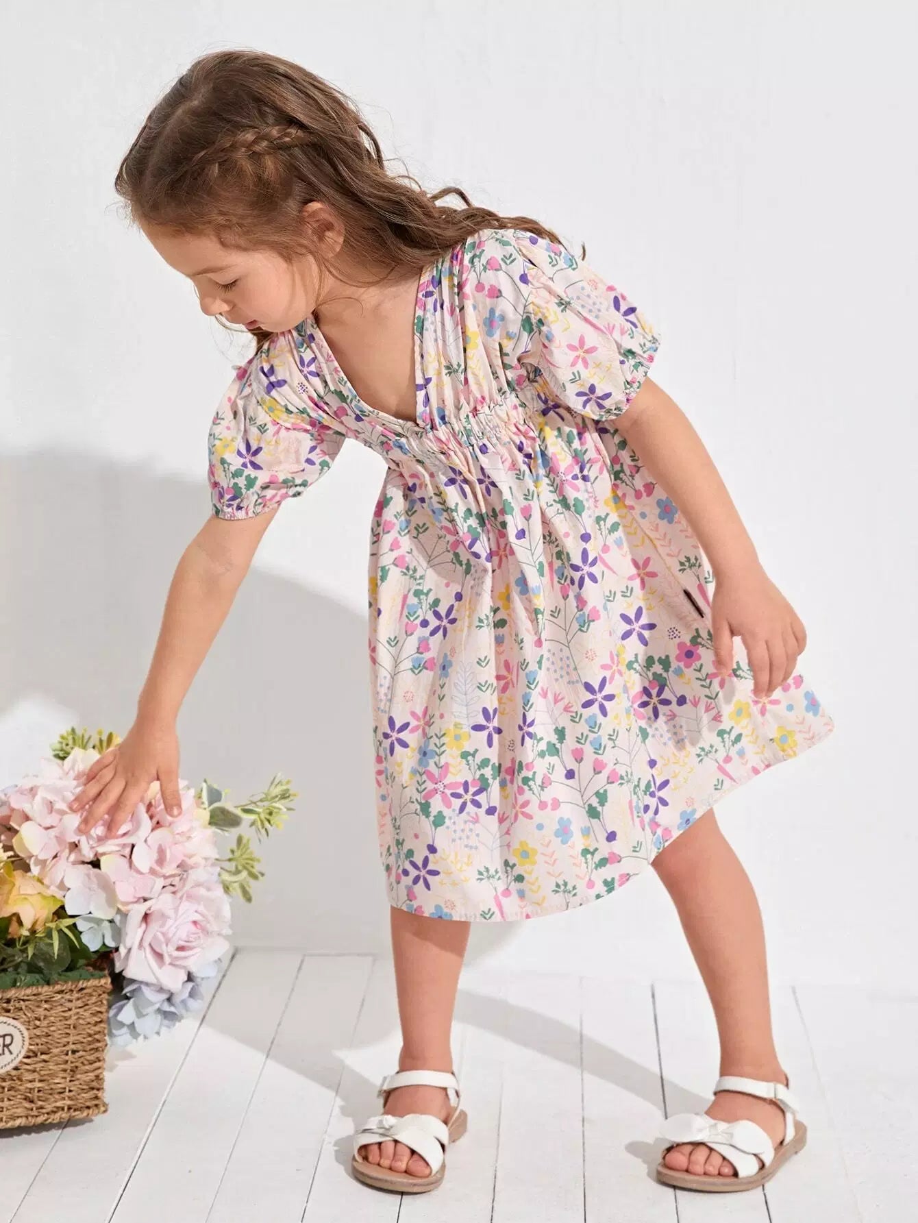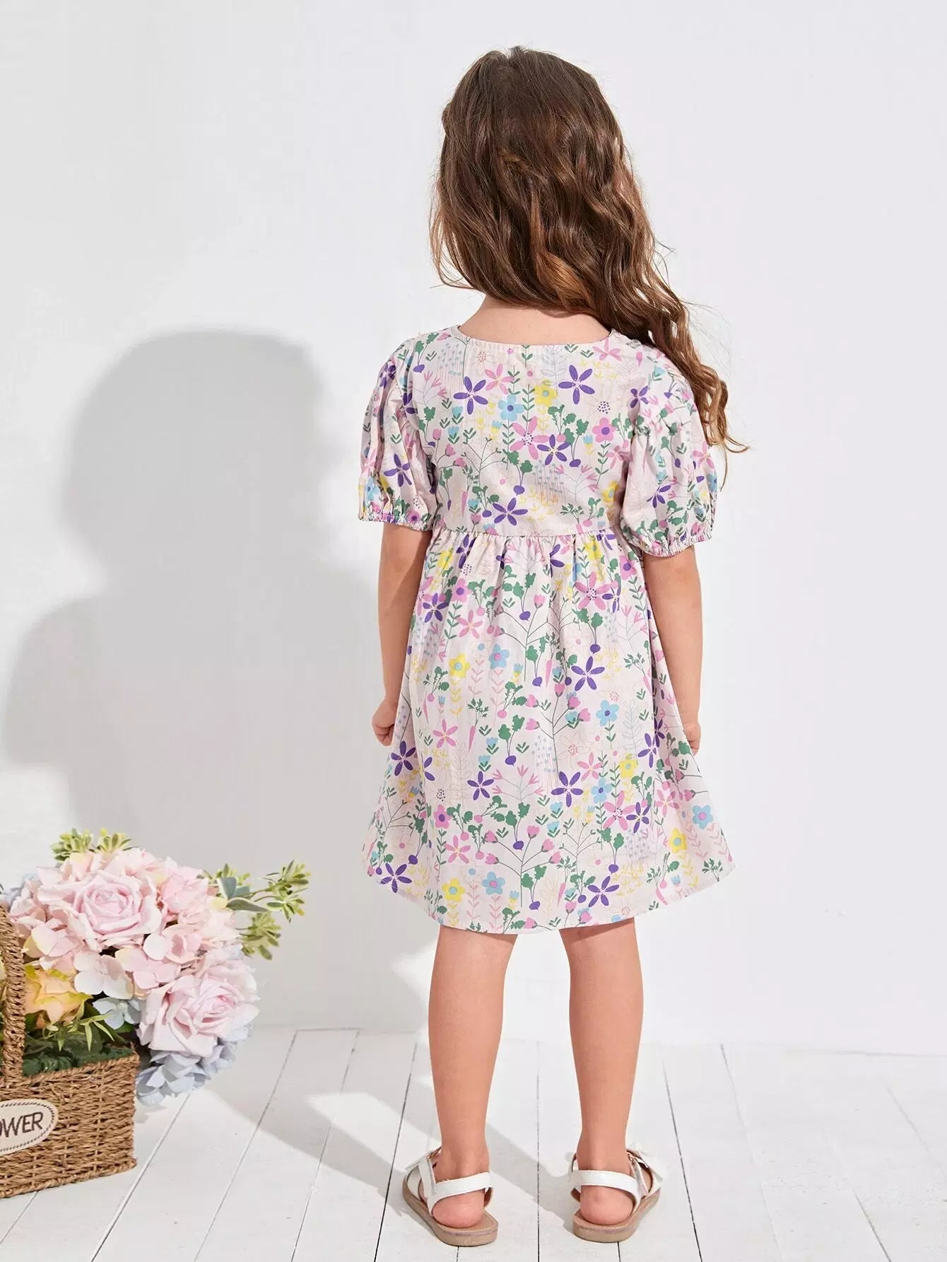 فستان بناتي صغيرات بطبعة زهور على كامل الخصر عالي الخصر