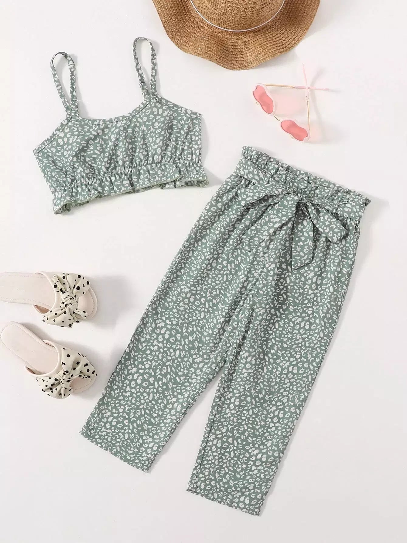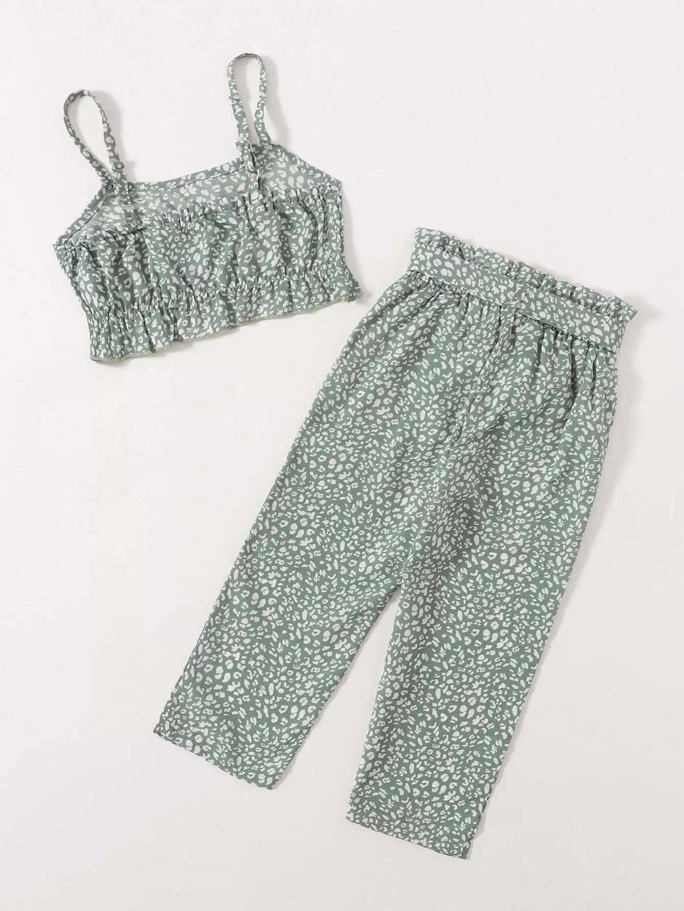 بلوزة وسروال كامي مطبوع بالكامل للفتيات الصغيرات بدون حزام