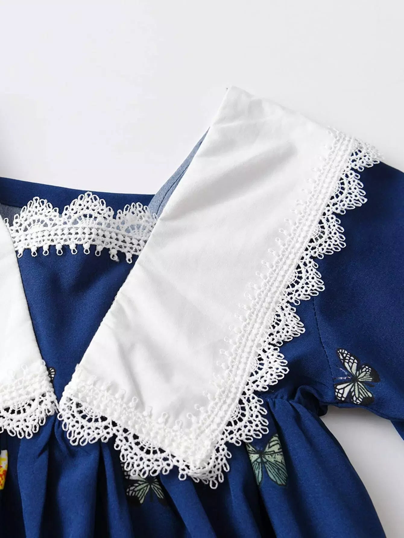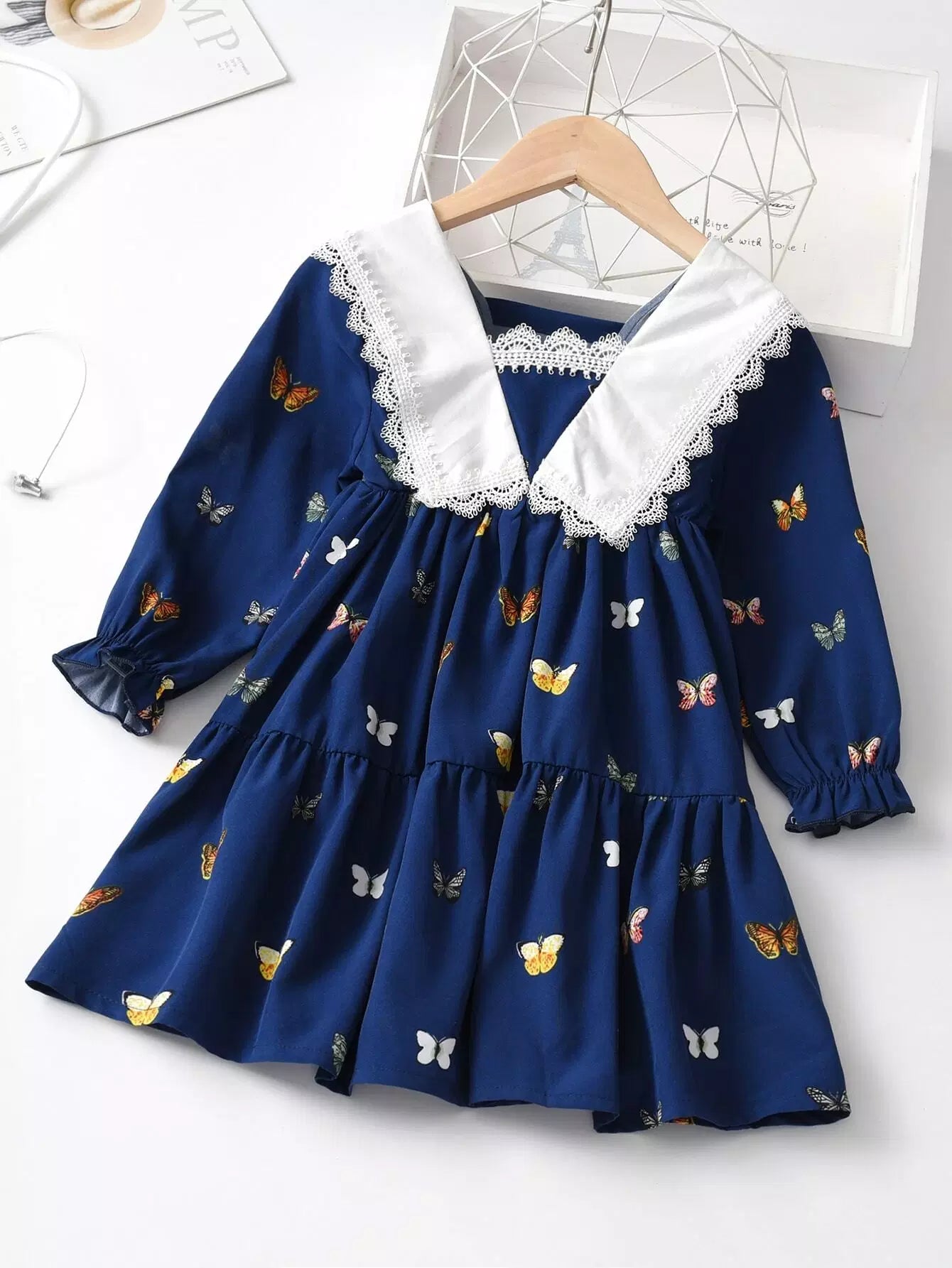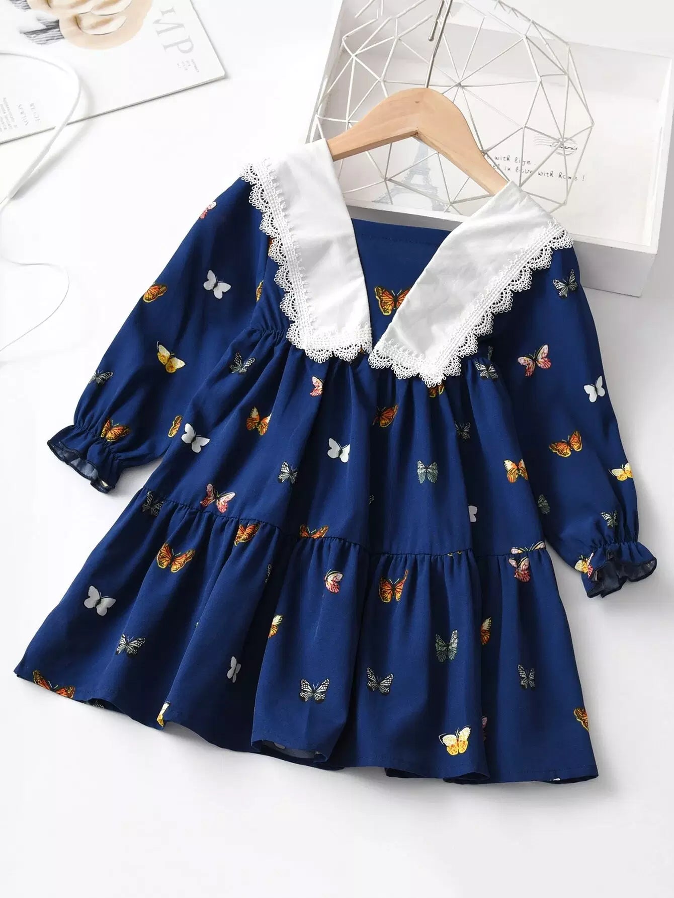 فستان بنات صغيرات بطبعة فراشات بياقة بلون مغاير
