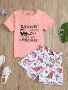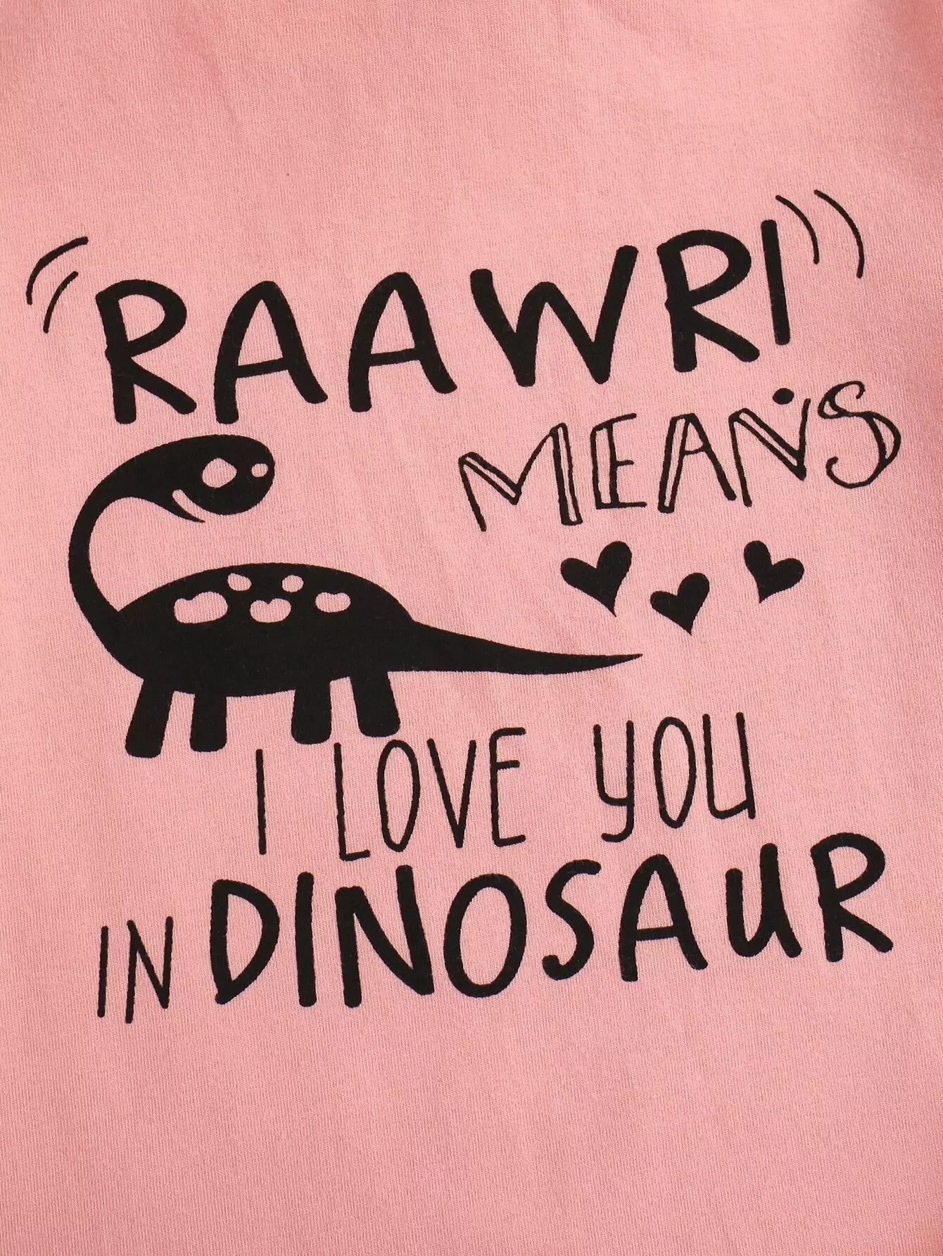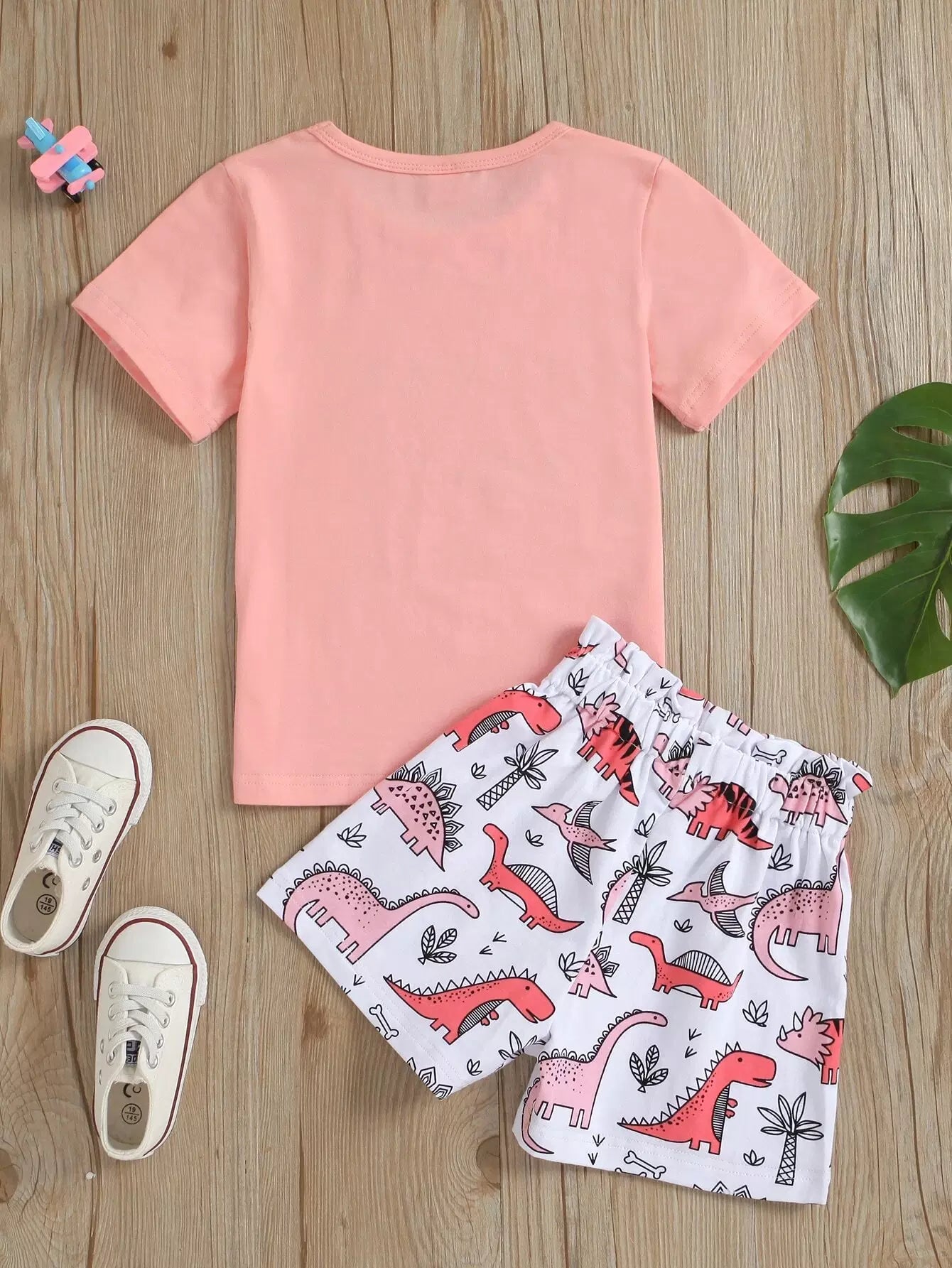 تي شيرت برسومات ديناصور وشعار ديناصور كرتوني للبنات الصغار مع شورت