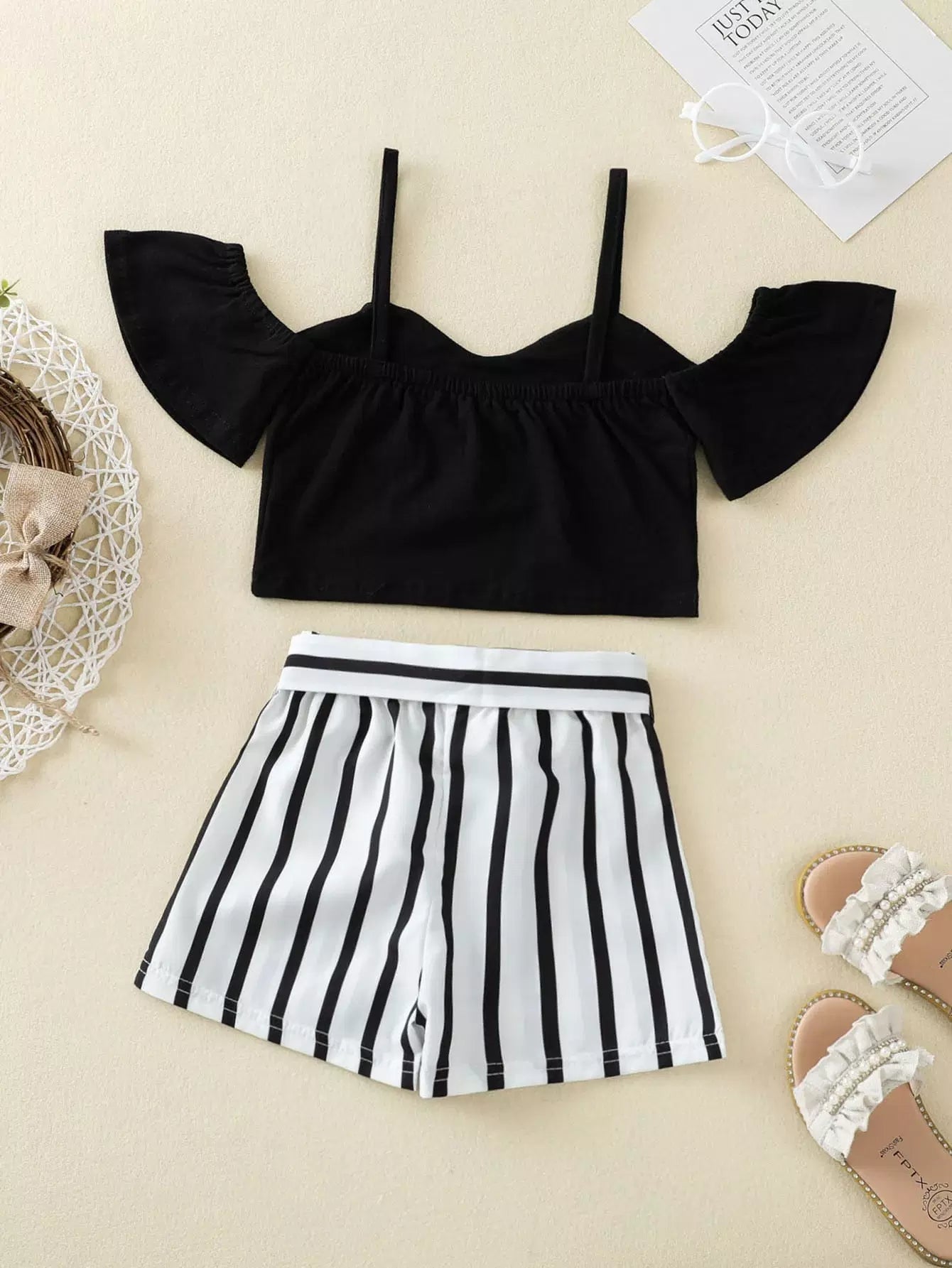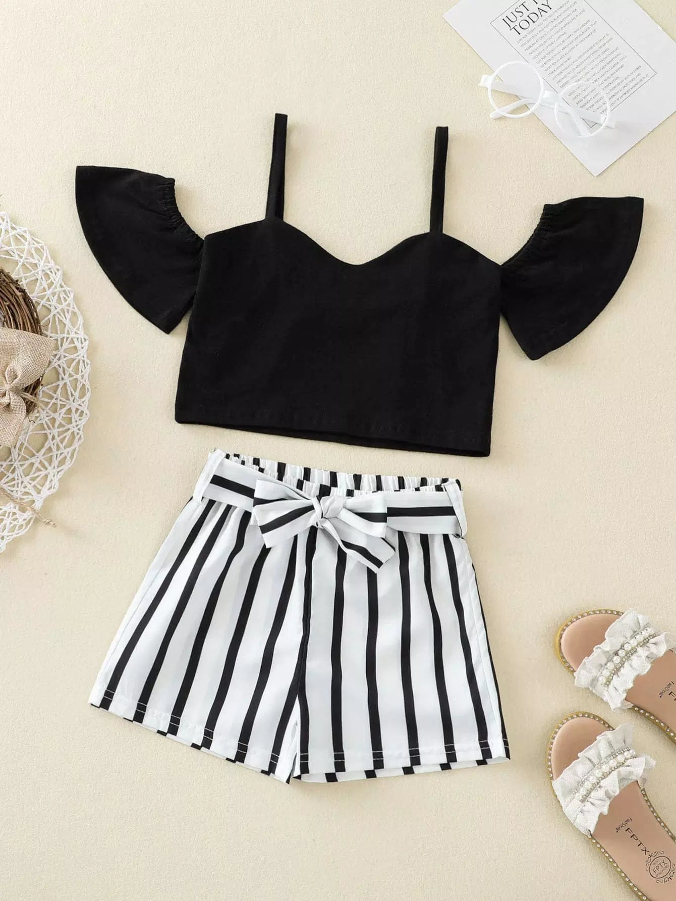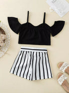 الأطفال - بلوزة بأكتاف مكشوفة للفتيات الصغيرات مع شورت مخطط بحزام