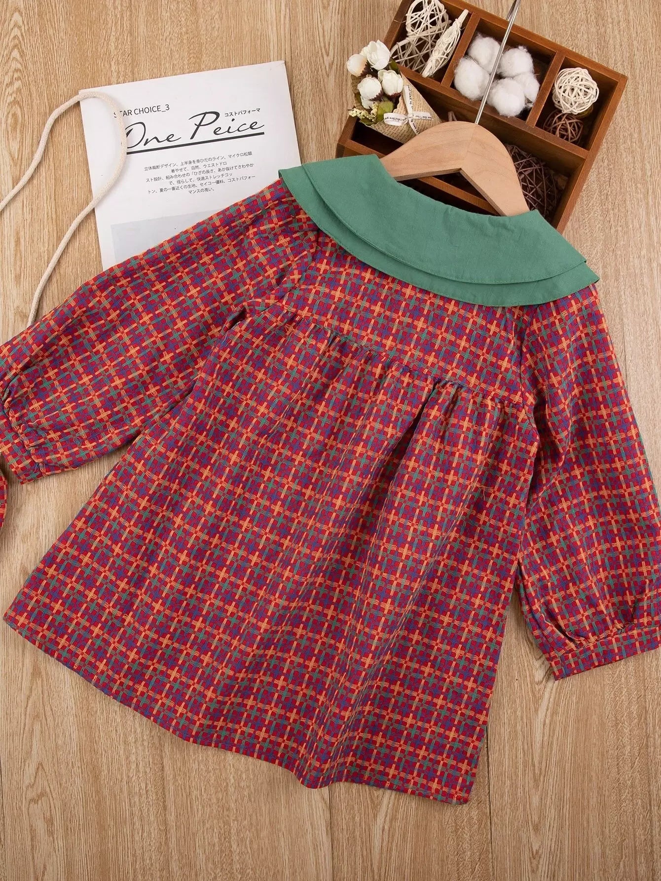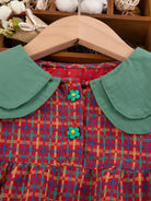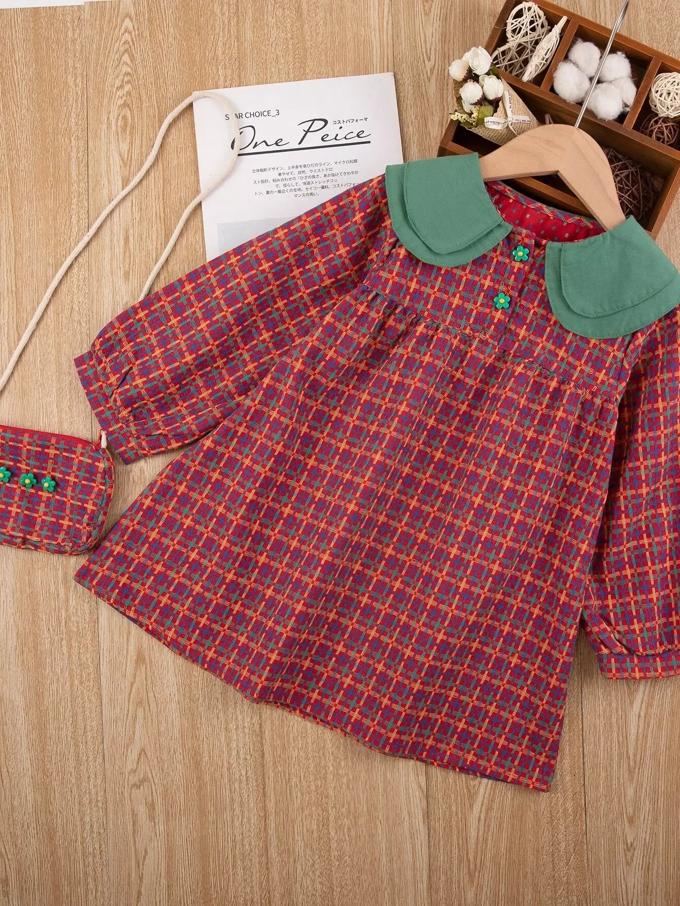 فستان بنات صغيرات بياقة دمية منقوشة بلون مغاير وحقيبة