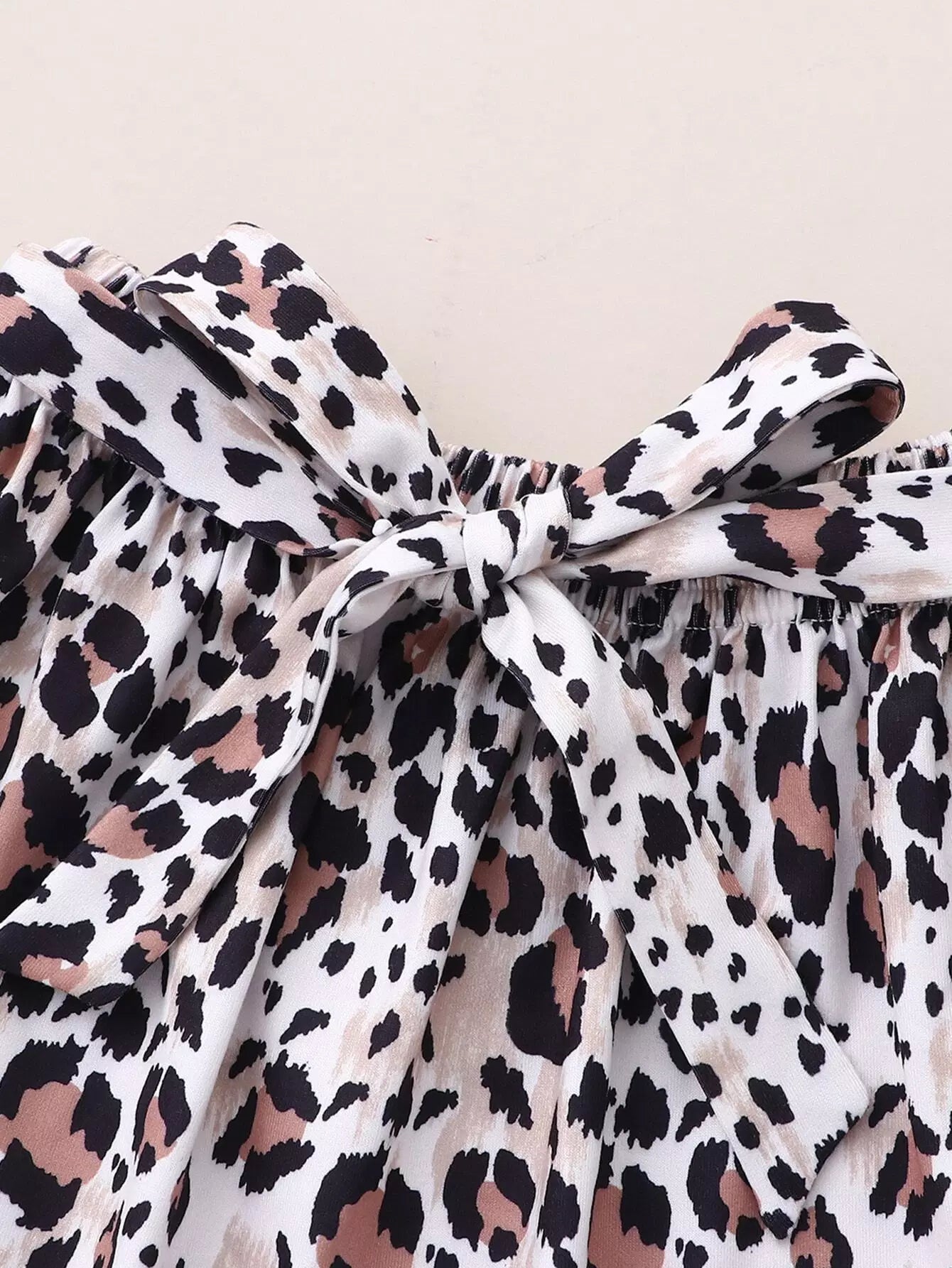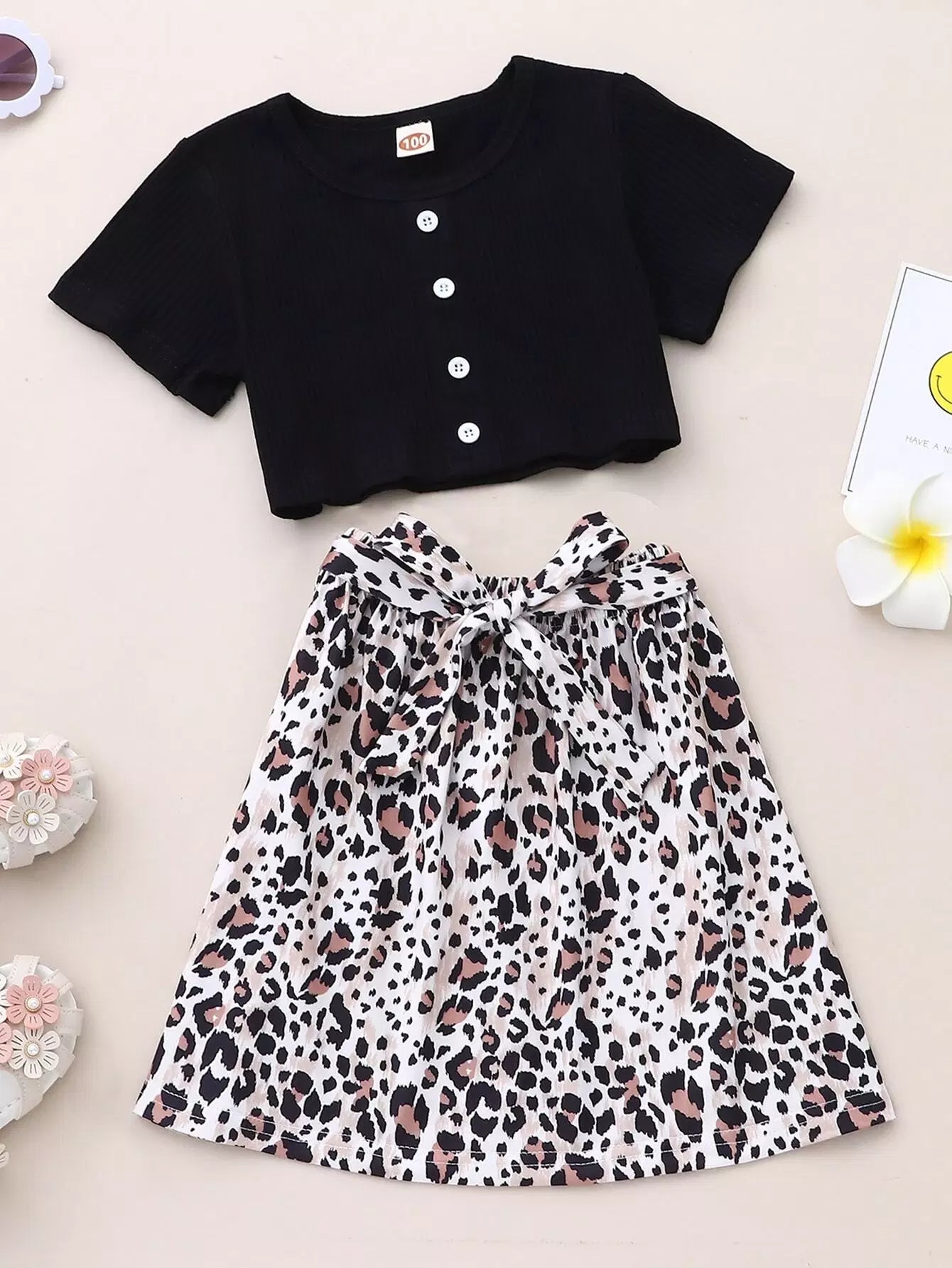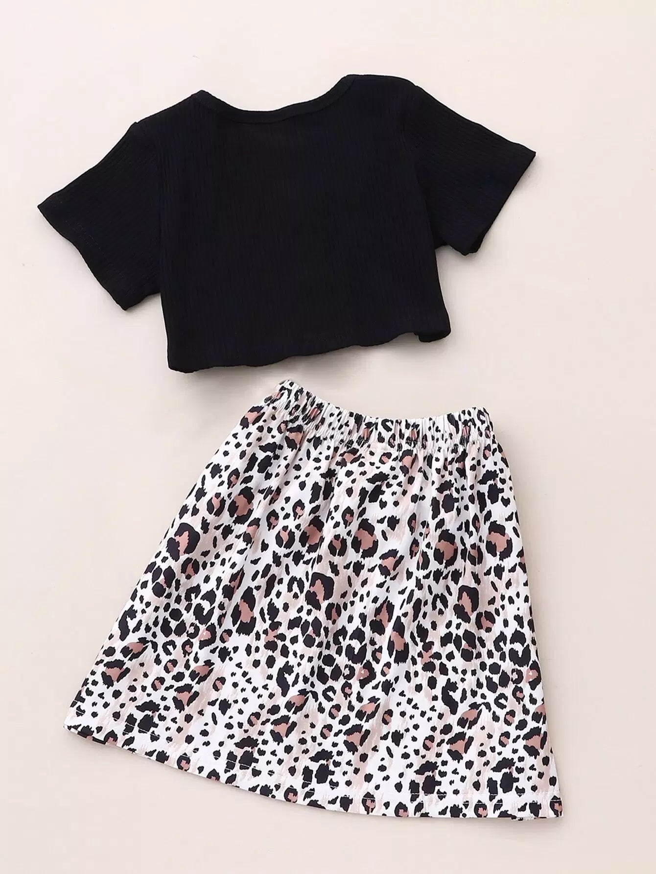 تي شيرت قصير للفتيات الصغيرات وتنورة مطبوعة بالكامل بدون حزام