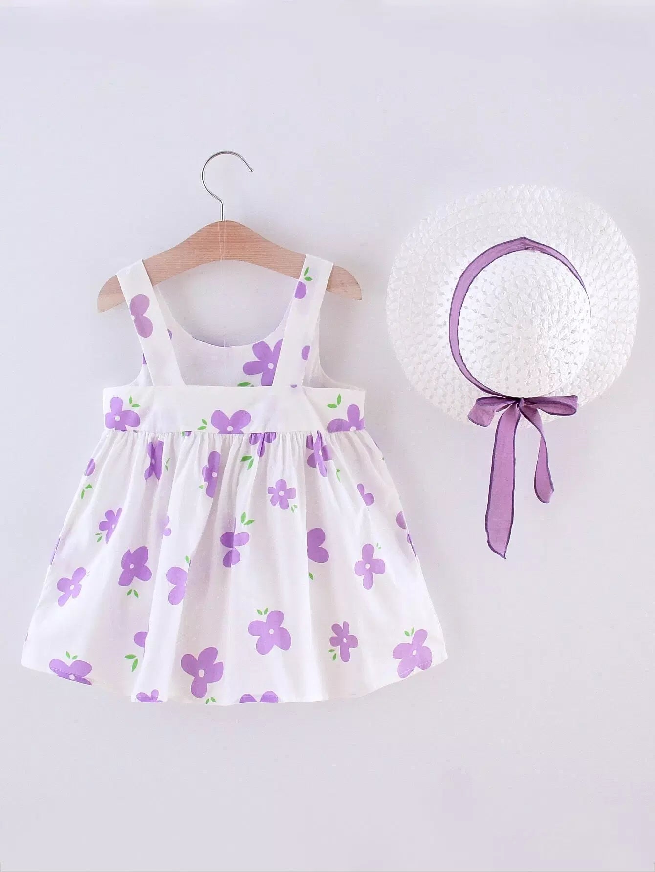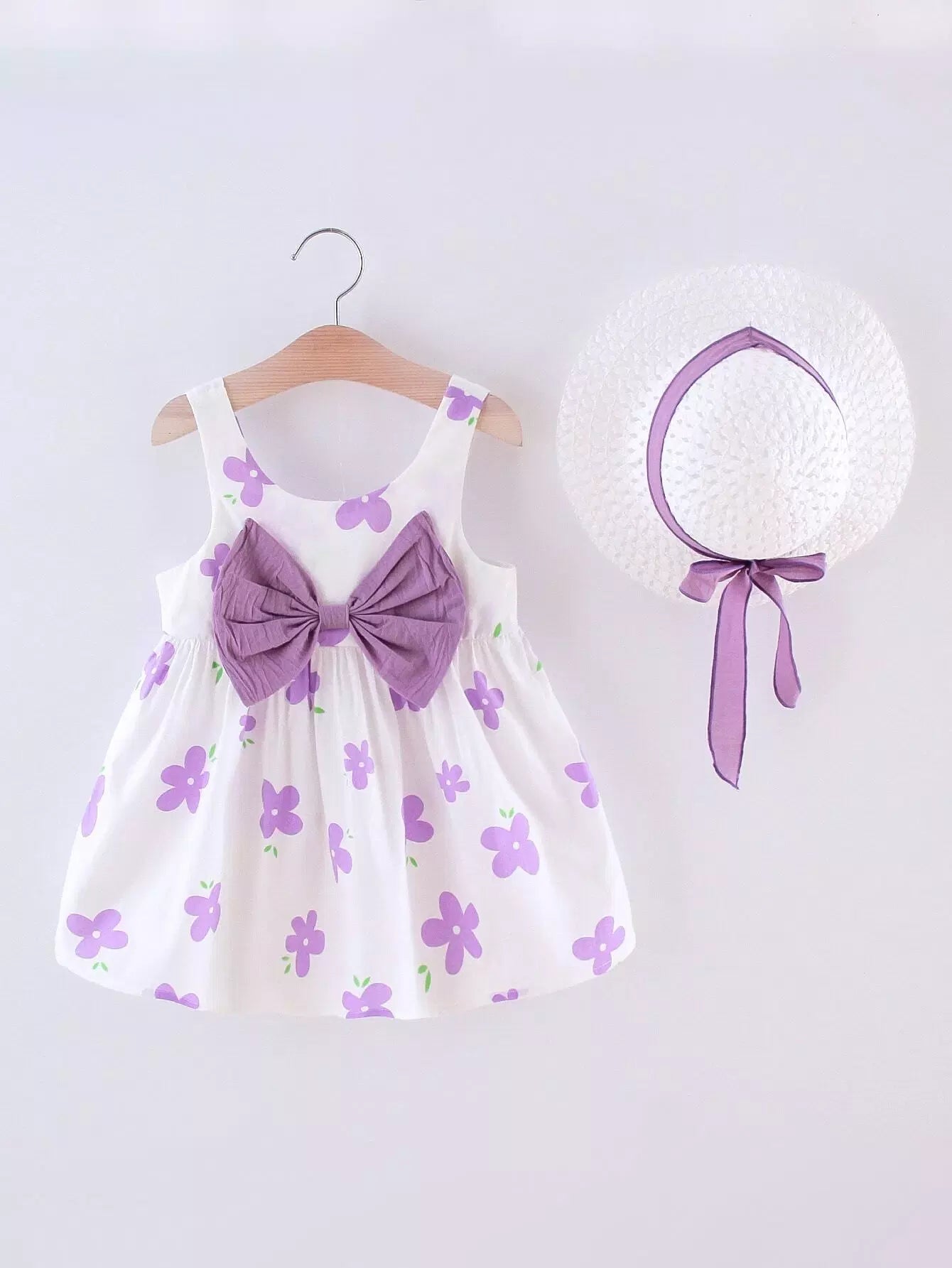 فستان بناتي صغيرات بقبعة مزين بعقدة زهور أمامية للبنات