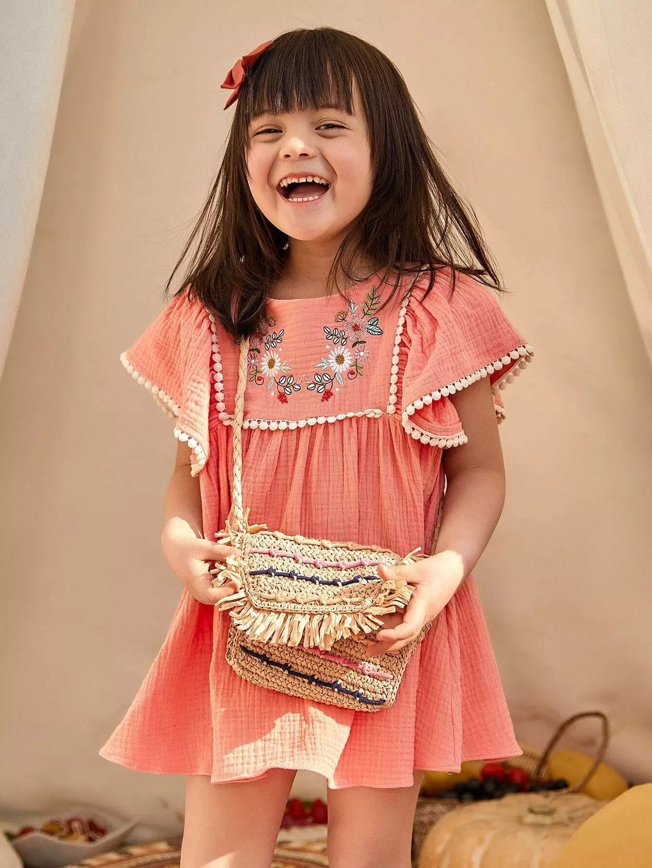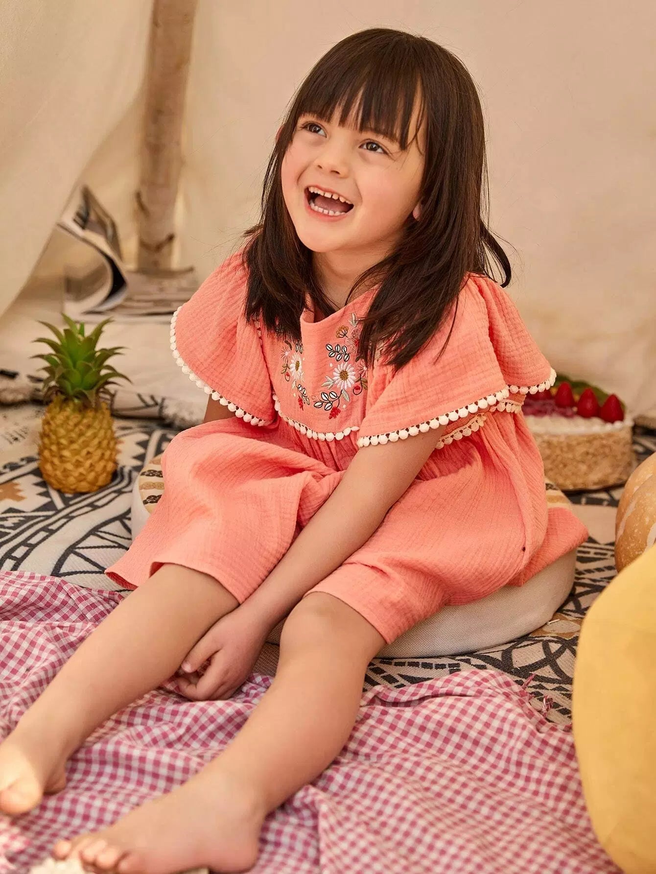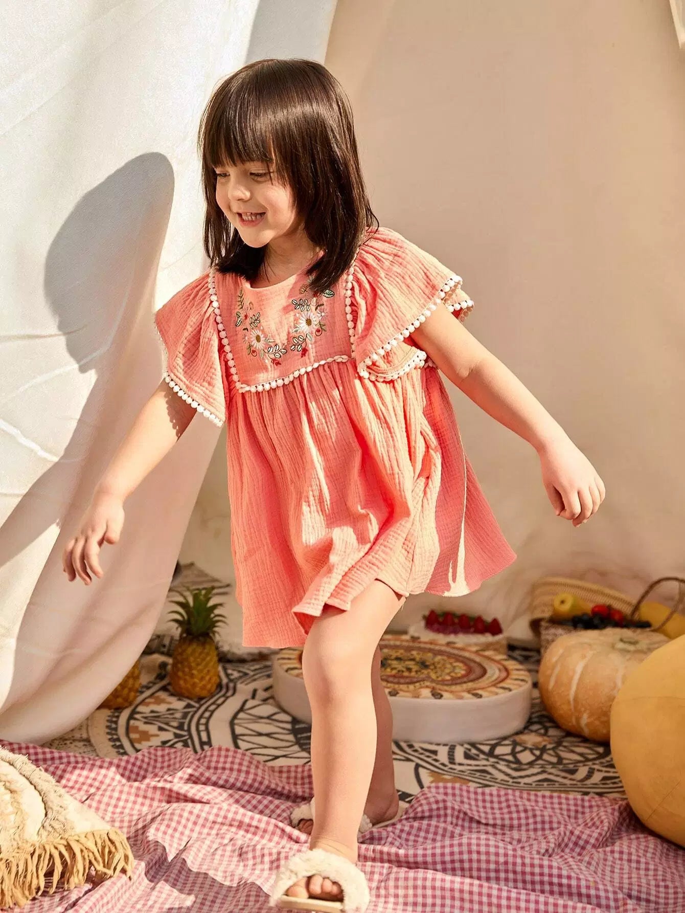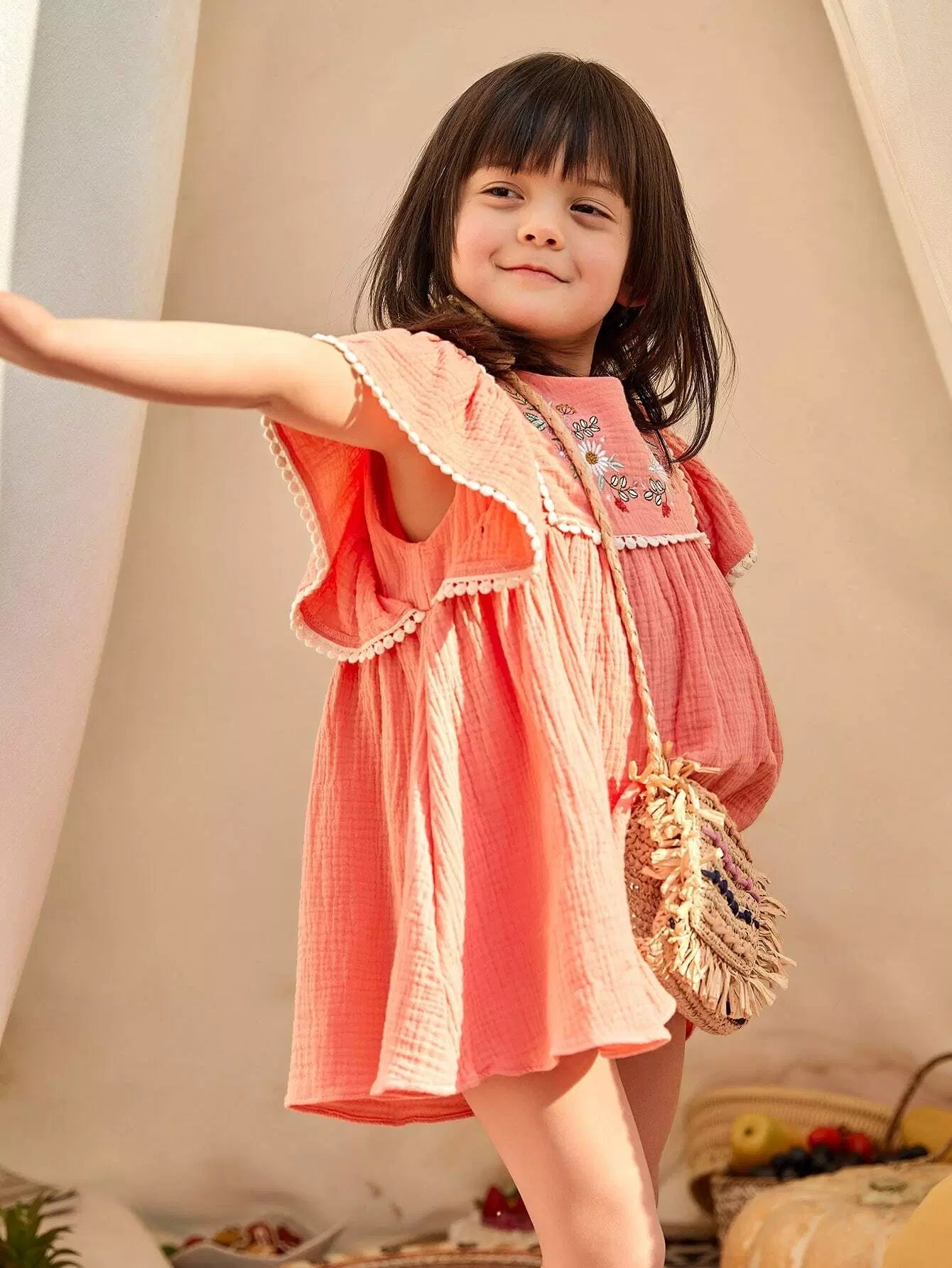 فستان قصير من الدانتيل مزين بنقاط مطرزة بالزهور للفتيات الصغيرات