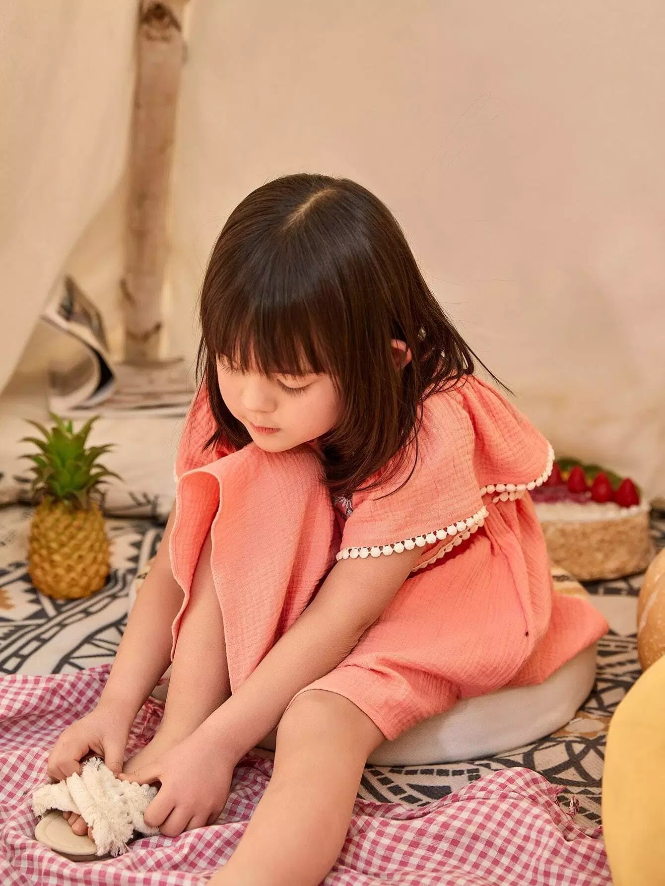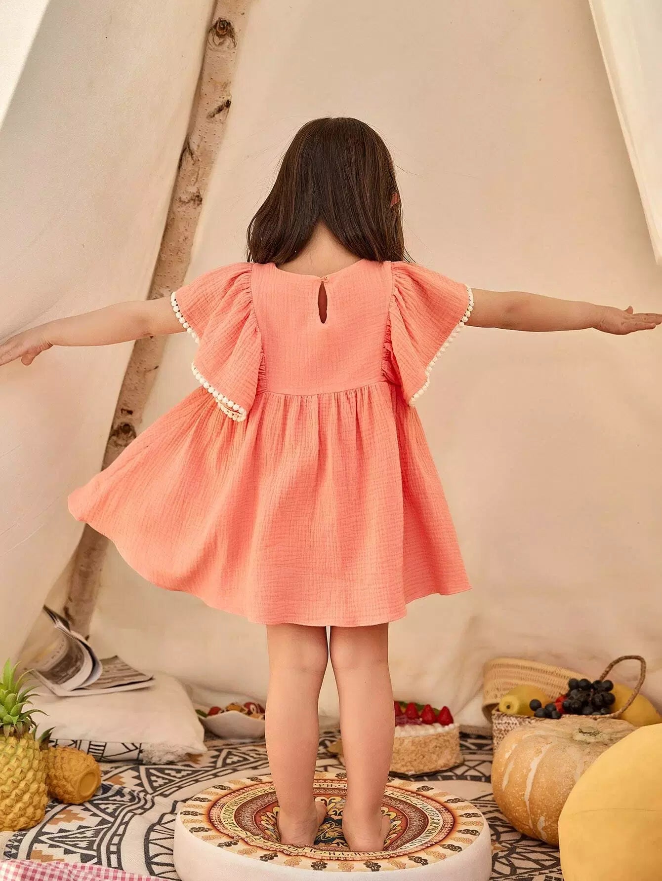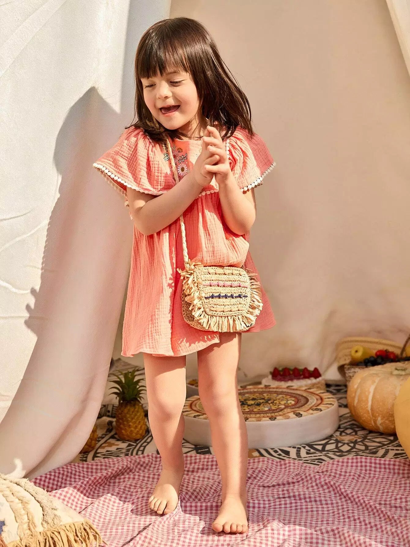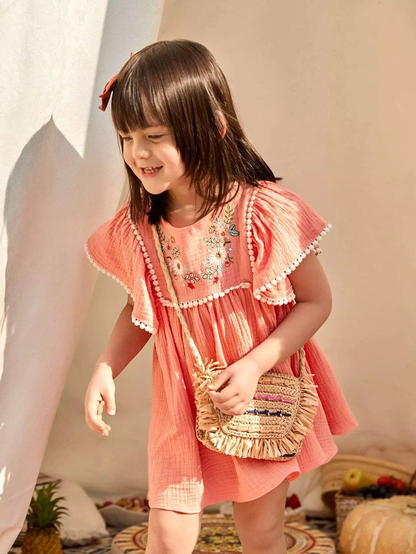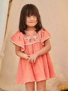 فستان قصير من الدانتيل مزين بنقاط مطرزة بالزهور للفتيات الصغيرات