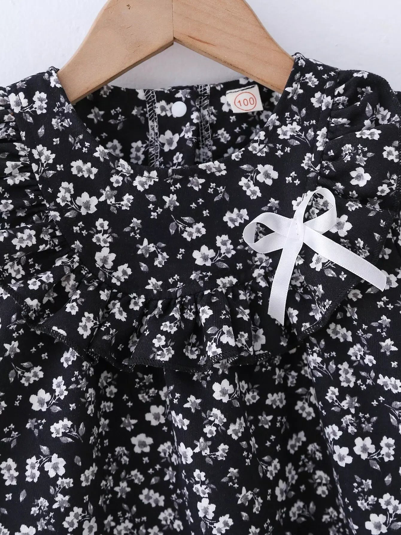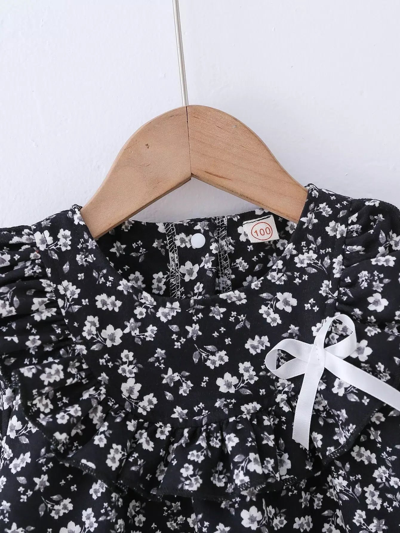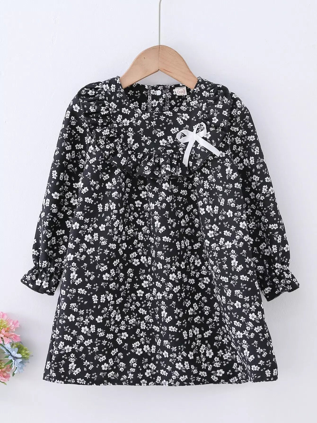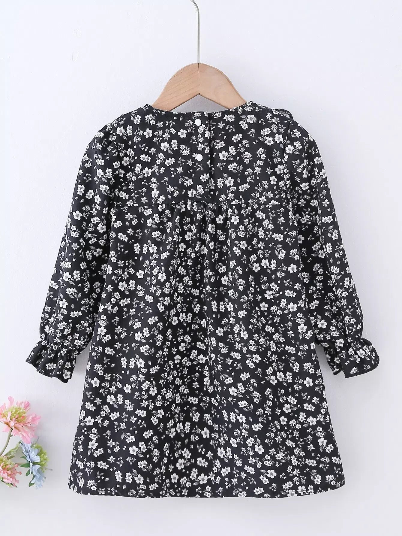 - فستان أمامي للفتيات الصغيرات بطباعة ورود وأكمام مكشكشة وأكمام واسعة