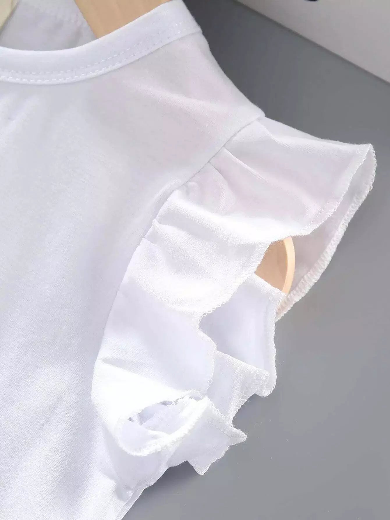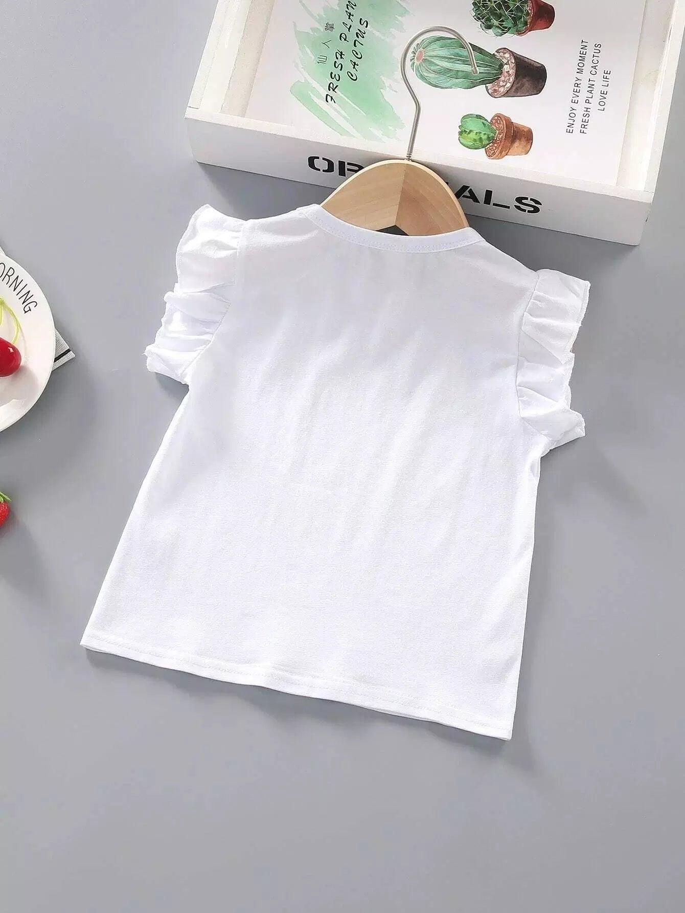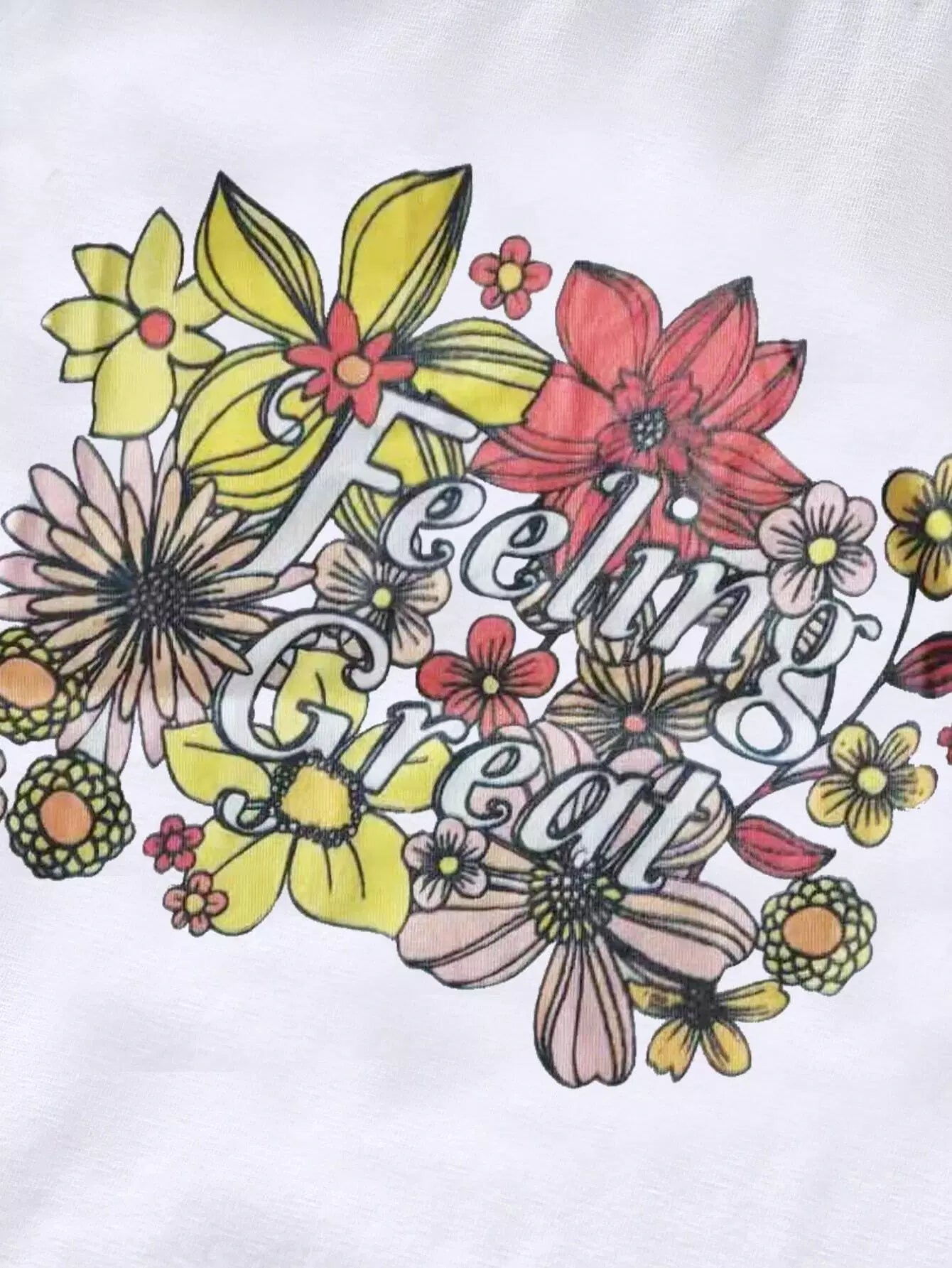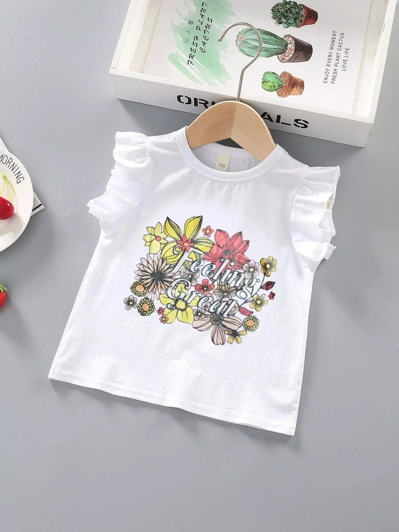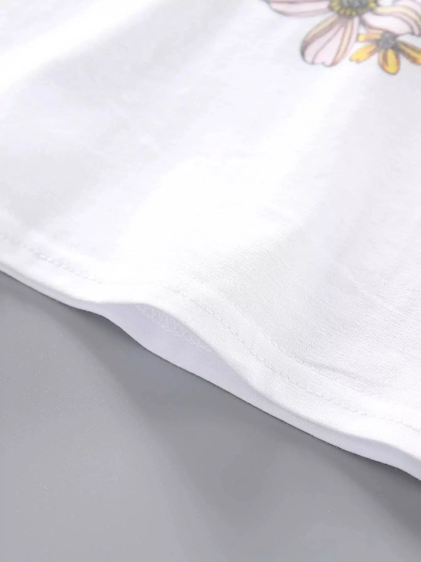 تي شيرت بناتي صغيرات مزين بالزهور والشعارات الجرافيكية