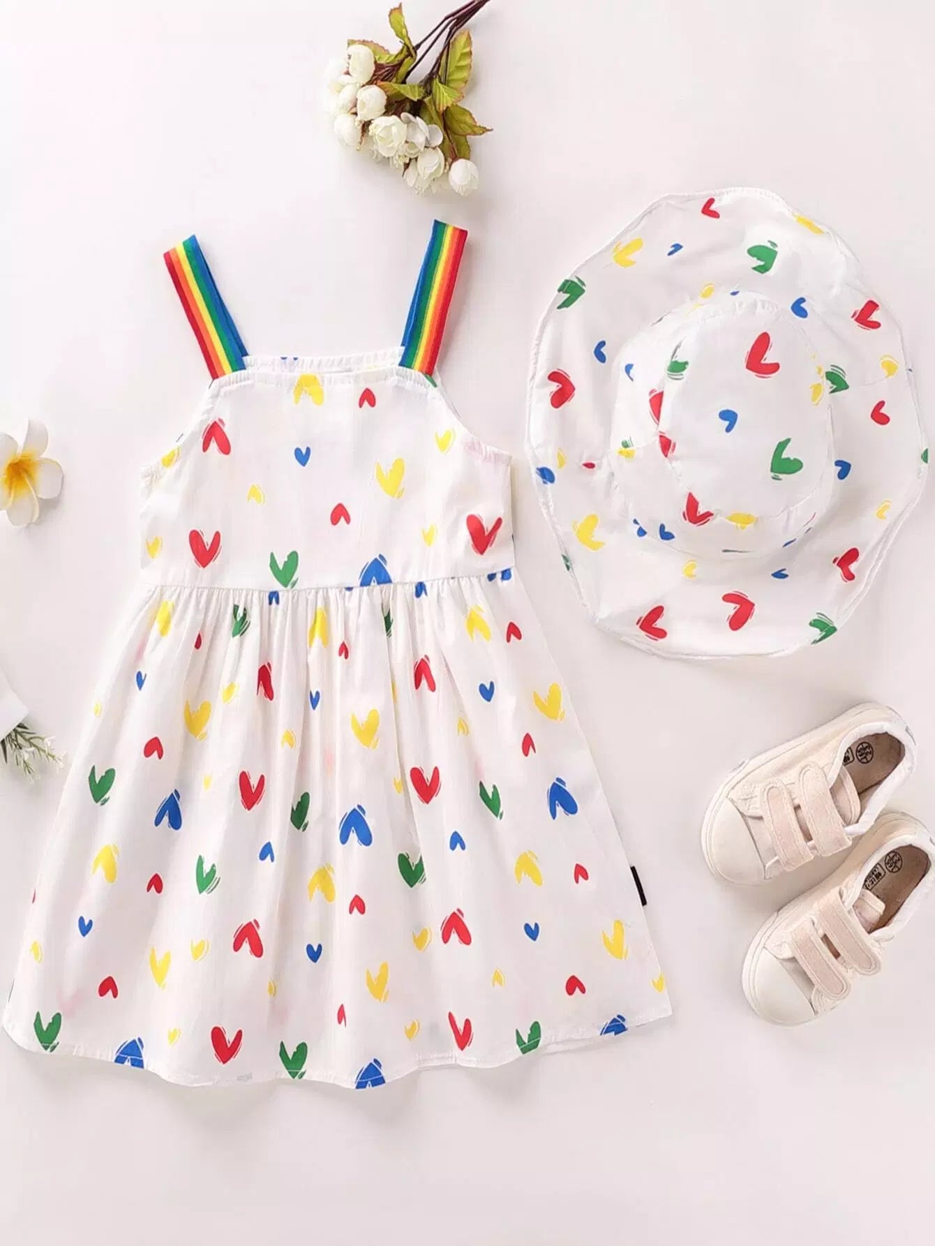 فستان وقبعة كامي مخطط على شكل قلب وقوس قزح للبنات الصغار