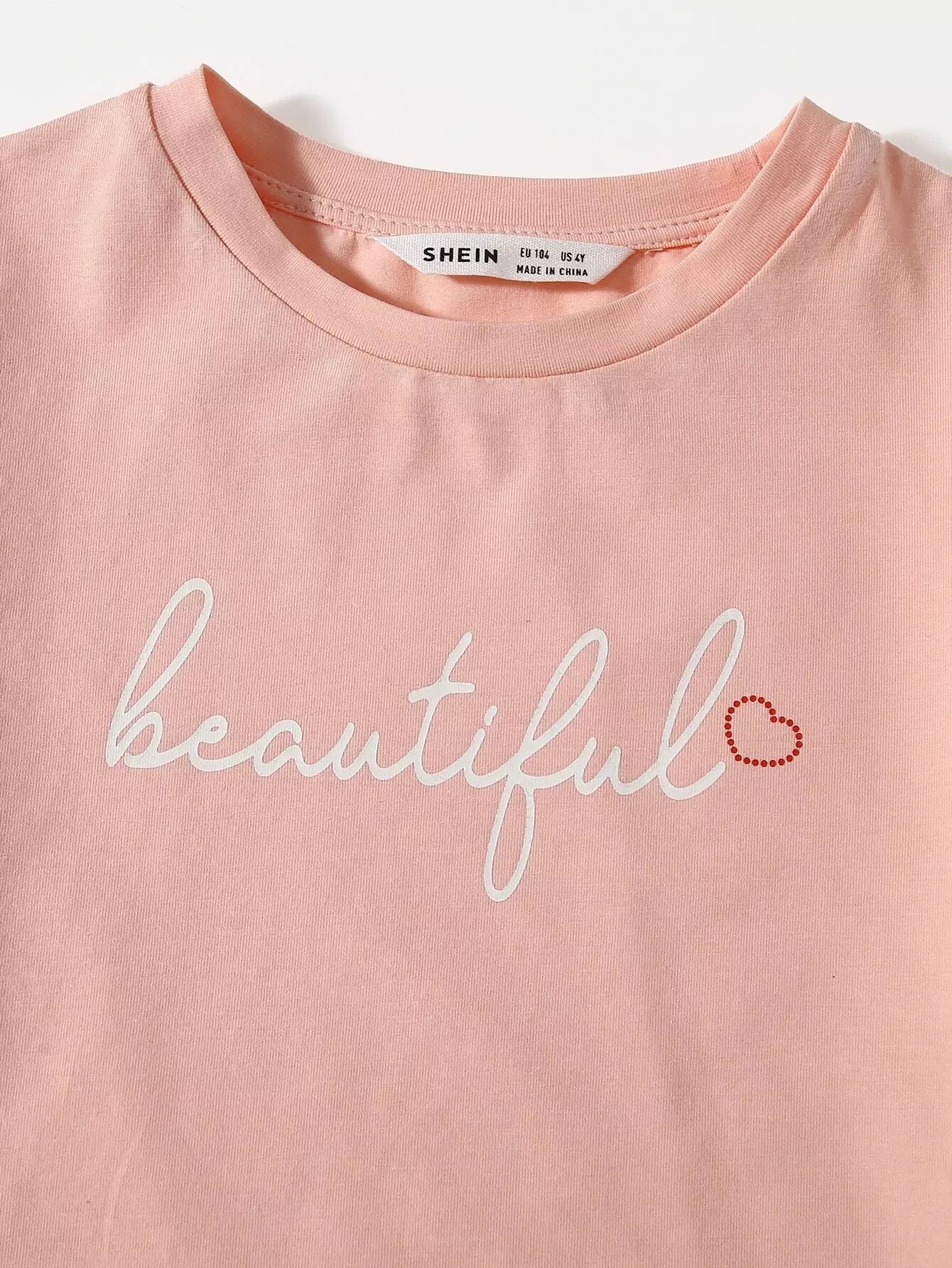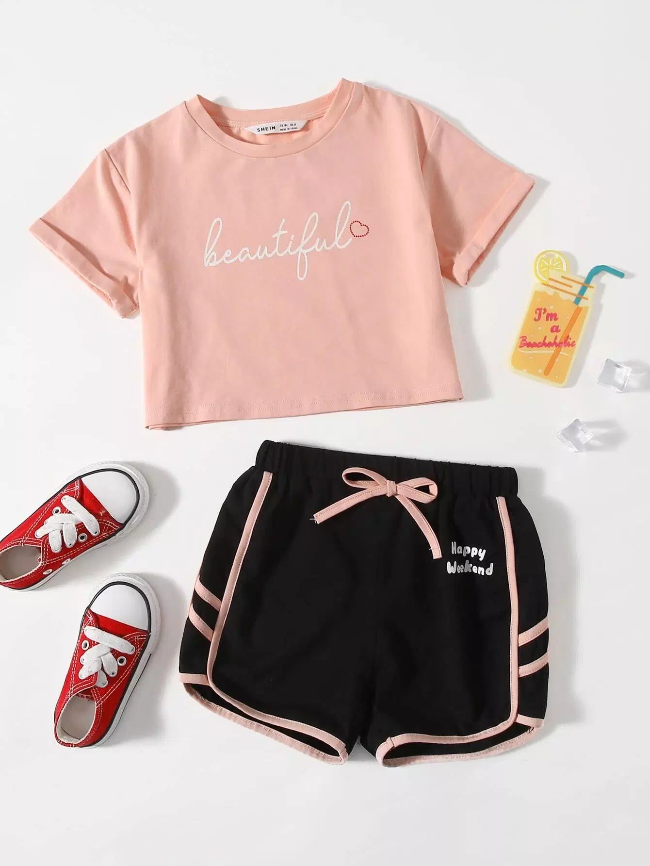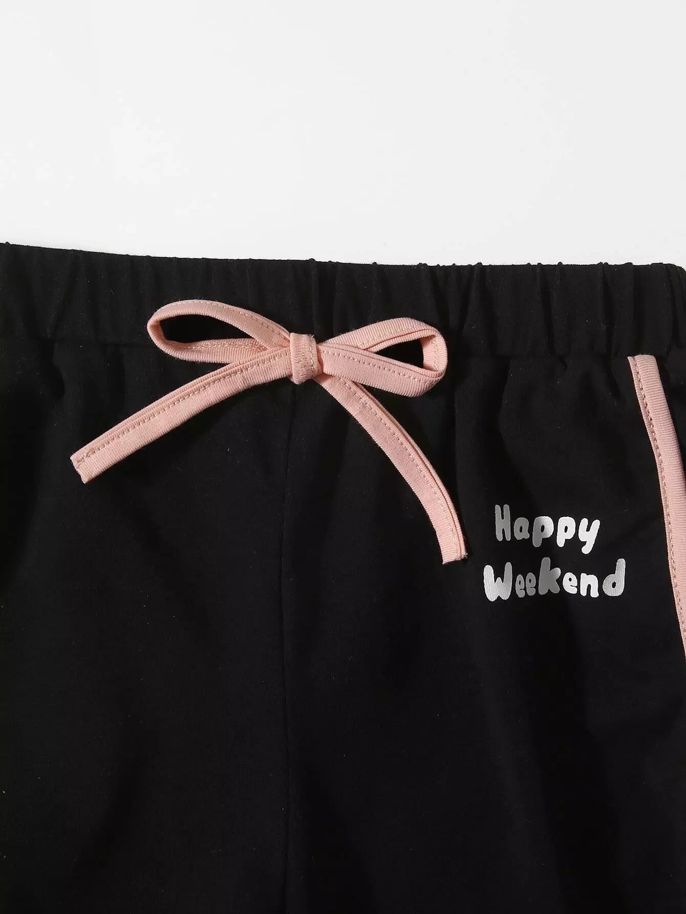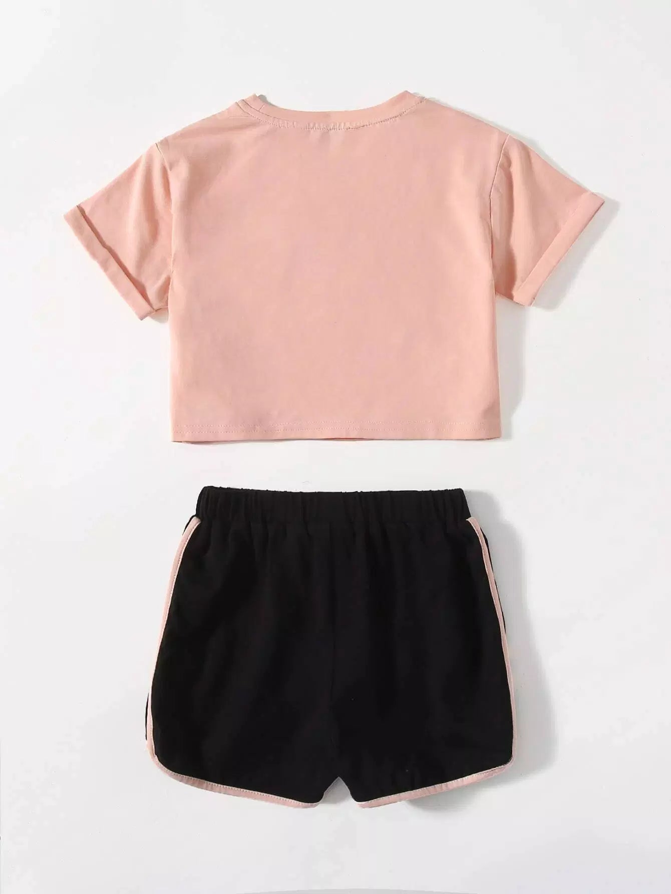 طقم تي شيرت بأكمام مطوية وشورت بعقدة أمامية مزين بحروف جرافيكية للبنات الصغار