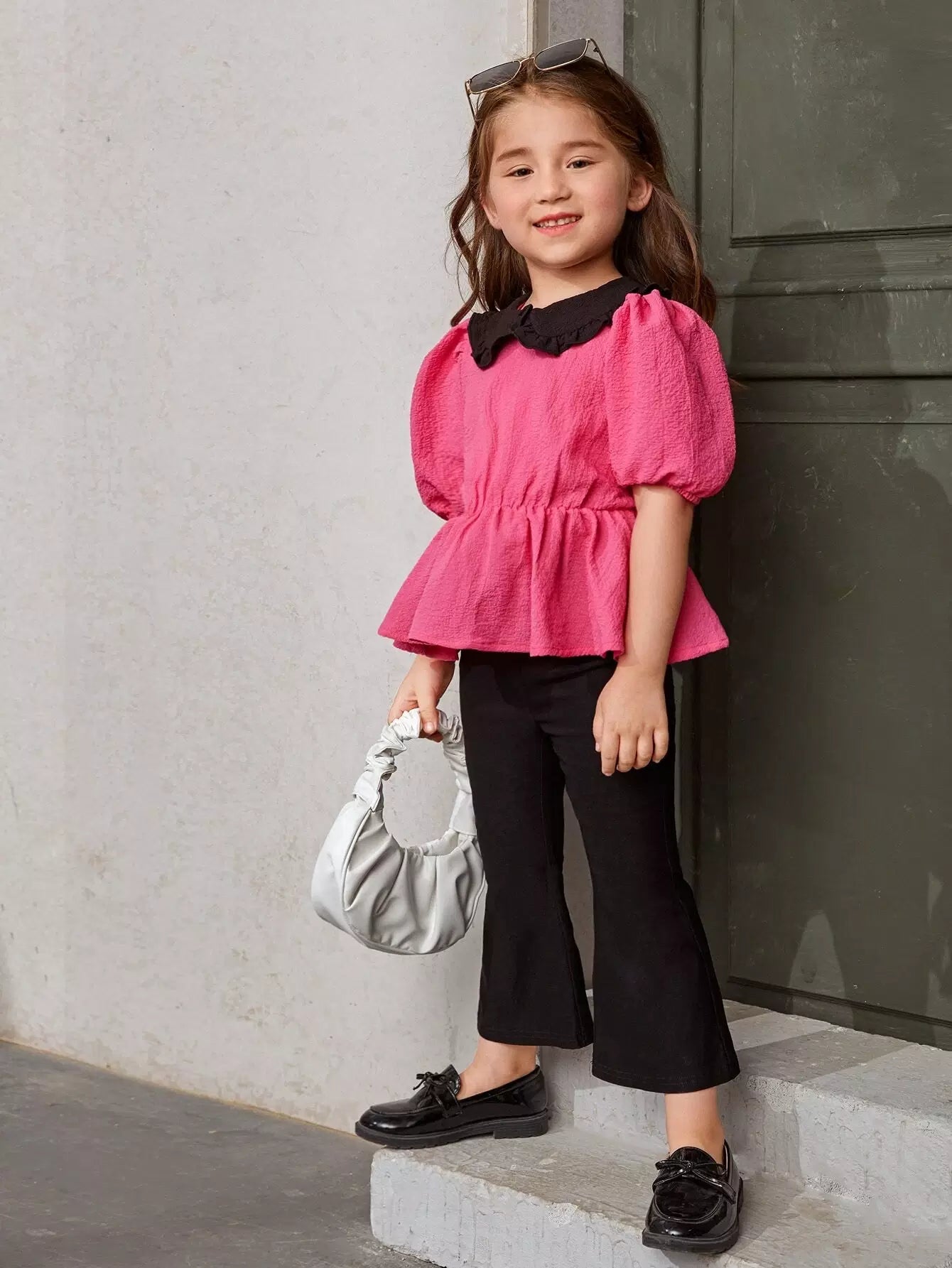 بلوزة بنمط ببلوم بأكمام منتفخة وياقة بيتر بان وبنطلون واسع الساق للفتيات الصغيرات