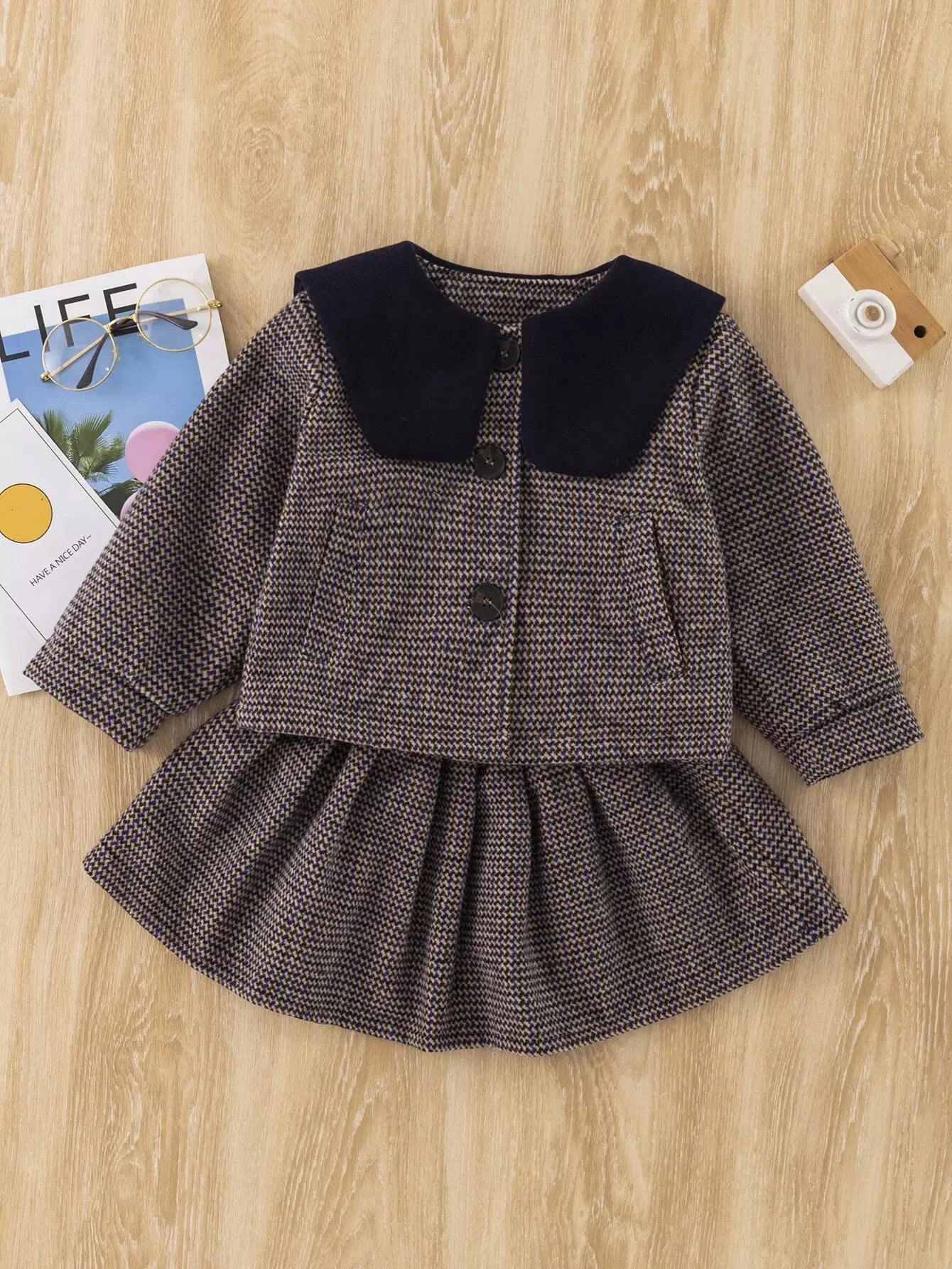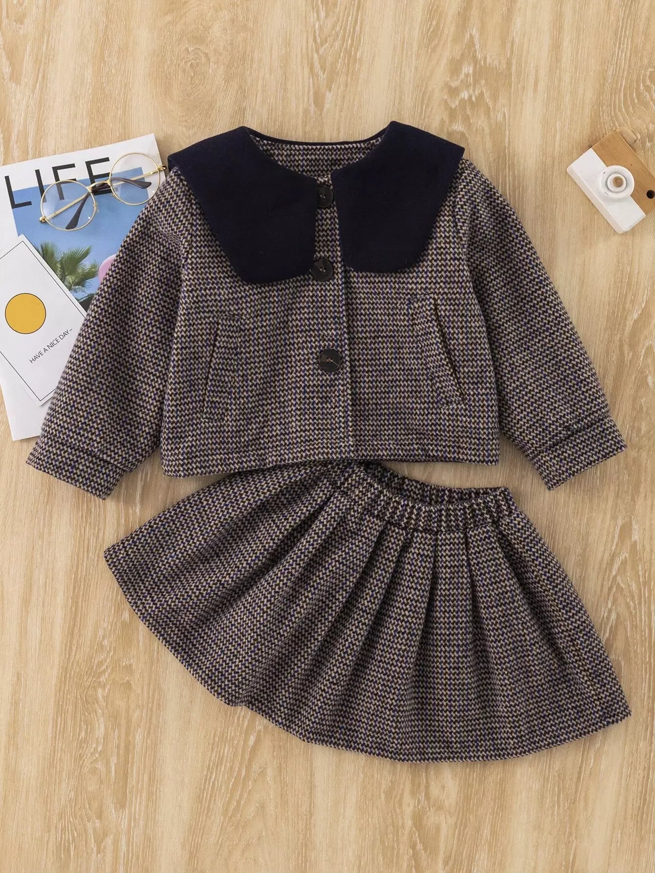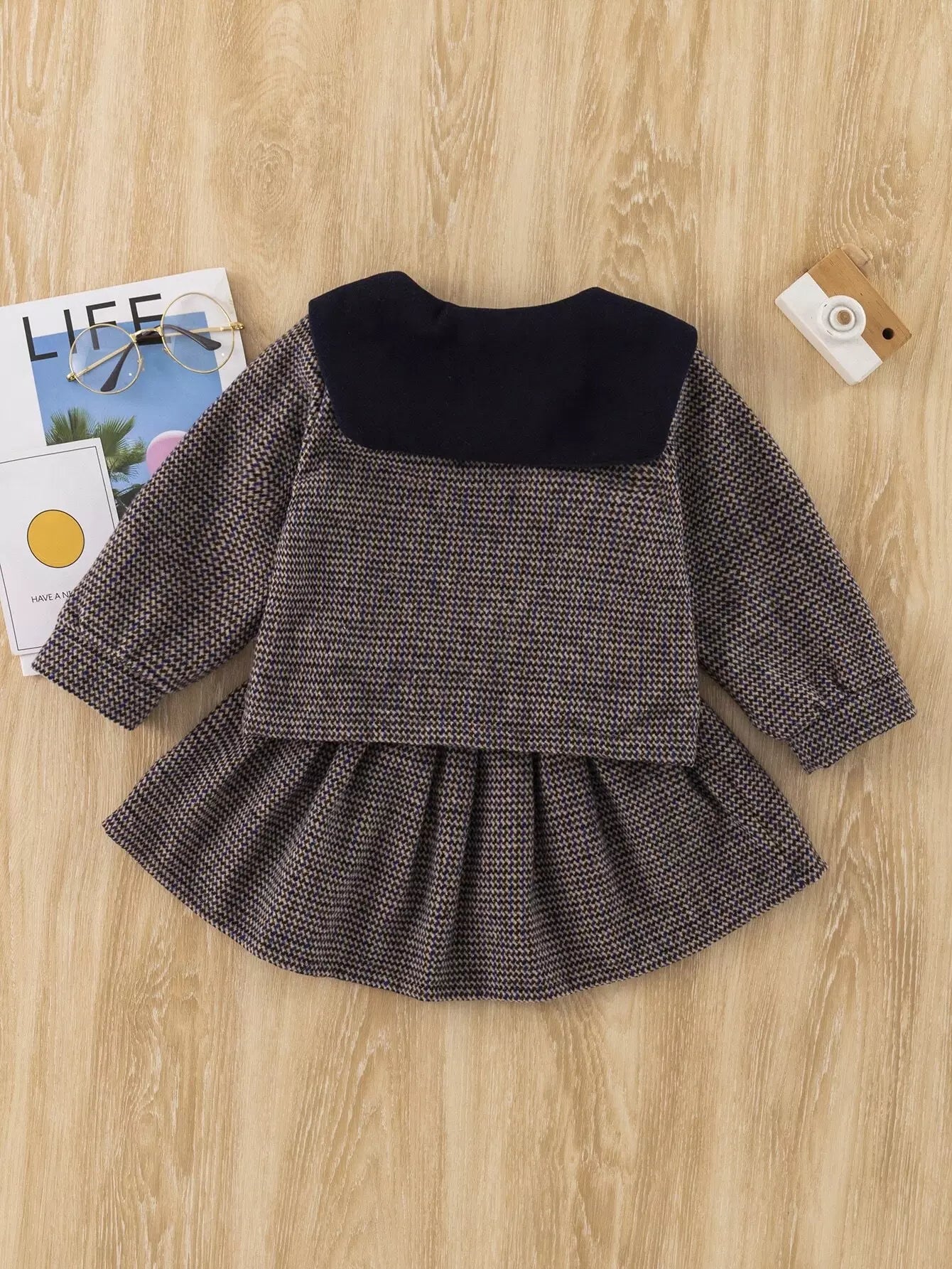 جاكيت وتنورة صوف منقوشة بياقة بحار للبنات الصغار