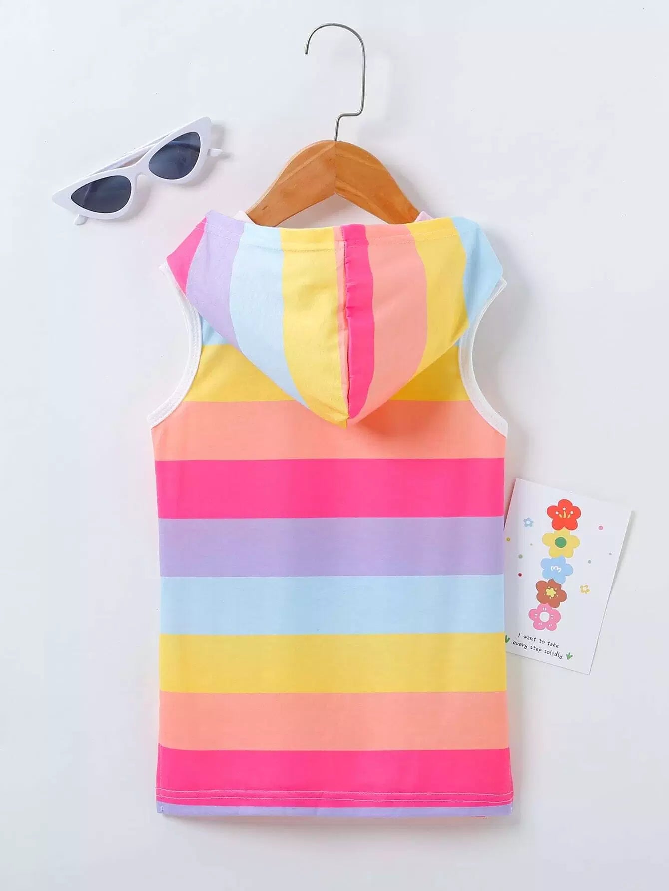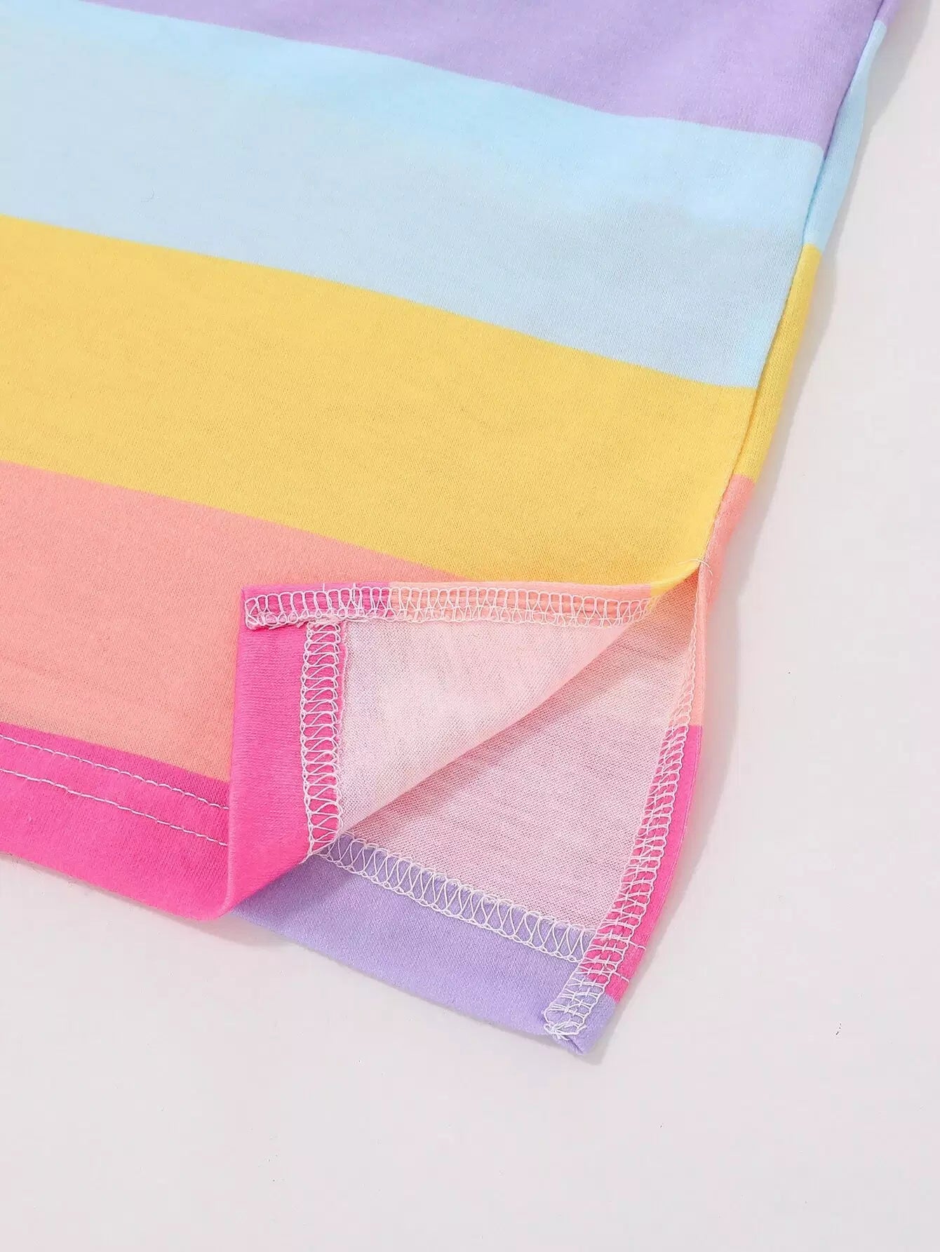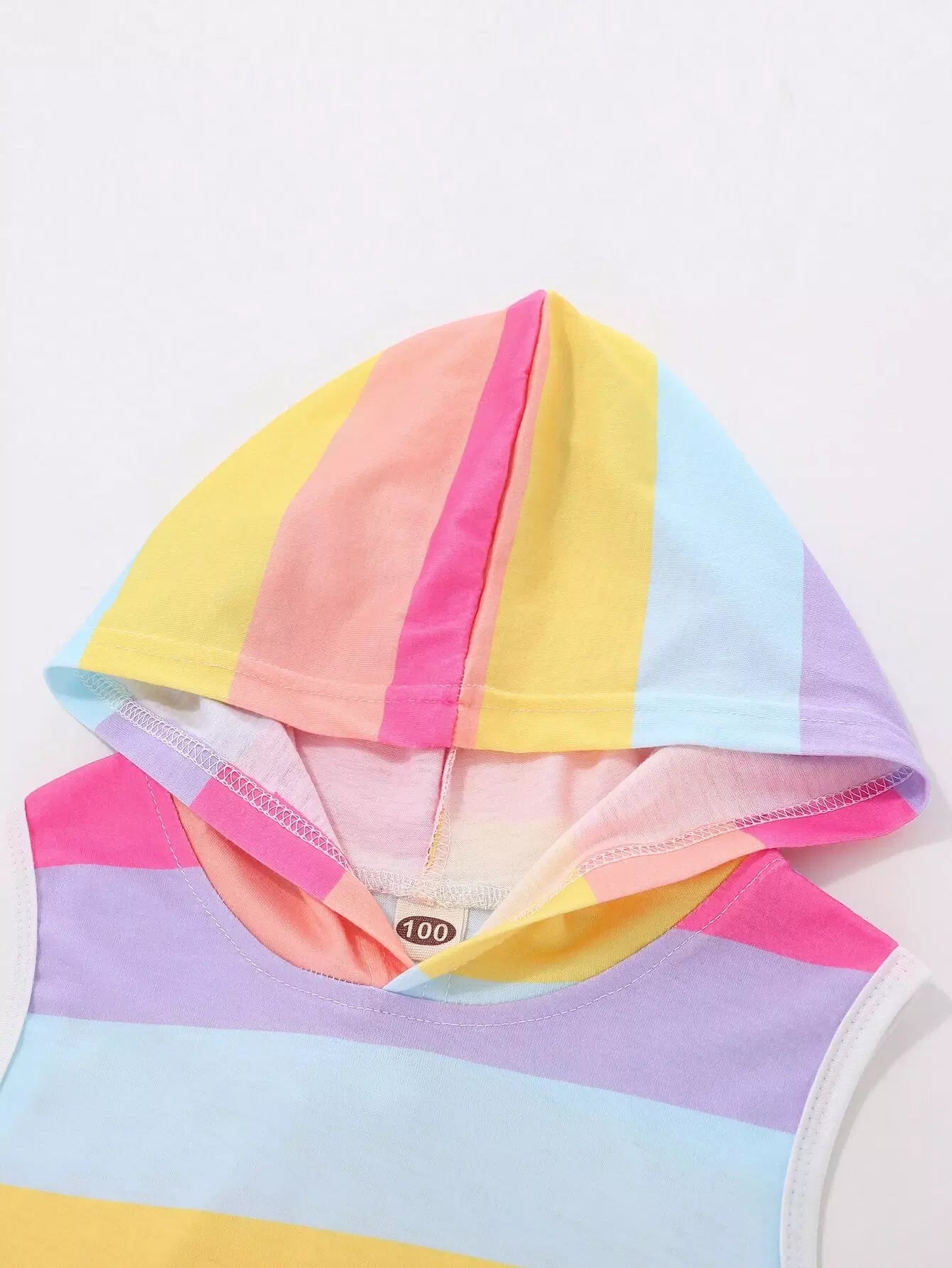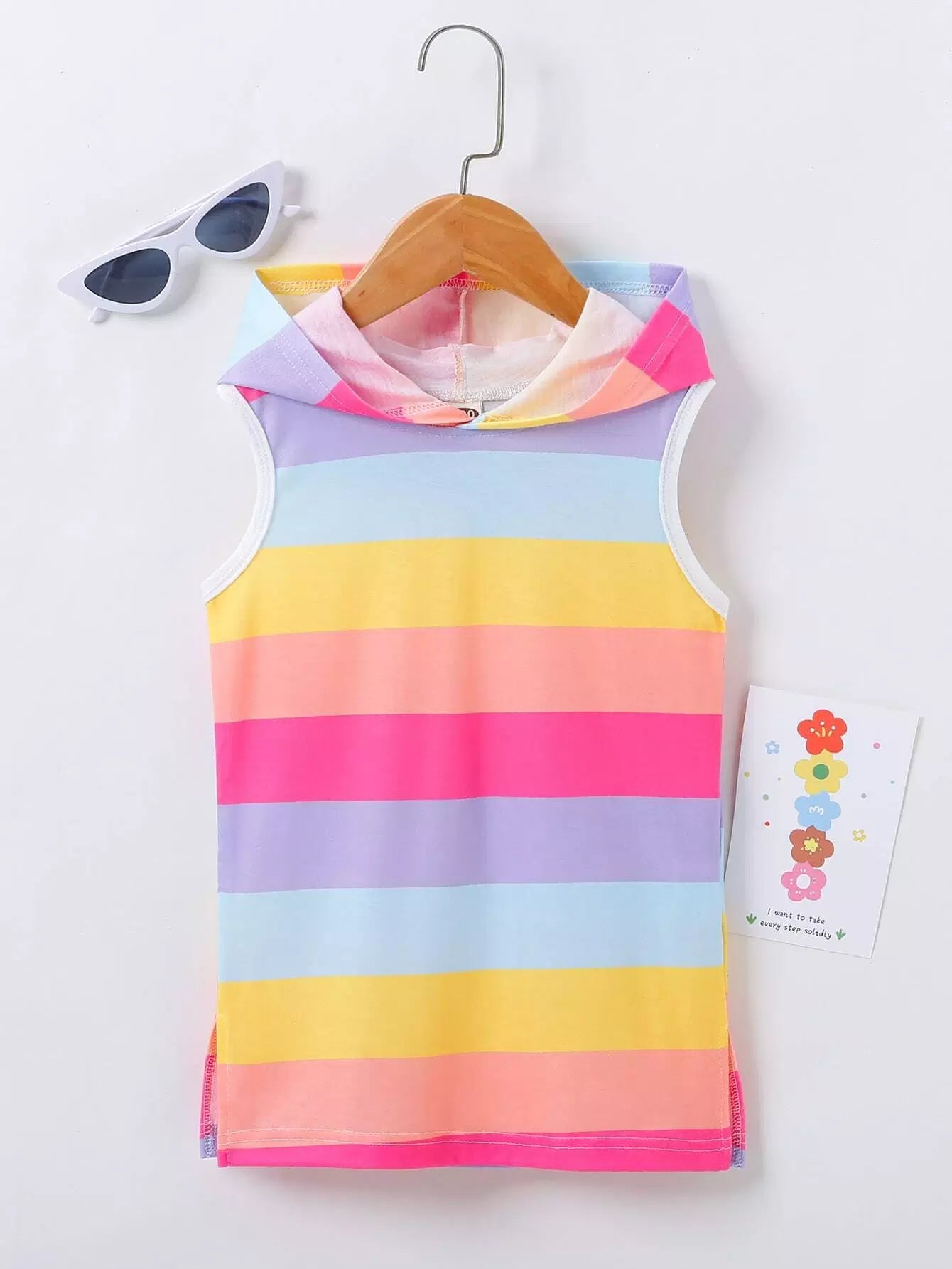 فستان بنات صغيرات مخطط بألوان قوس قزح بغطاء رأس مخطط بألوان قوس قزح ومزخرف بحواف متباينة