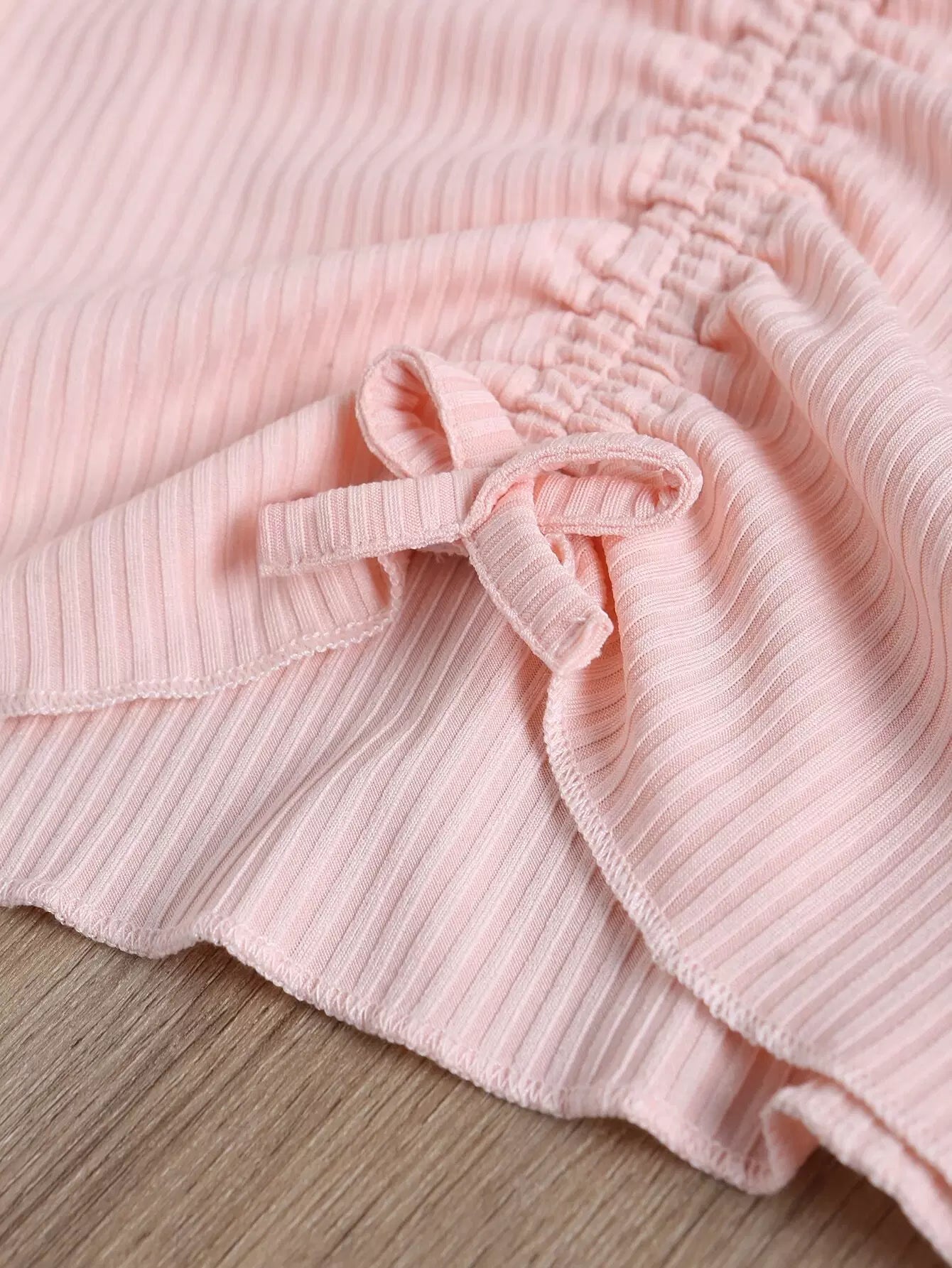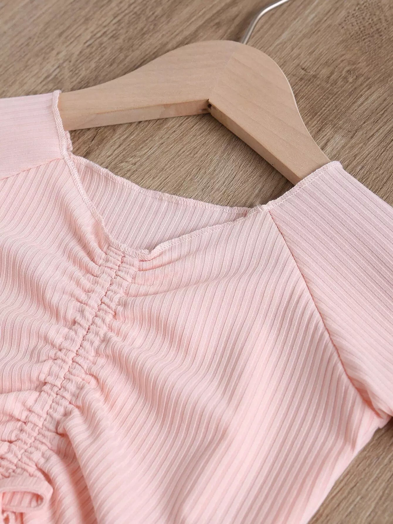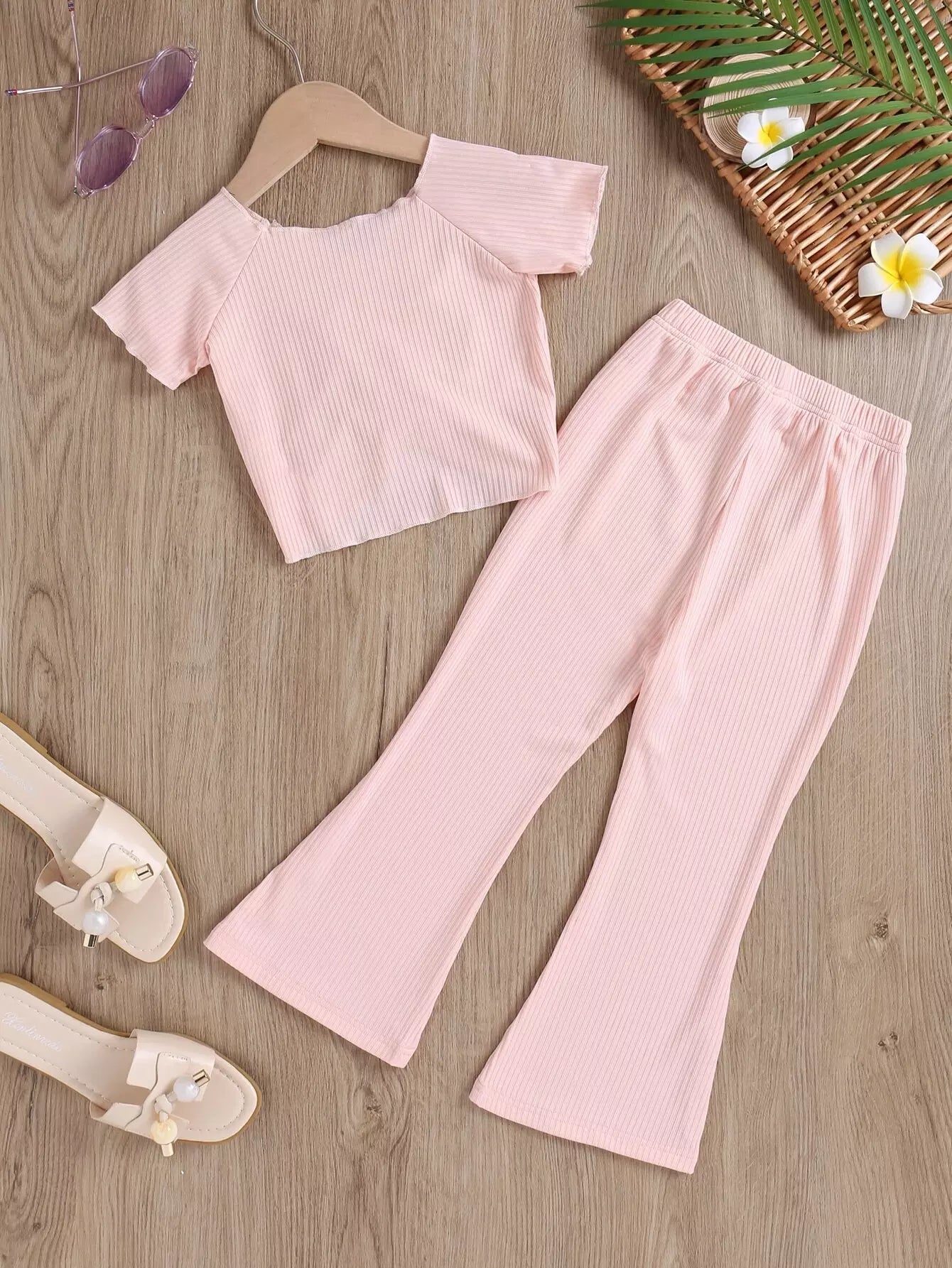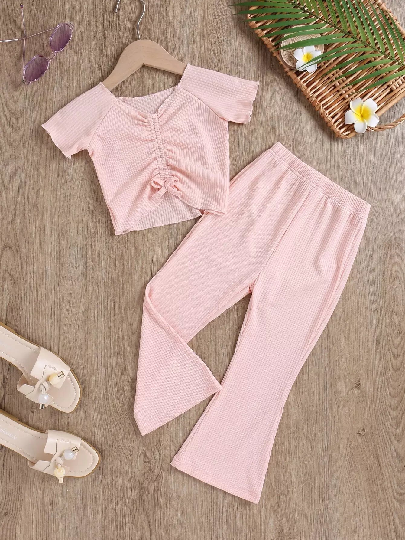 تي شيرت بفيونكة أمامية مجعدة مع بنطلون واسع الساق للفتيات الصغيرات